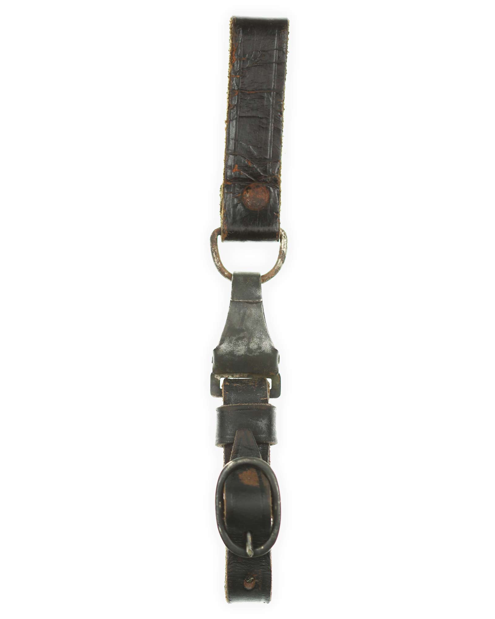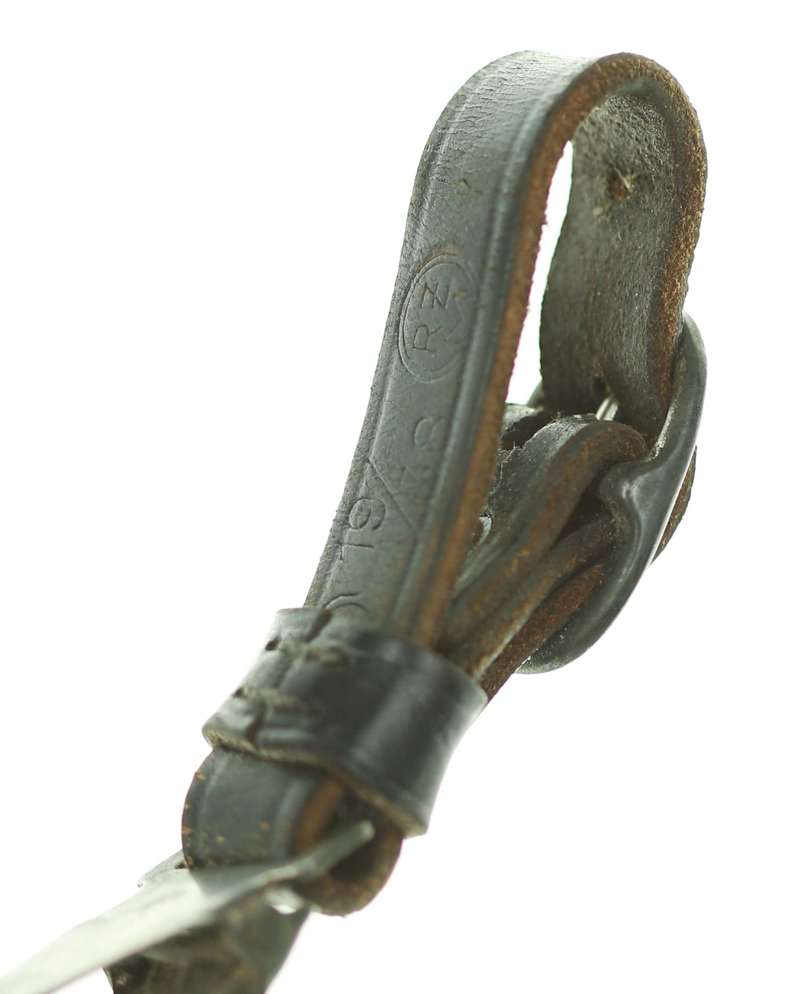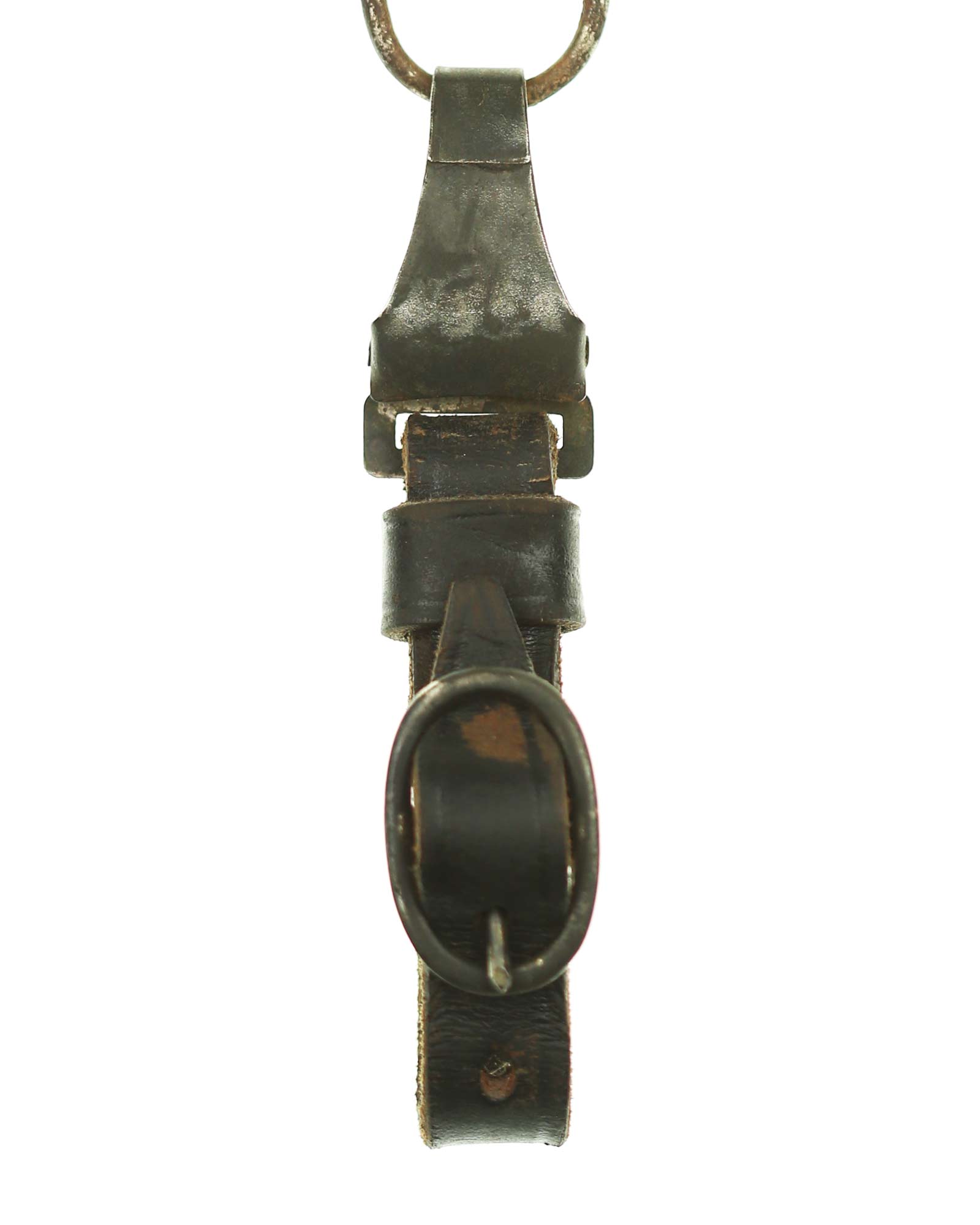 Черная кожаная подвеска для служебного кинжала СС с изготовителем. Карабин с клеймом Assmann и DRGM, сама кожа имеет маркировку SS 19/38 RZM.
