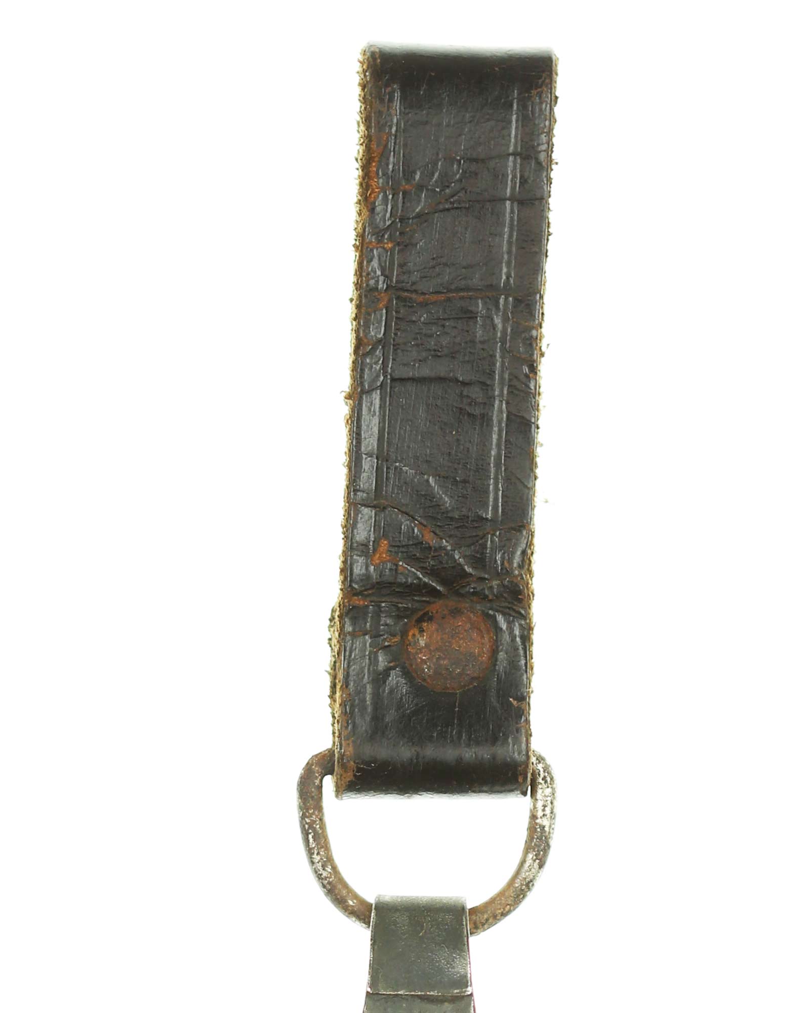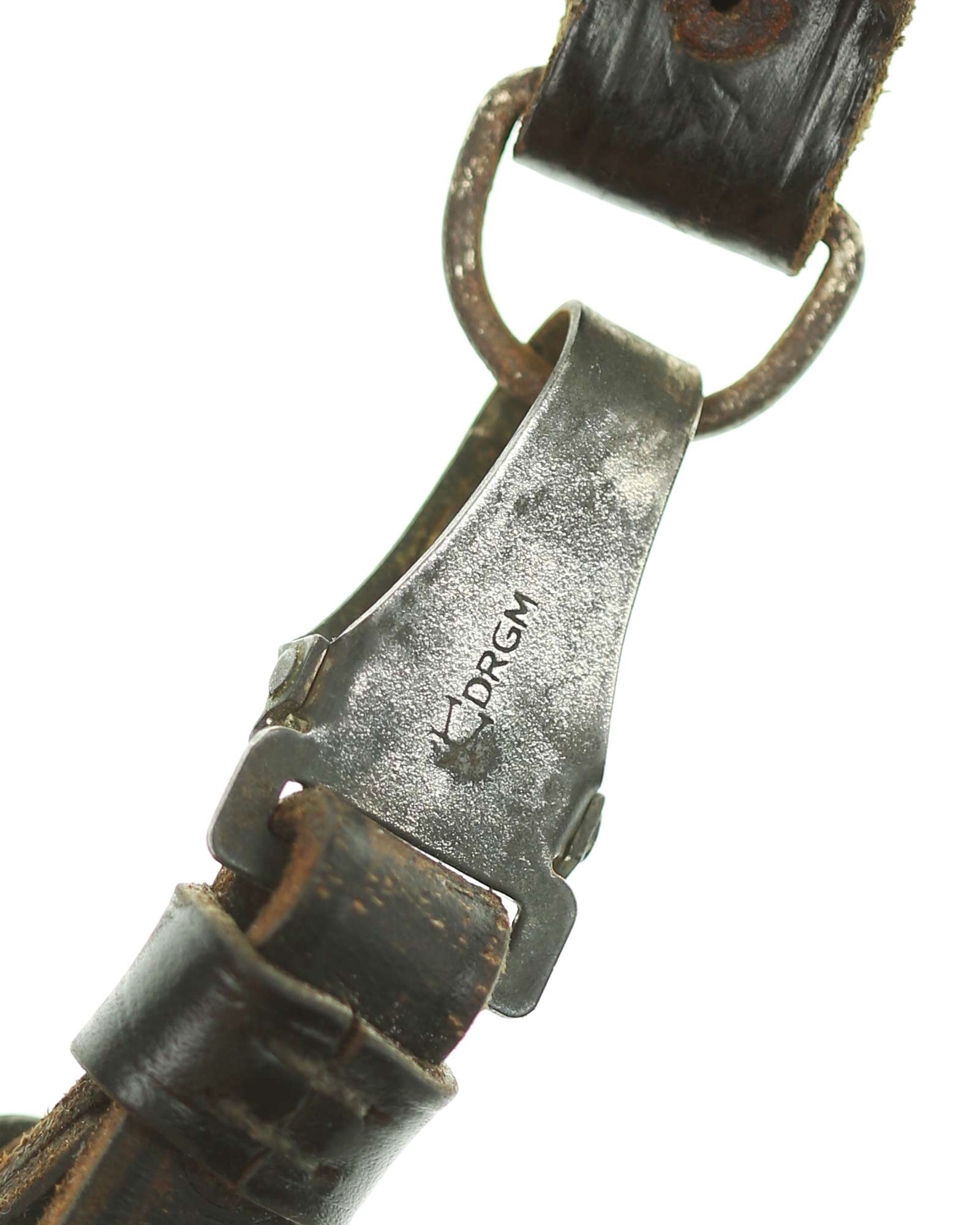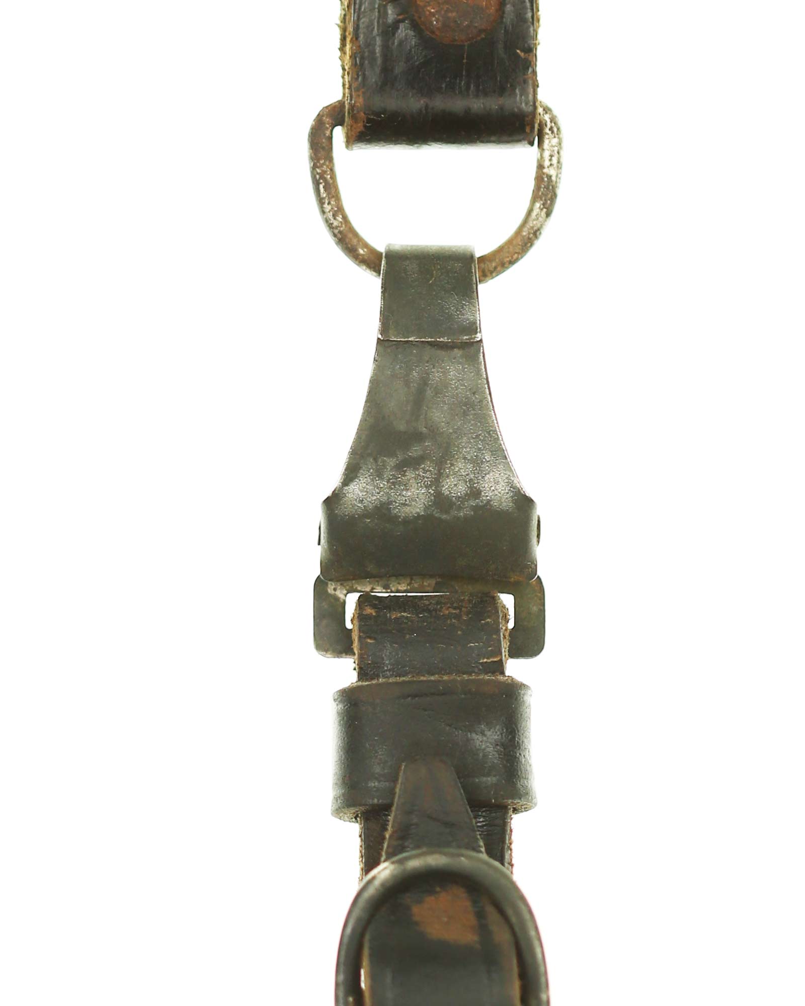 Черная кожаная подвеска для служебного кинжала СС с изготовителем. Карабин с клеймом Assmann и DRGM, сама кожа имеет маркировку SS 19/38 RZM.