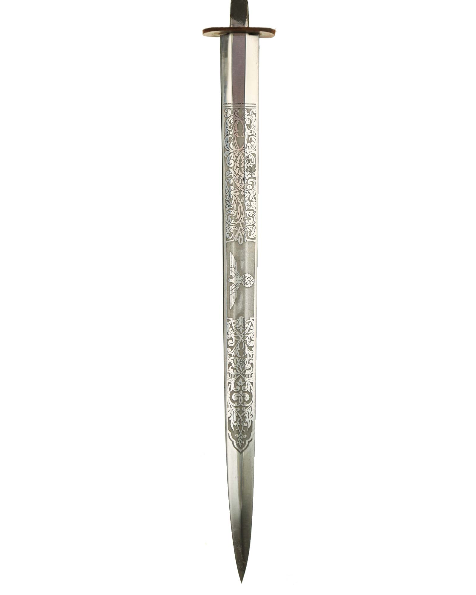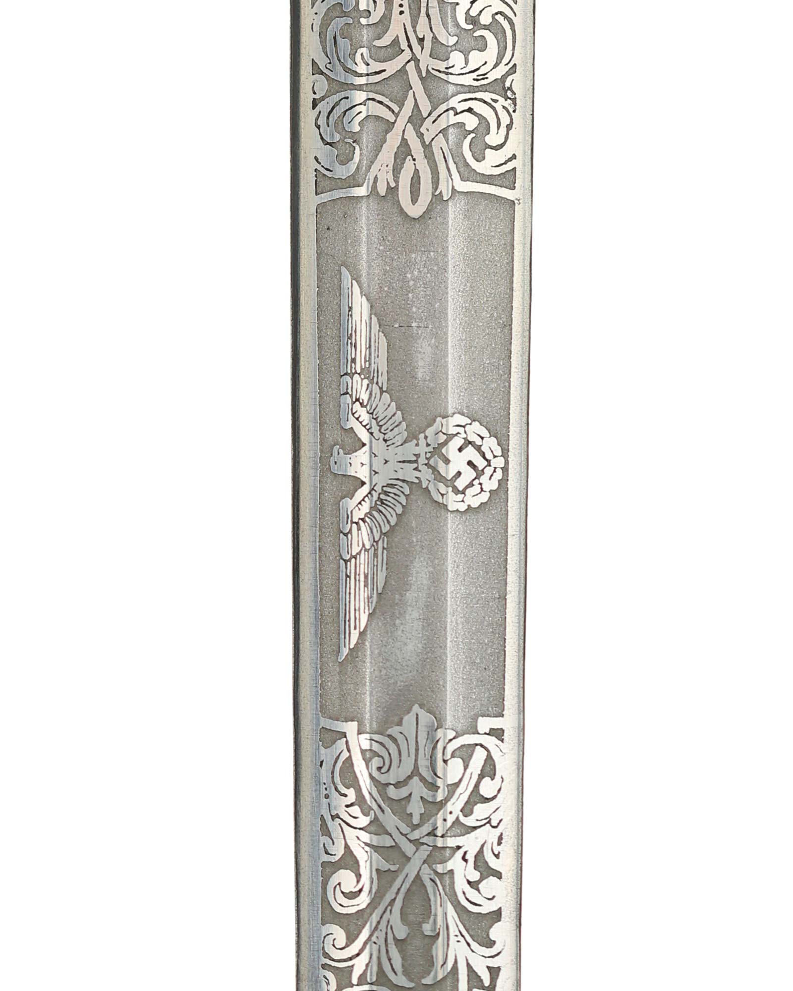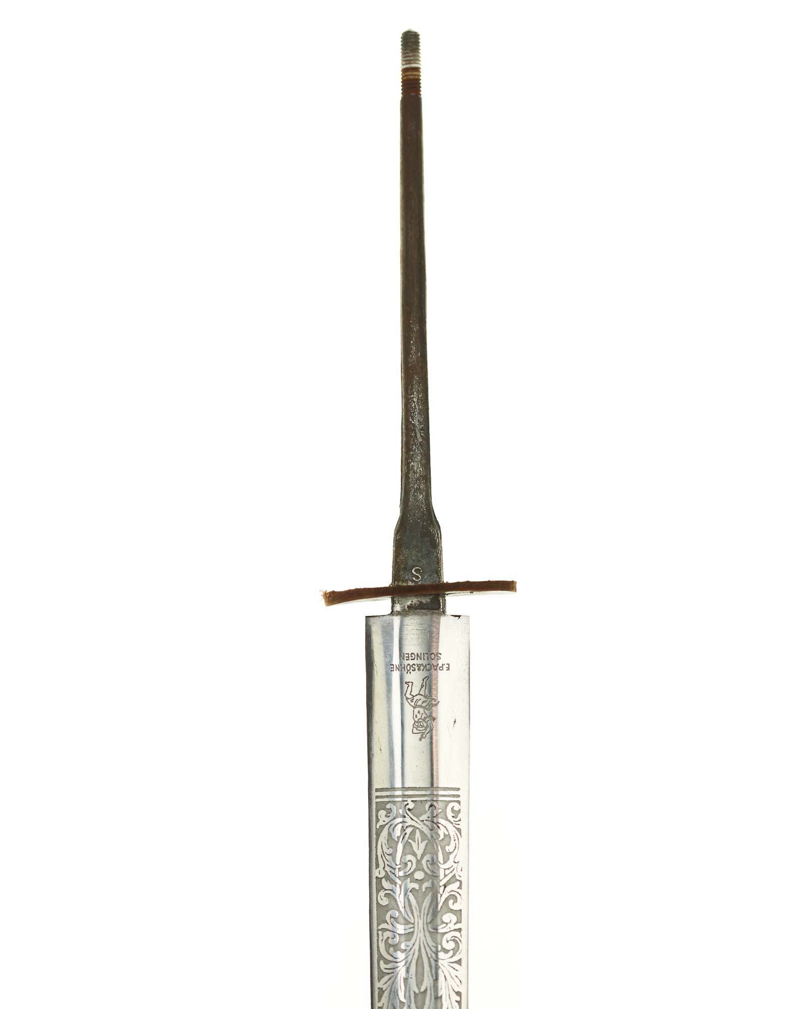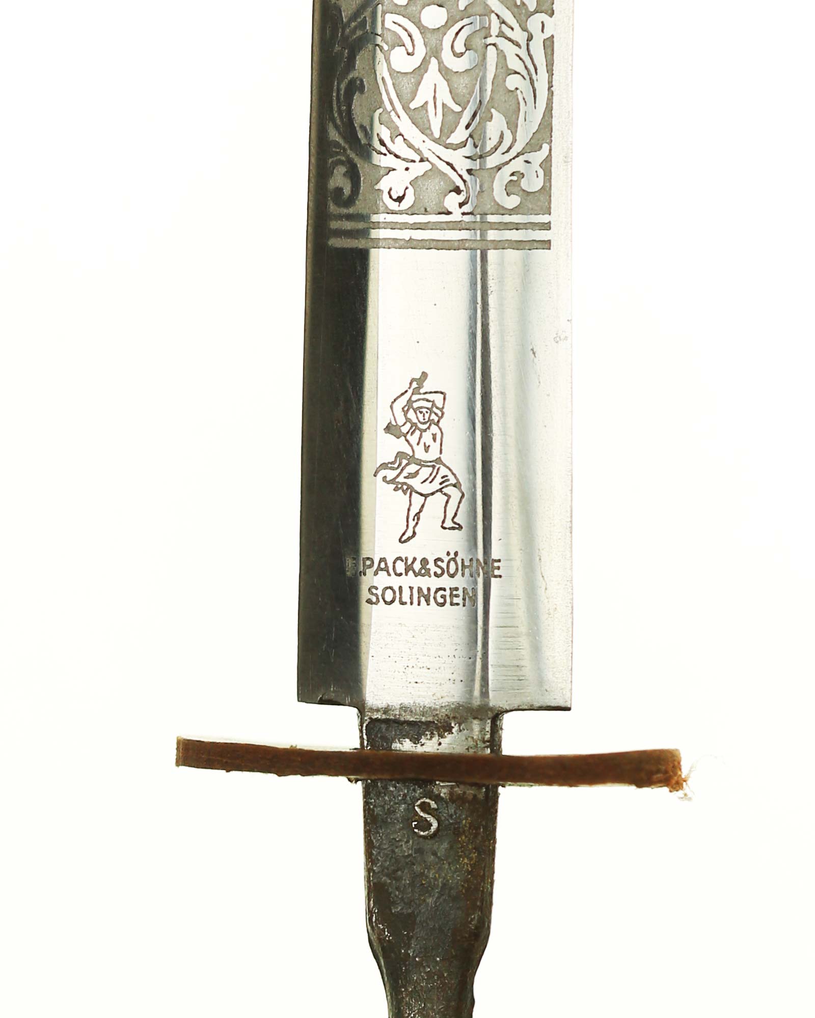Клинок обоюдоострый с декоративным травлением. На спине логотип производителя: Ernst Pack & Söhne Solingen. Это отличный музейный и коллекционный предмет. Ширина лезвия до 19 мм., длина лезвия 258 мм, общая длина 365 мм.