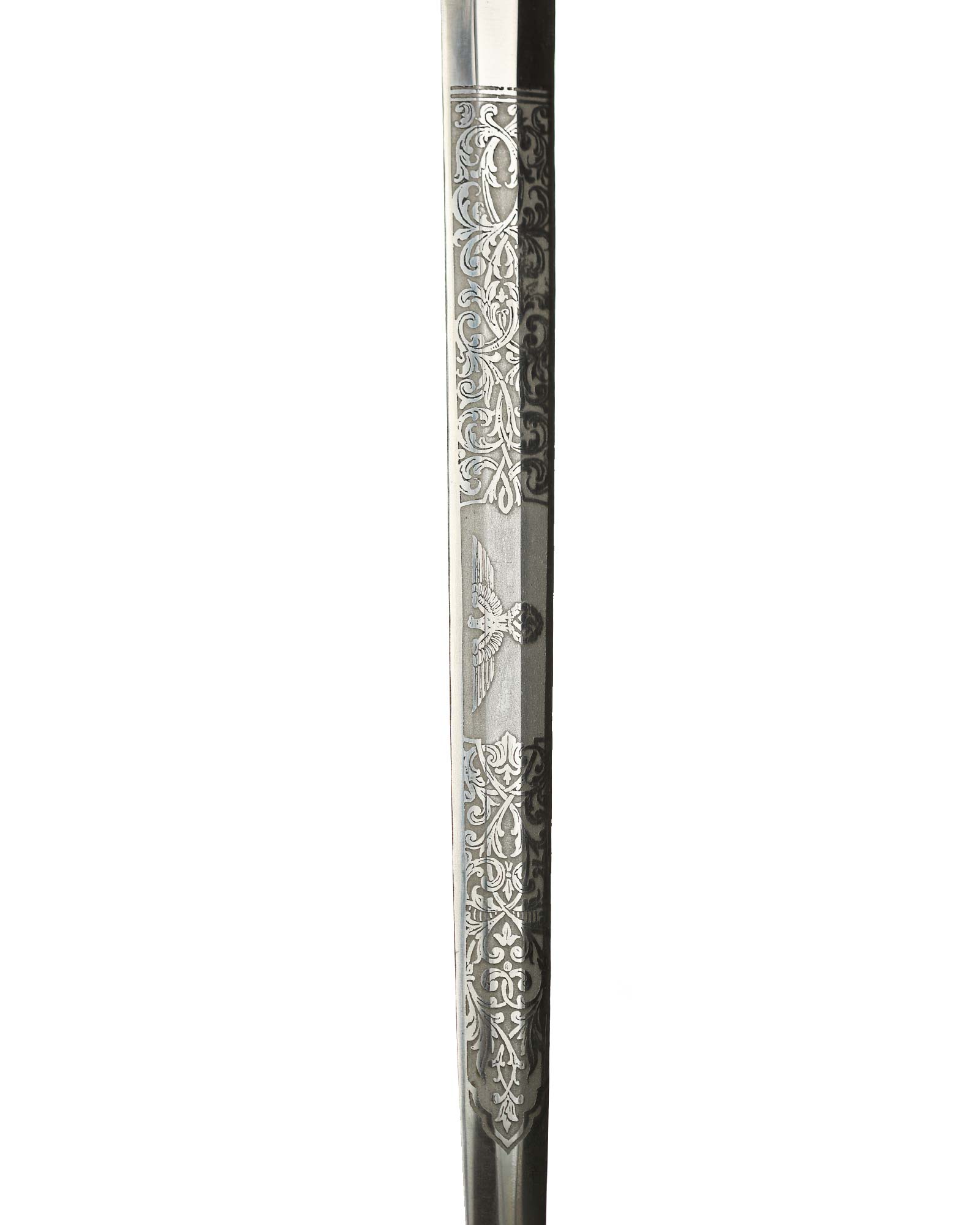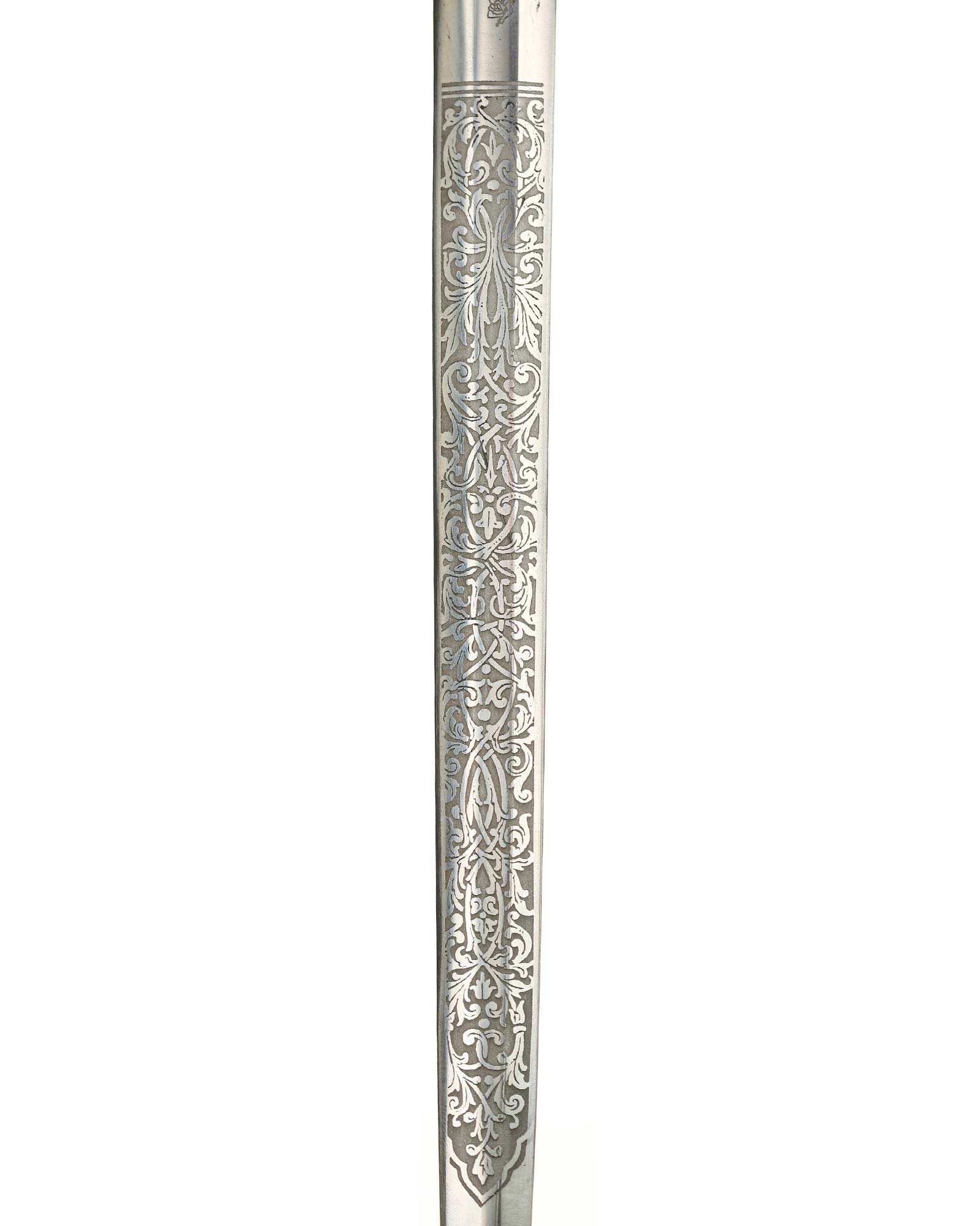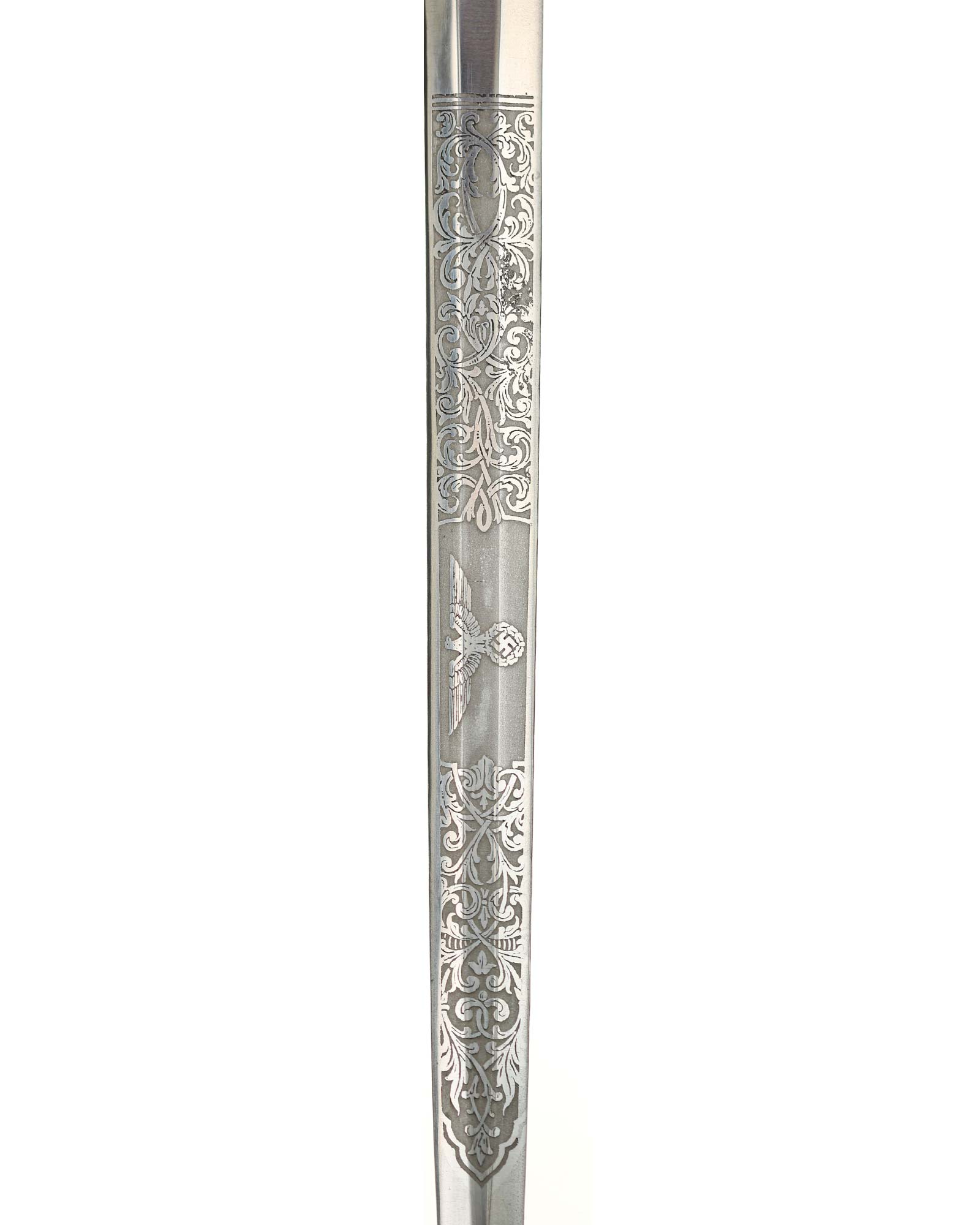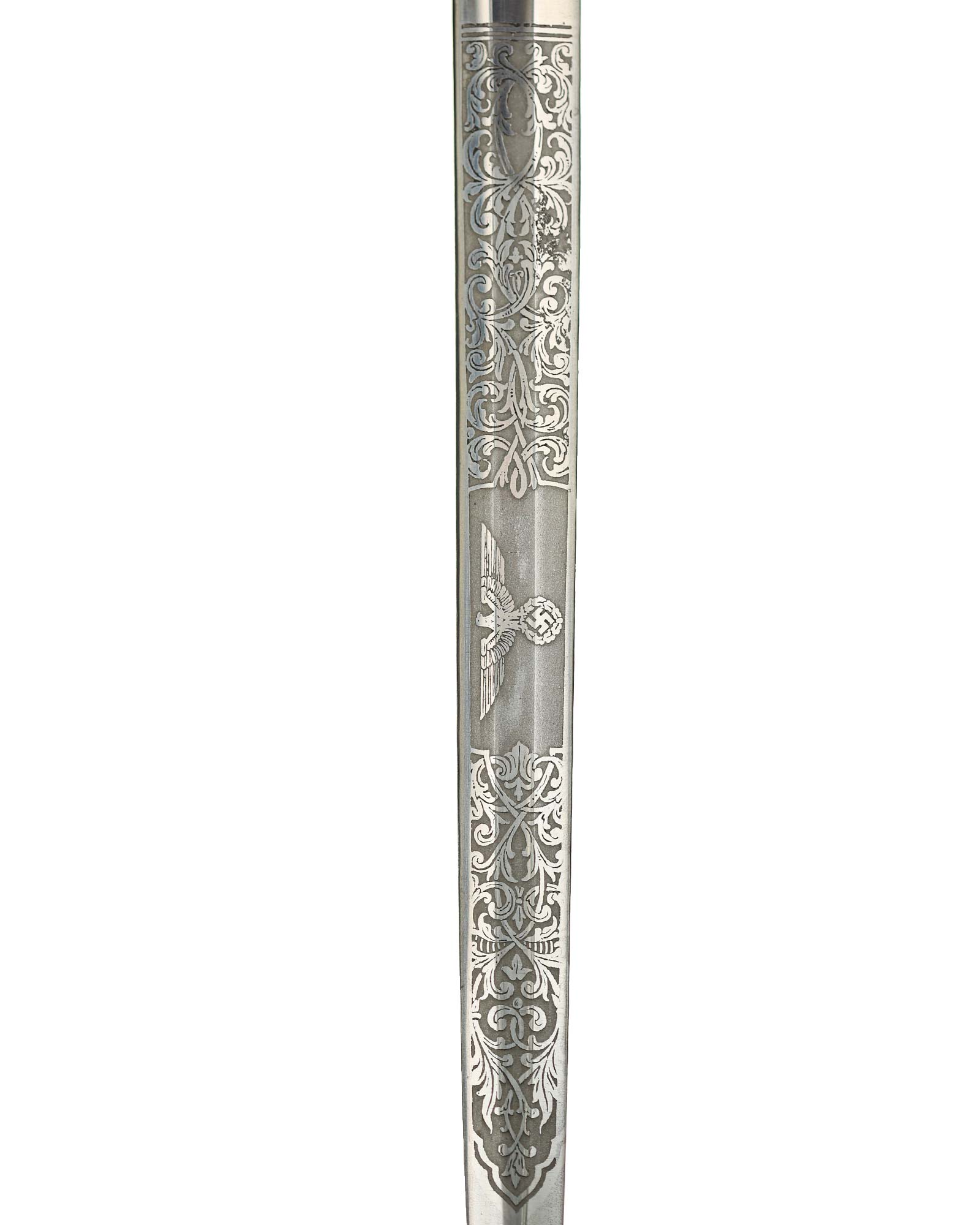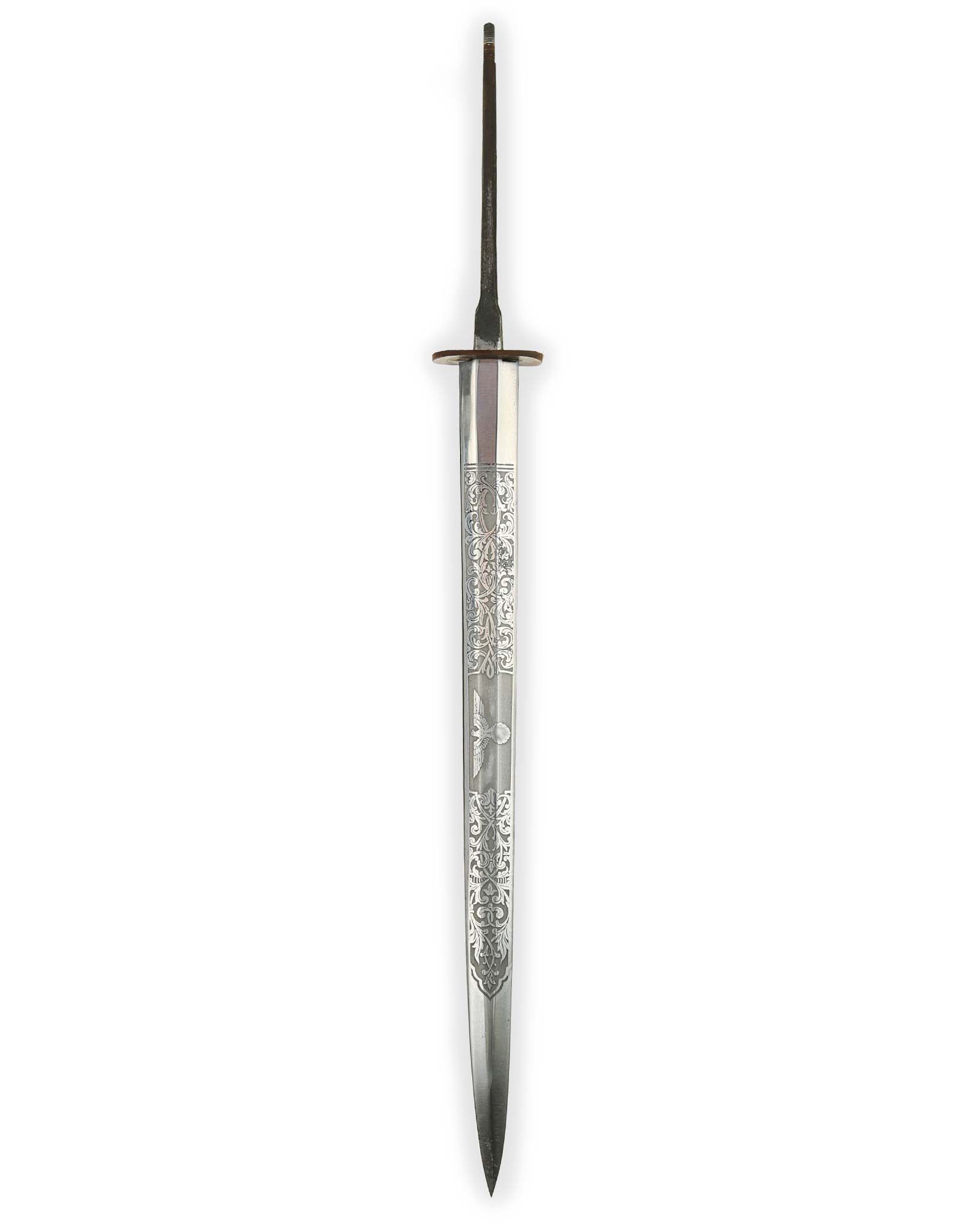 Клинок обоюдоострый с декоративным травлением. На спине логотип производителя: Ernst Pack & Söhne Solingen. Это отличный музейный и коллекционный предмет. Ширина лезвия до 19 мм., длина лезвия 258 мм, общая длина 365 мм.