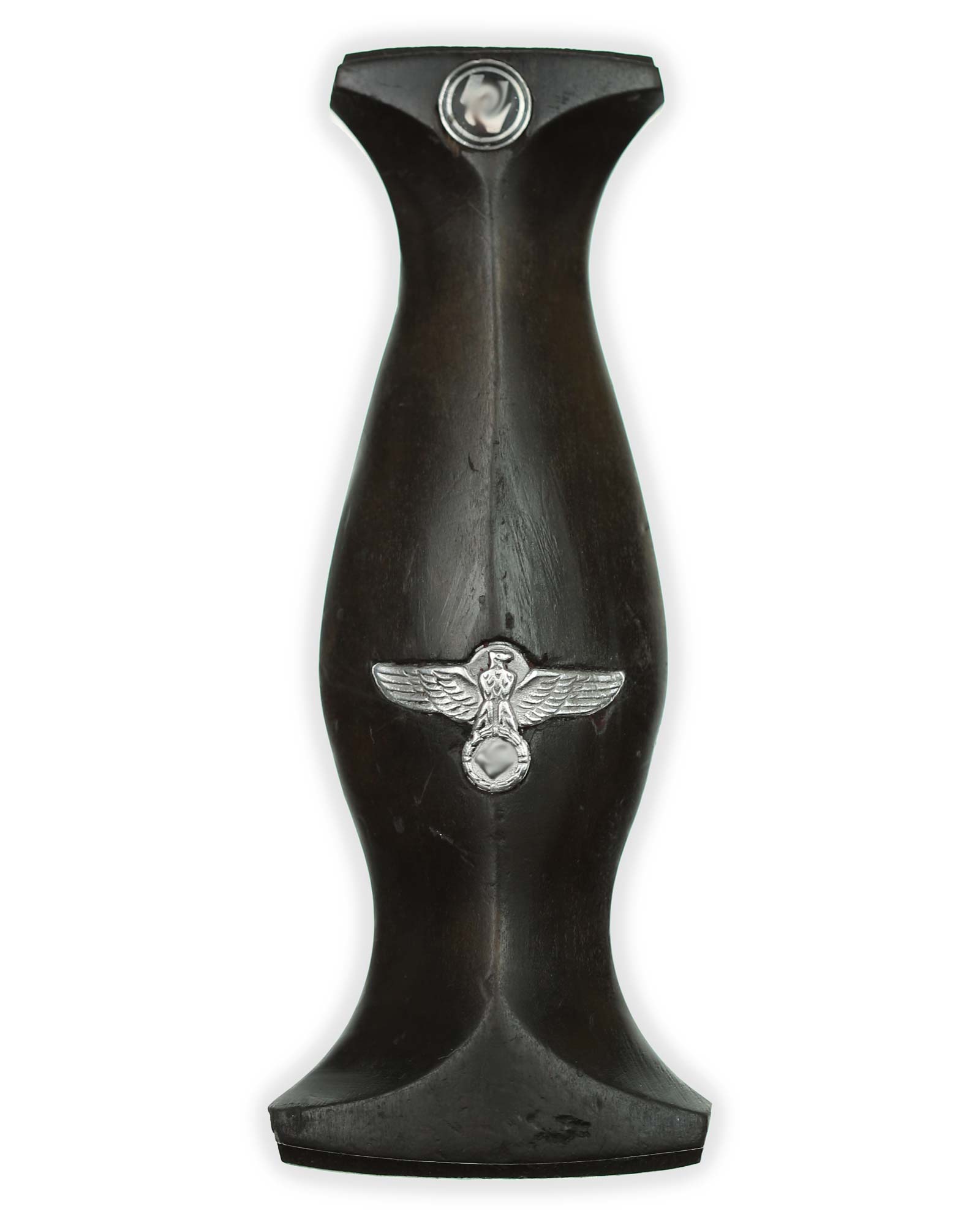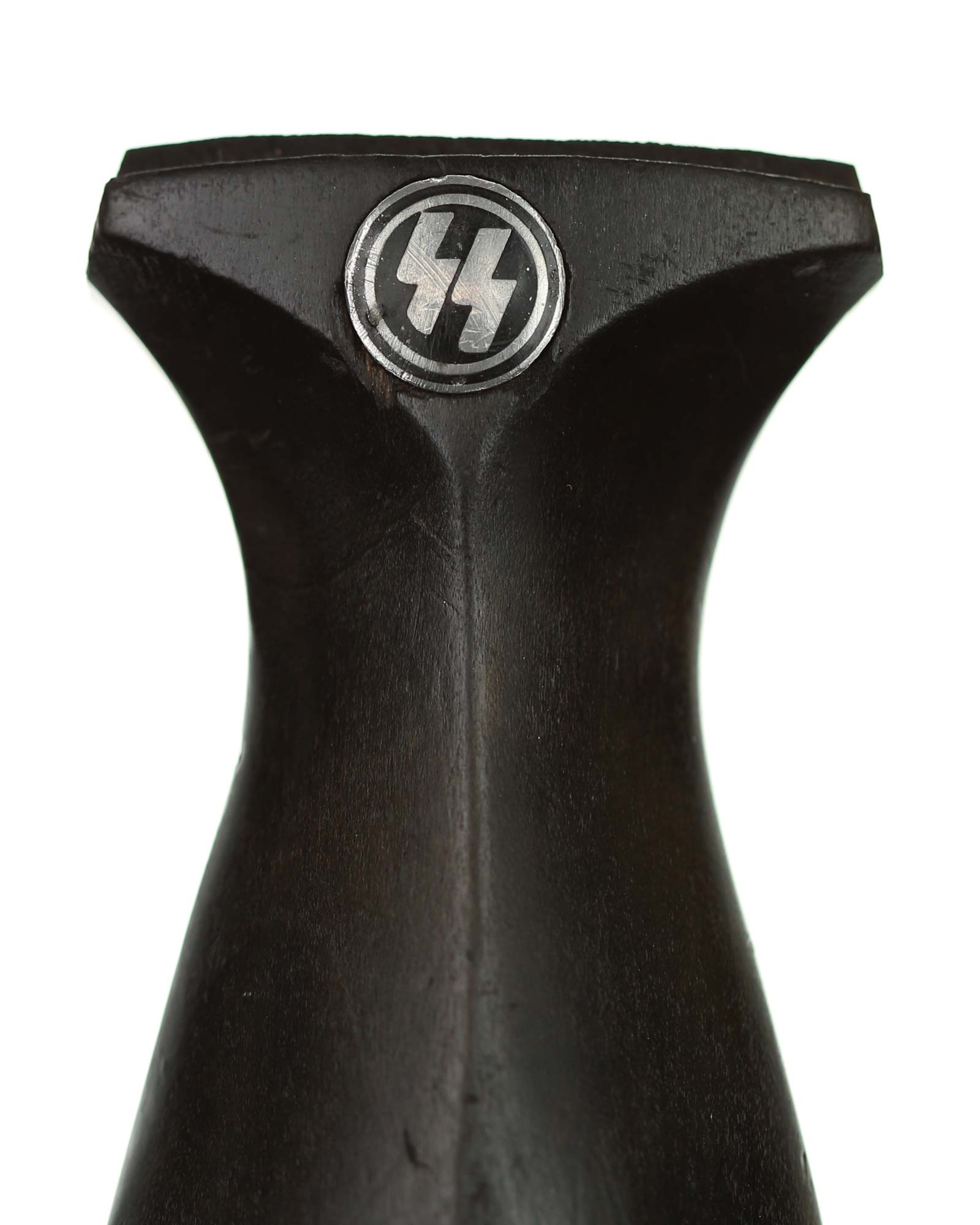 Рукоять из мореного в черный цвет дерева. Рукоять в верхней части имеет вставку в виде черного эмалевого глазка с рунами, в средней части – вставка в виде орла СС.