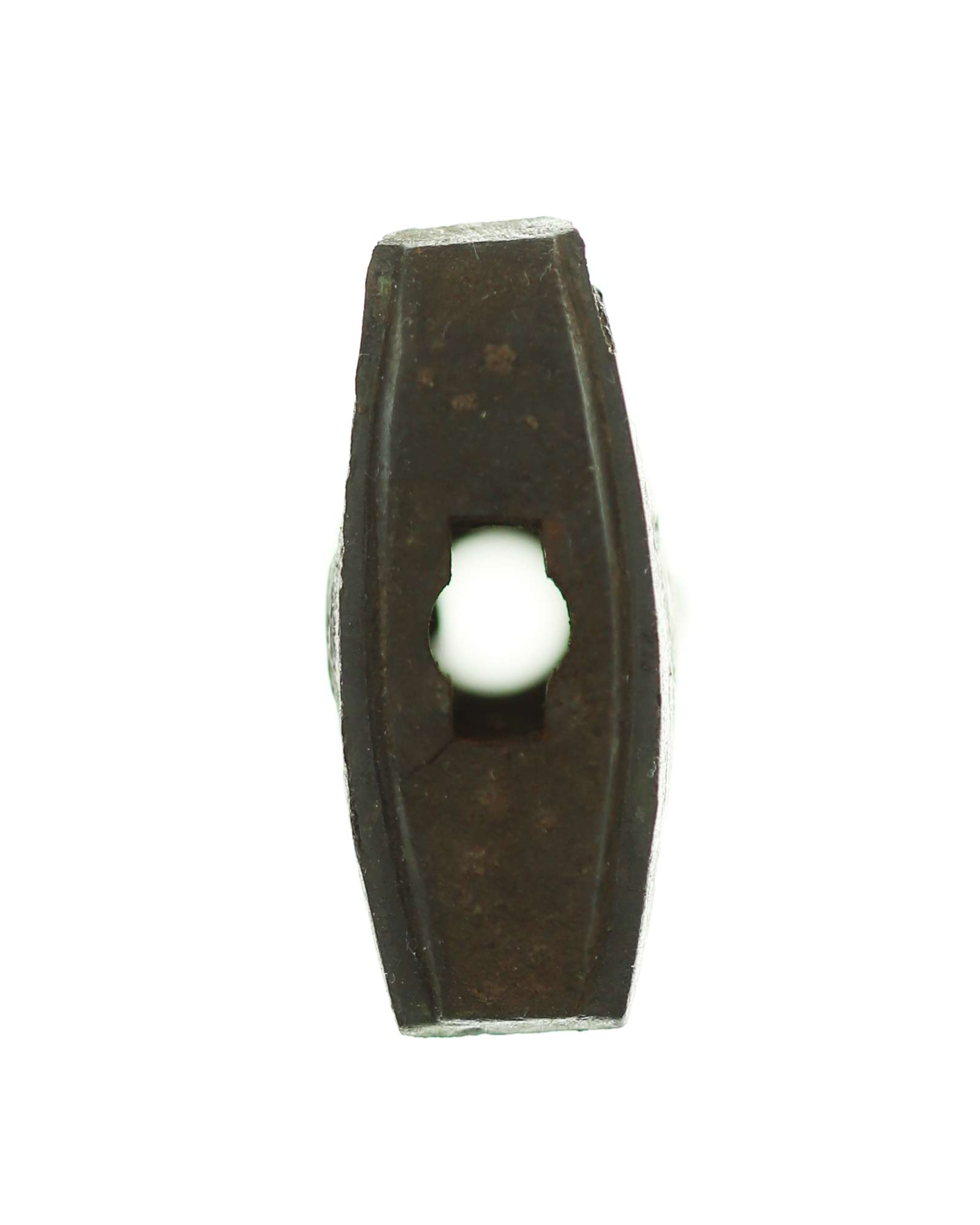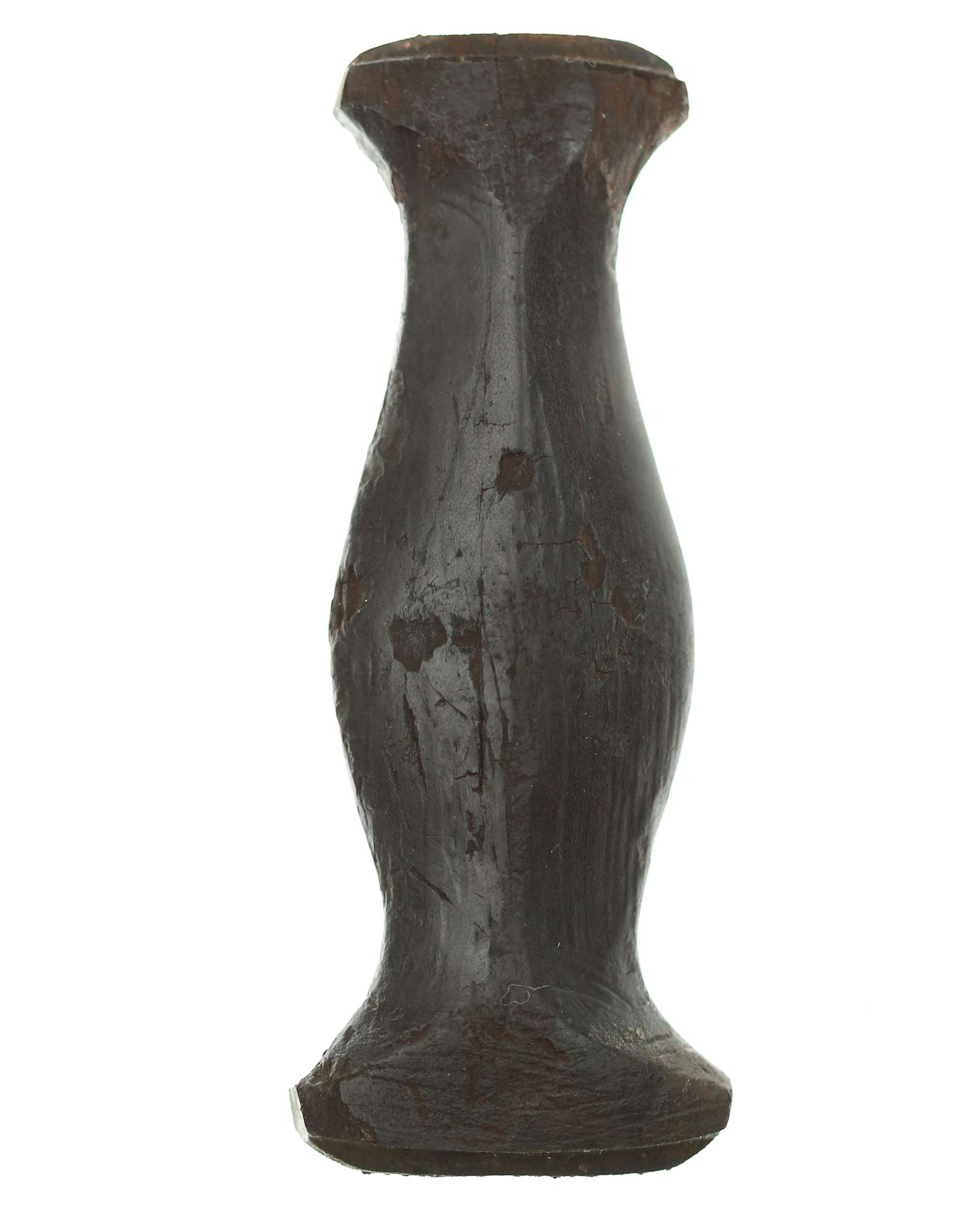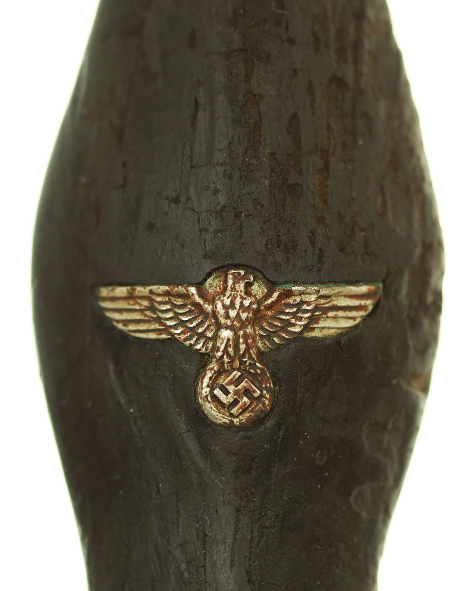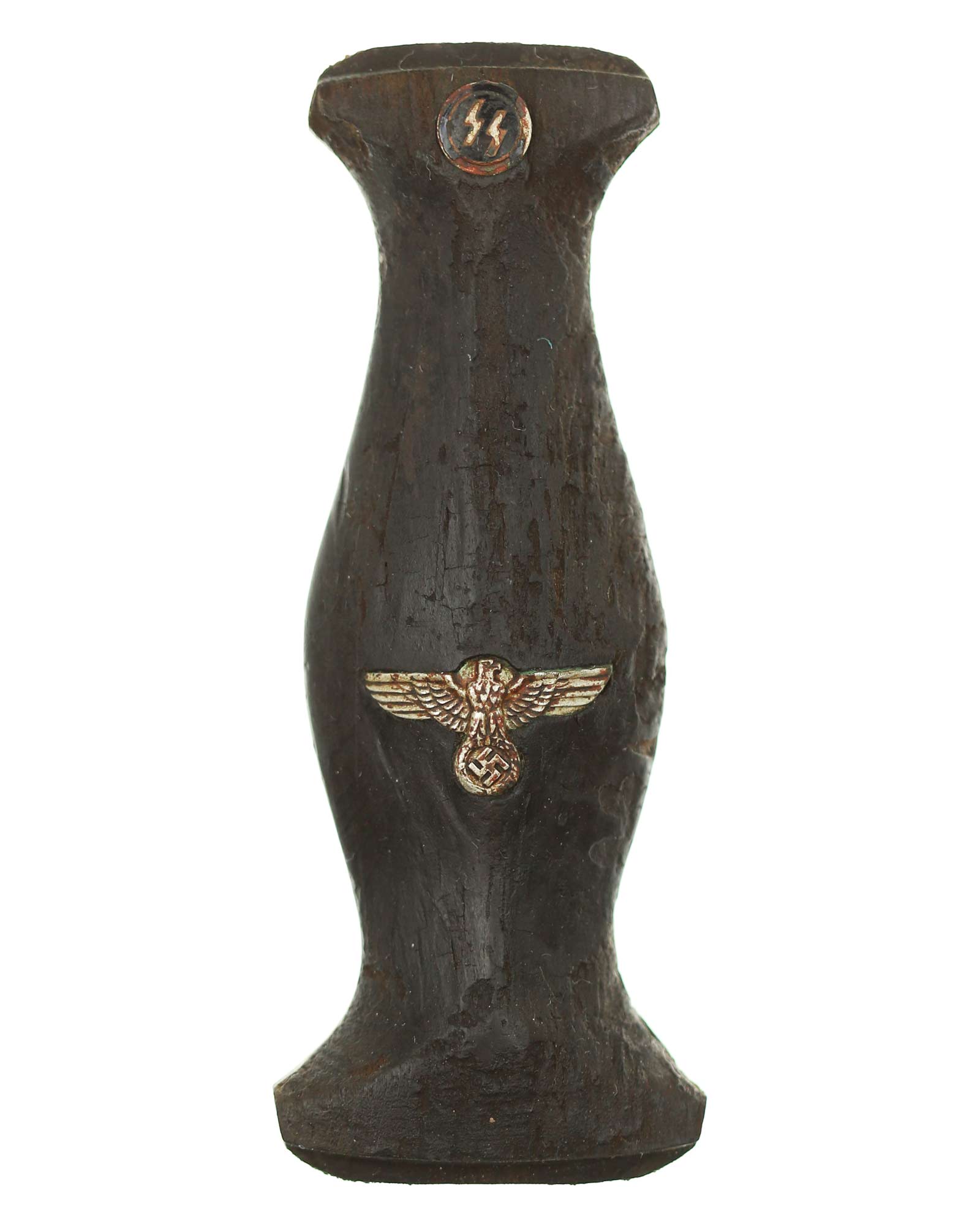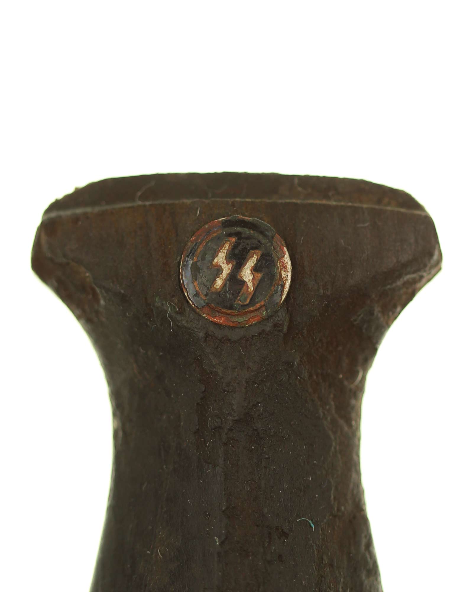 Рукоять из мореного в черный цвет дерева. Рукоять в верхней части имеет вставку в виде черного эмалевого глазка с рунами, в средней части – вставка в виде орла СС.