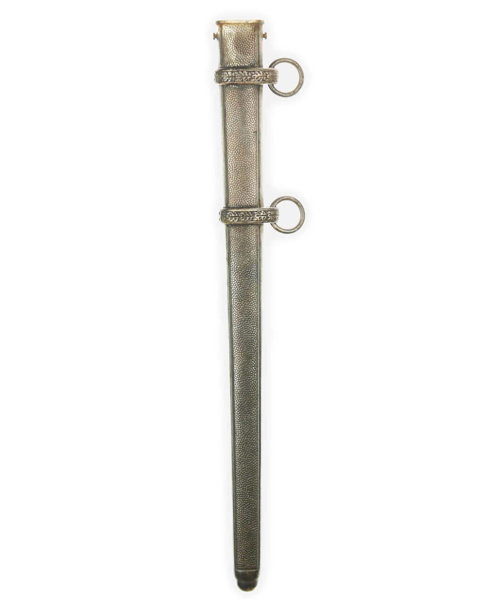 Ножны металлические, имеющие с внешней и внутренней стороны мелкоточечную рифленую поверхность в линейной окантовке; прибор состоит из вставного устья; наконечник ножен выполнен в виде полуовала. Обоймицы (гайки) украшены рельефными изображениями дубовых листьев; на каждой обоймице (гайке) подвижно укреплено по одному кольцу. Металлические элементы эфеса и ножны посеребрены.