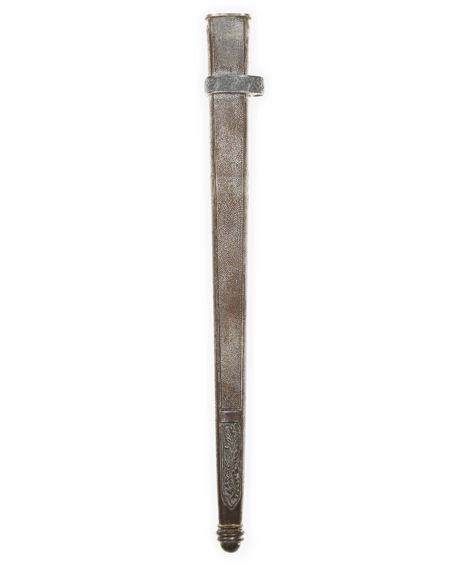 Ножны металлические, цельные, поверхность покрыта мелкими точками. Конец ножен округлый, с тремя рельефными поясками, украшен орнаментом из дубовых листьев.