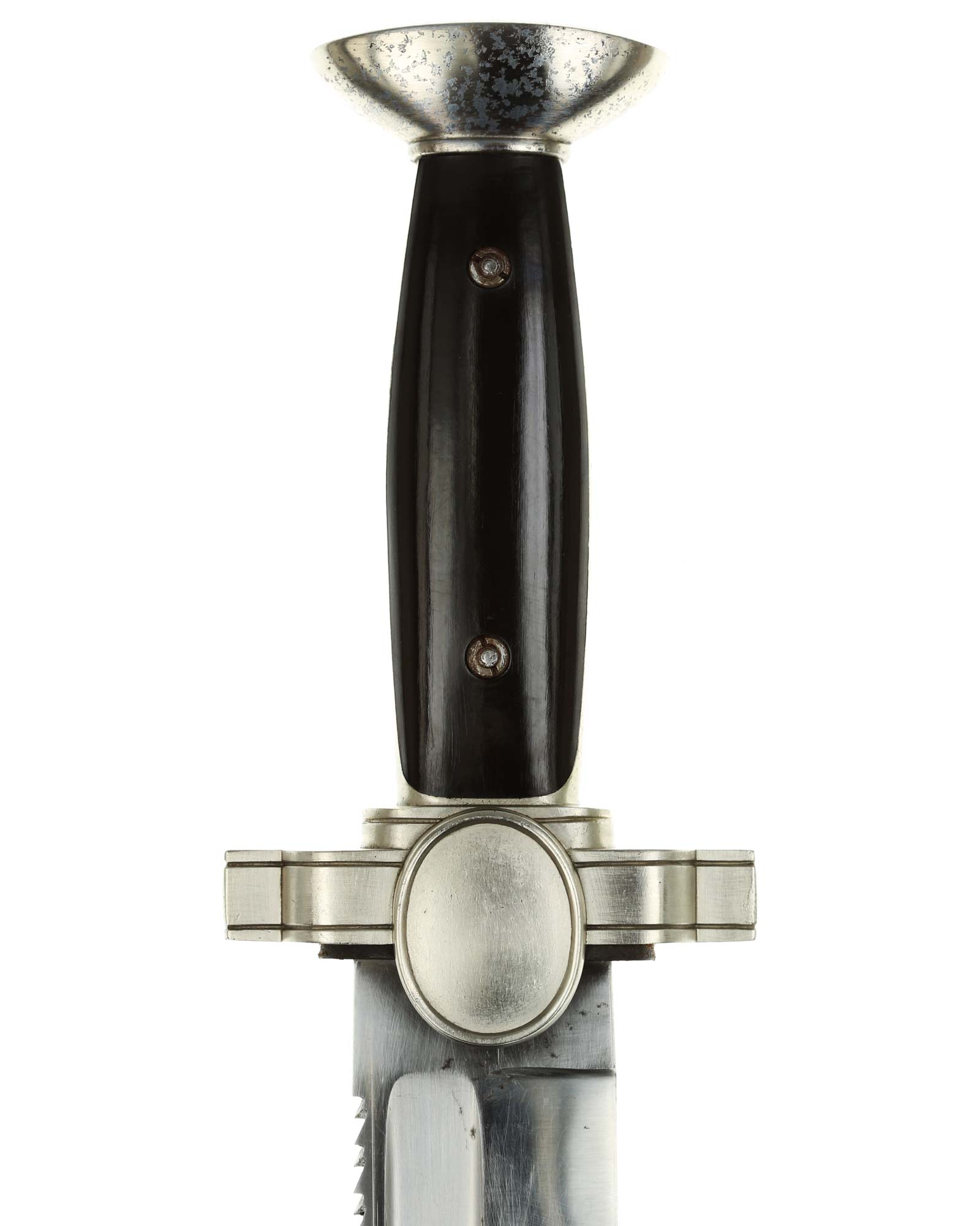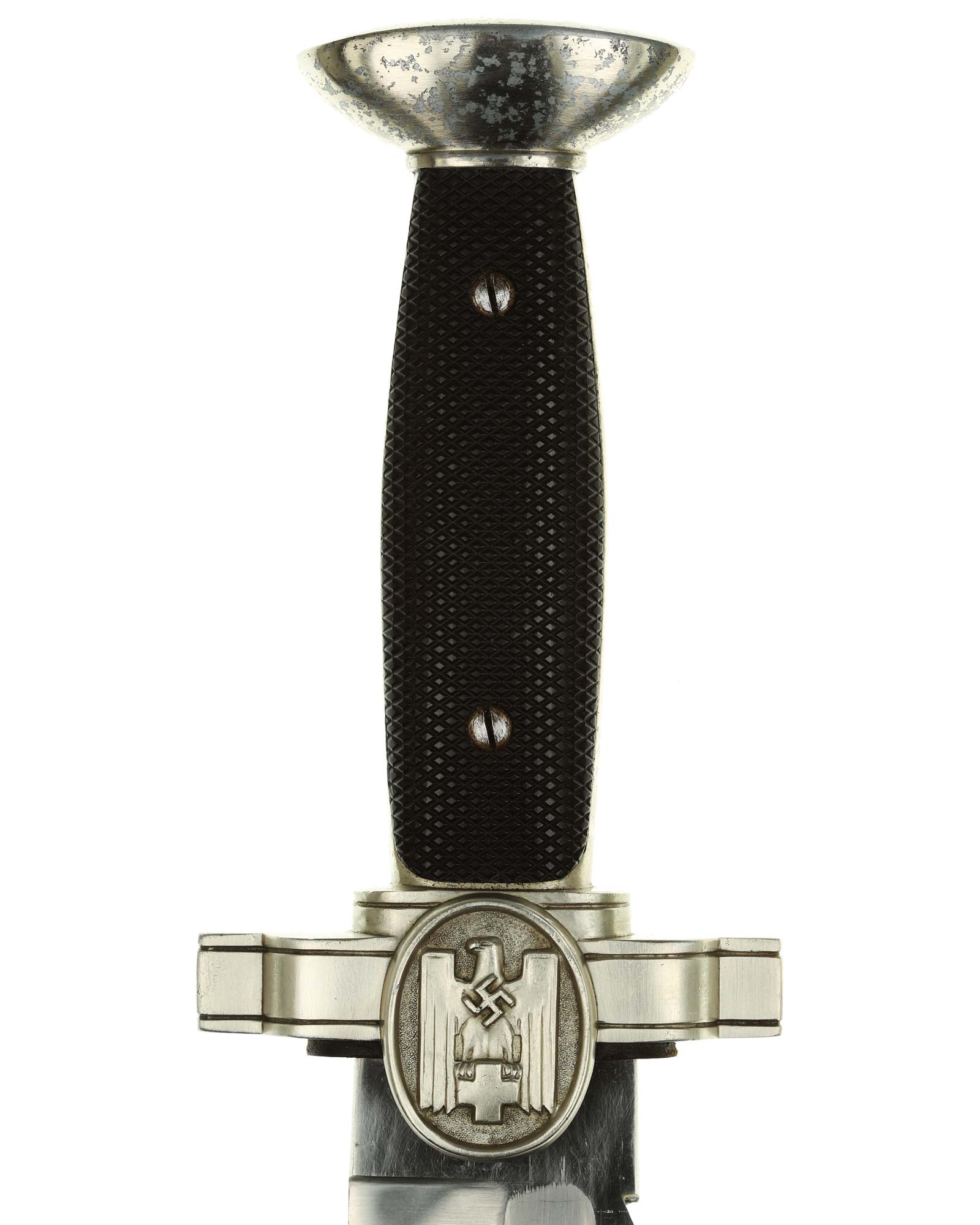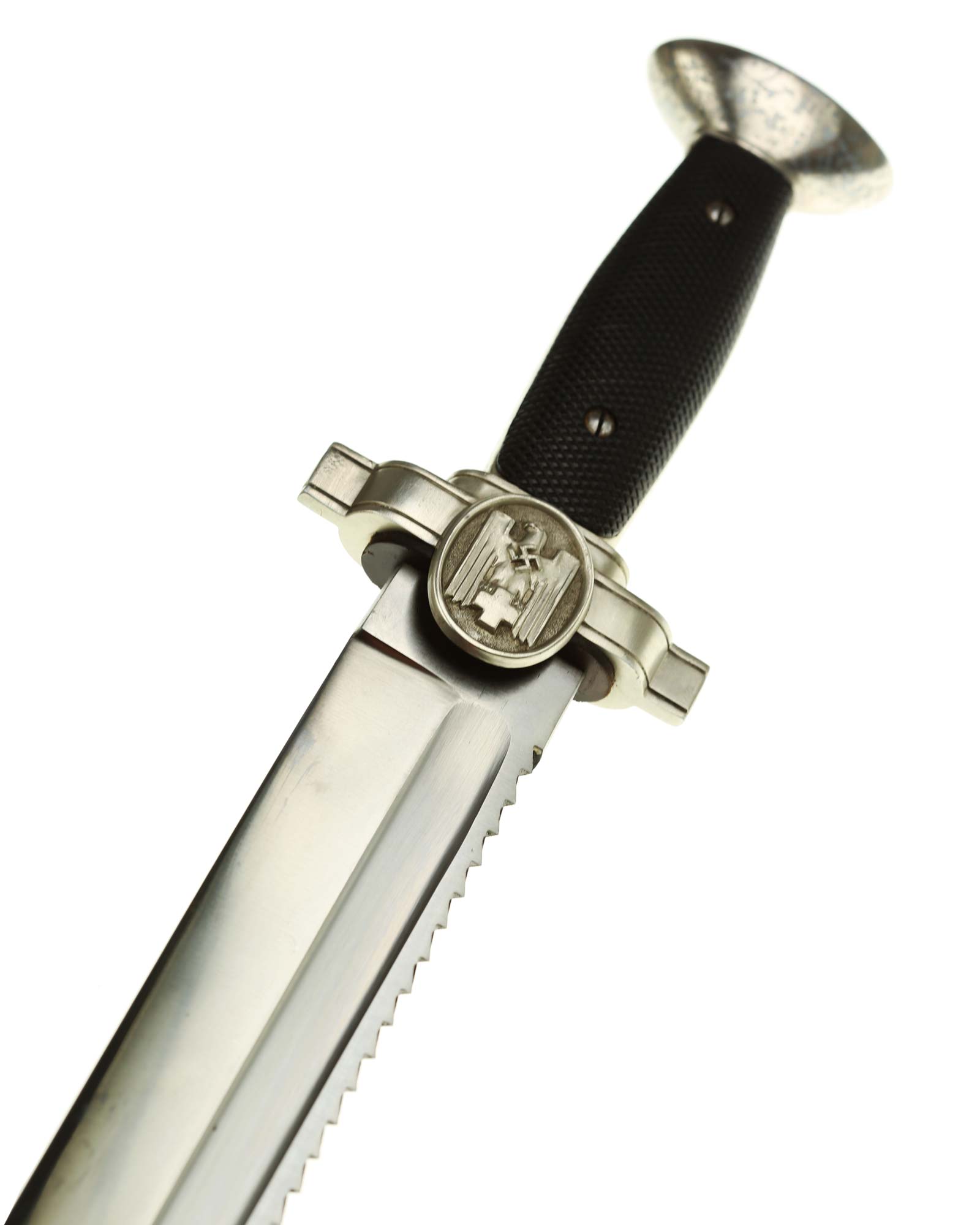 Рукоять: Рукоять металлическая, с двумя накладными пластиковыми щечками, одна из которых покрыта перекрестными насечками, другая – гладкая. Щечки закреплены при помощи двух винтов. Навершие рукояти выполнено в форме трапеции. Крестовина рукояти металлическая, прямая, с декоративными щитиками, на одном из которых отлито рельефное изображение эмблемы германского Красного Креста в виде орла со свастикой в когтях и свастикой на груди.
