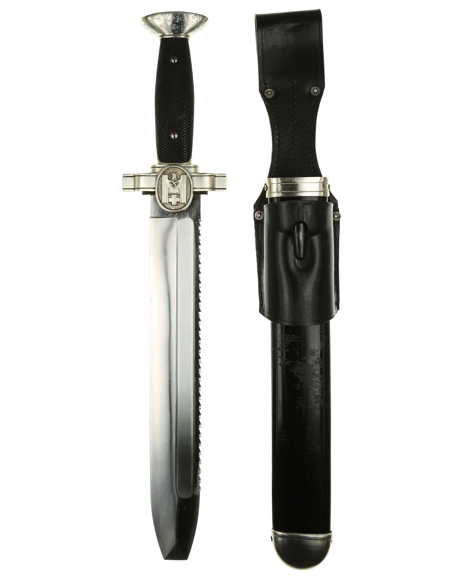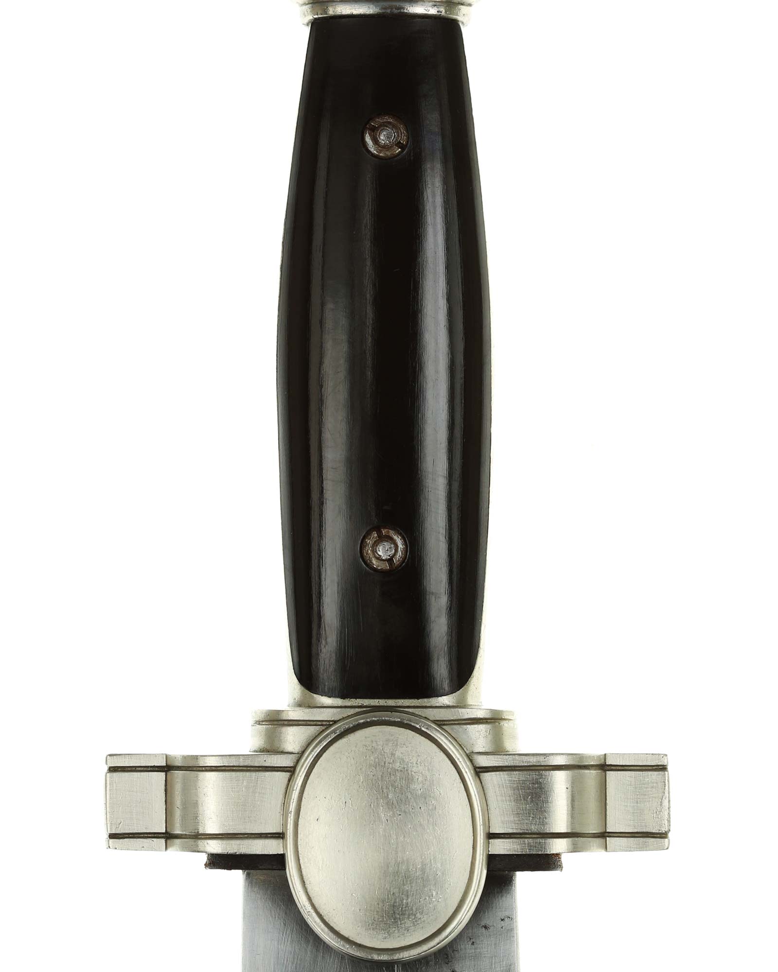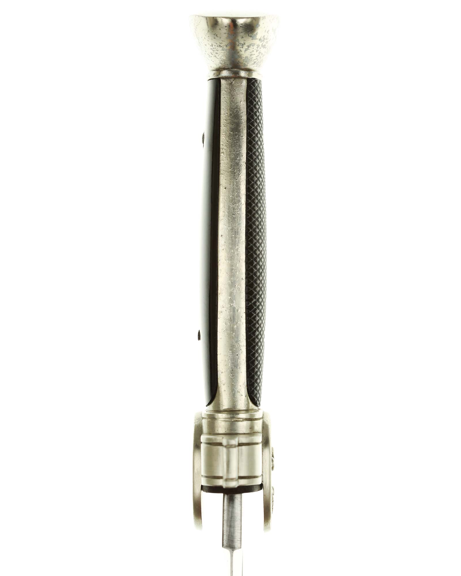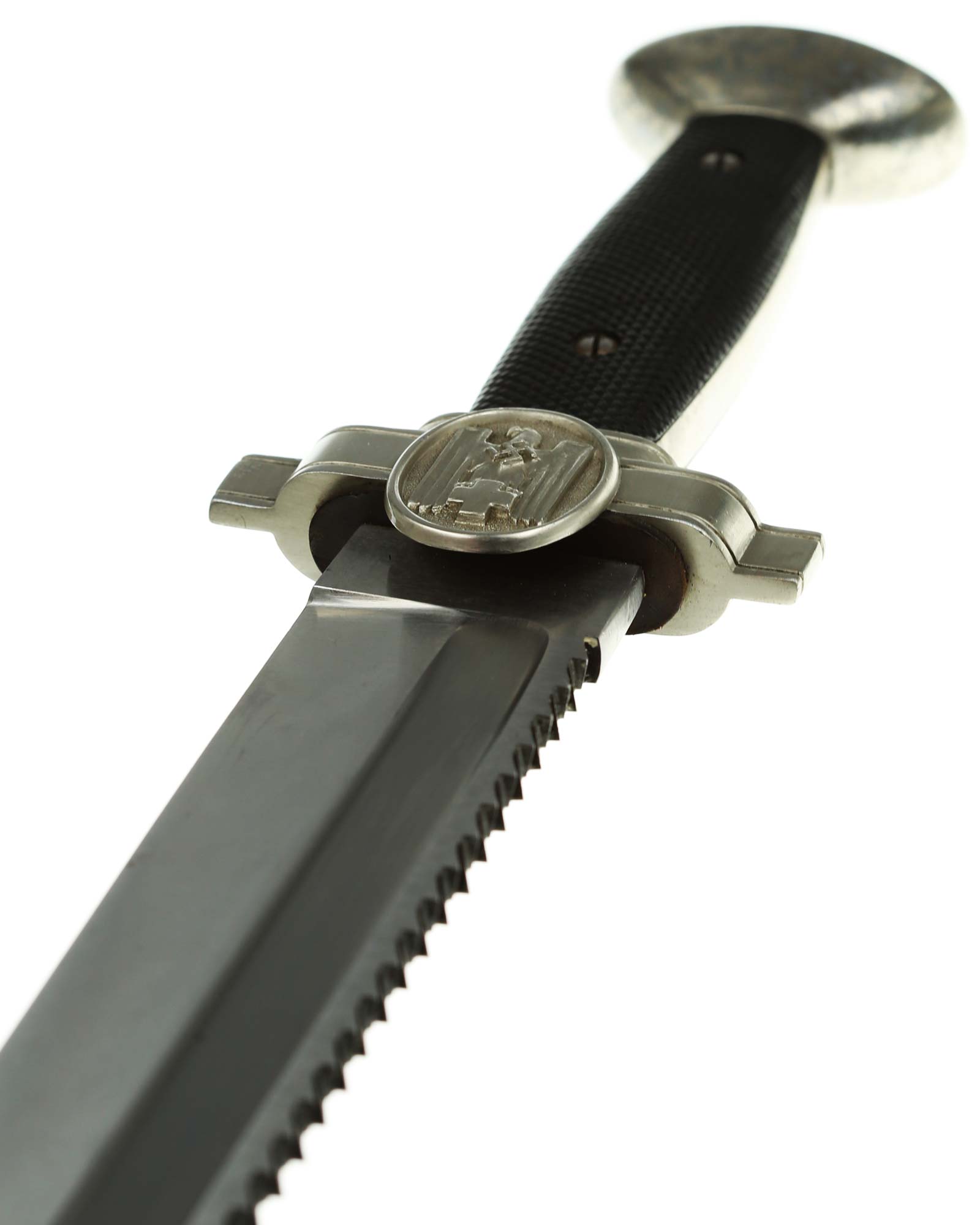 Рукоять: Рукоять металлическая, с двумя накладными пластиковыми щечками, одна из которых покрыта перекрестными насечками, другая – гладкая. Щечки закреплены при помощи двух винтов. Навершие рукояти выполнено в форме трапеции. Крестовина рукояти металлическая, прямая, с декоративными щитиками, на одном из которых отлито рельефное изображение эмблемы германского Красного Креста в виде орла со свастикой в когтях и свастикой на груди.