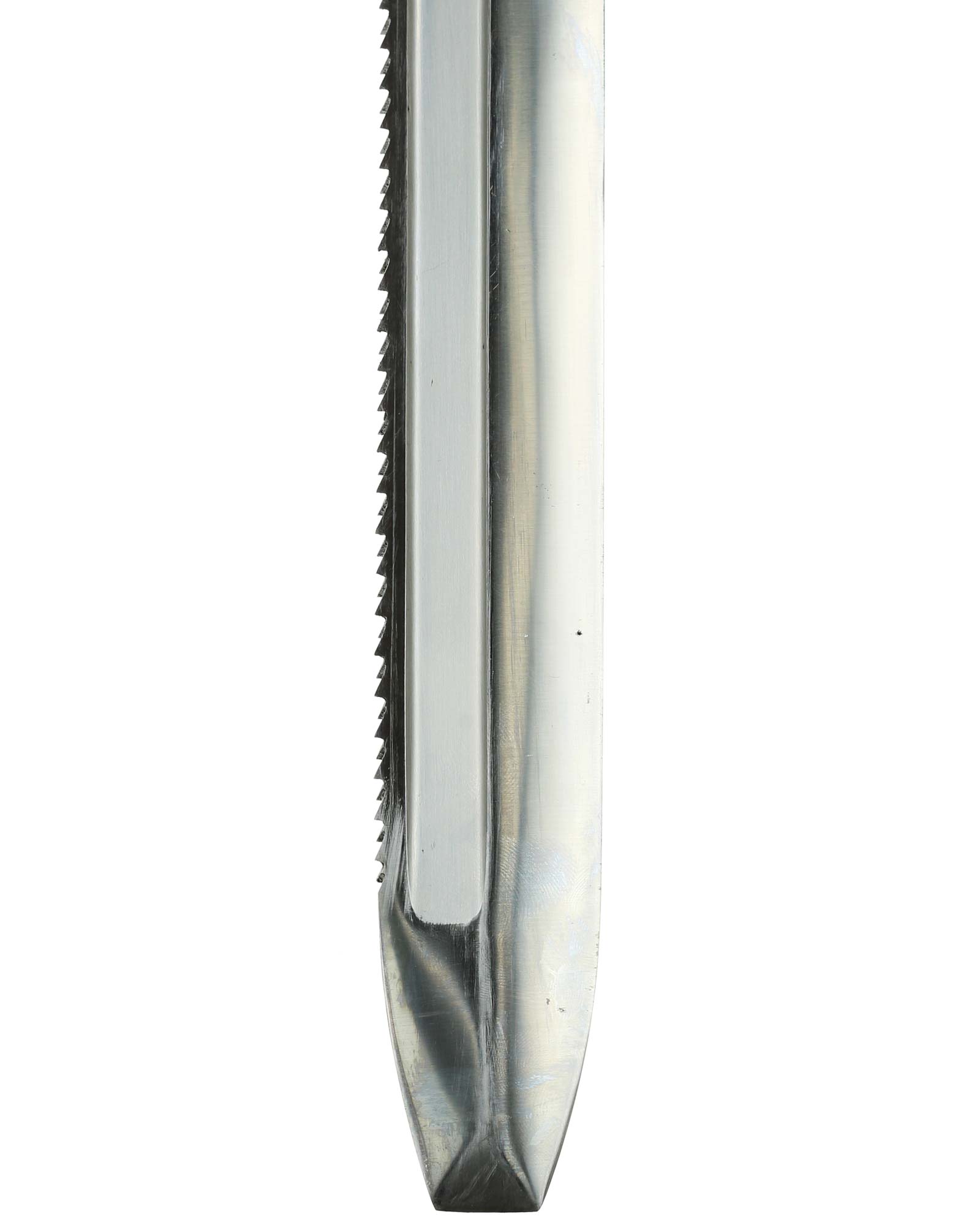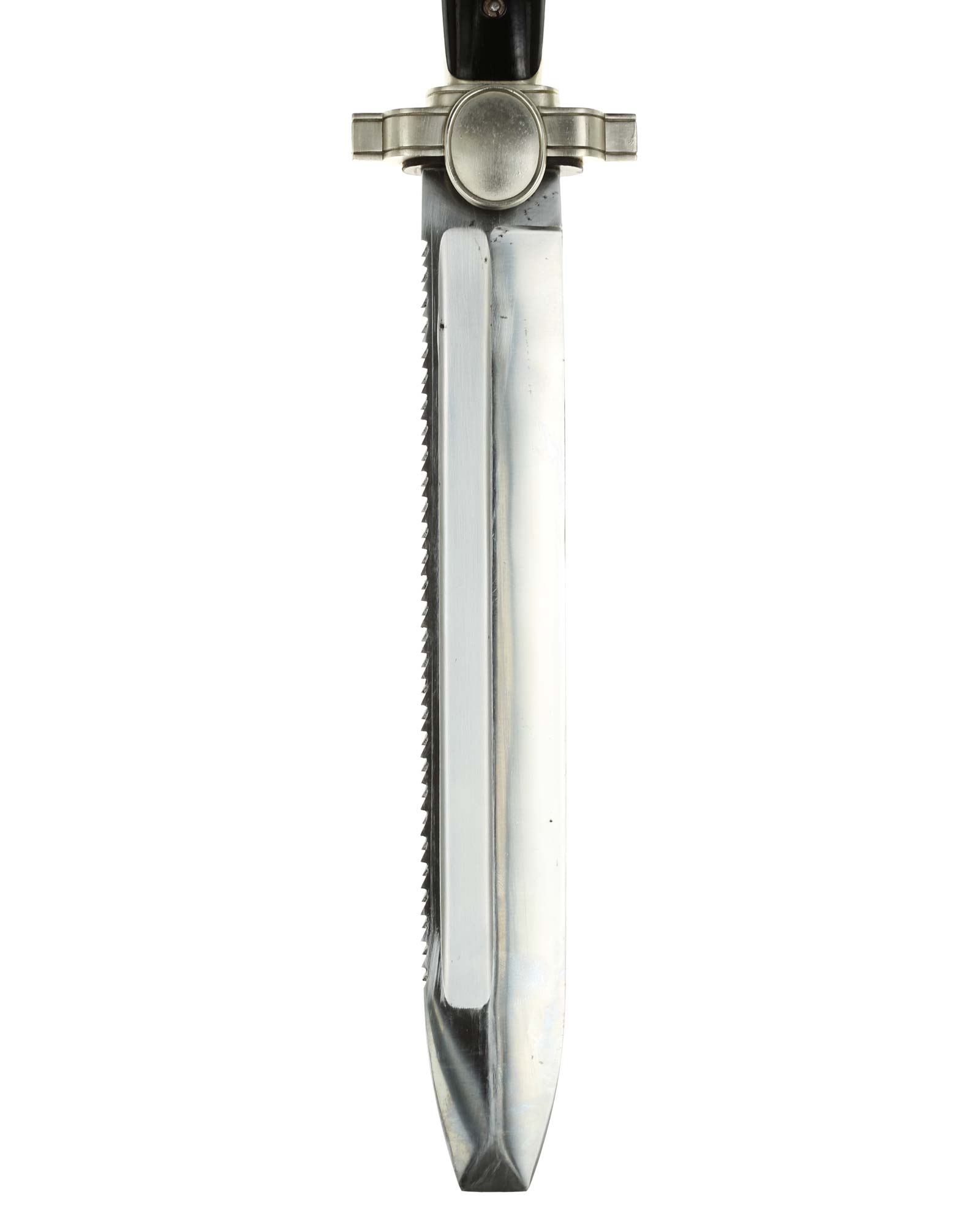 Клинок: Клинок прямой, стальной, однолезвийный, с одним долом и пилой на обухе. Боевой конец срезан.