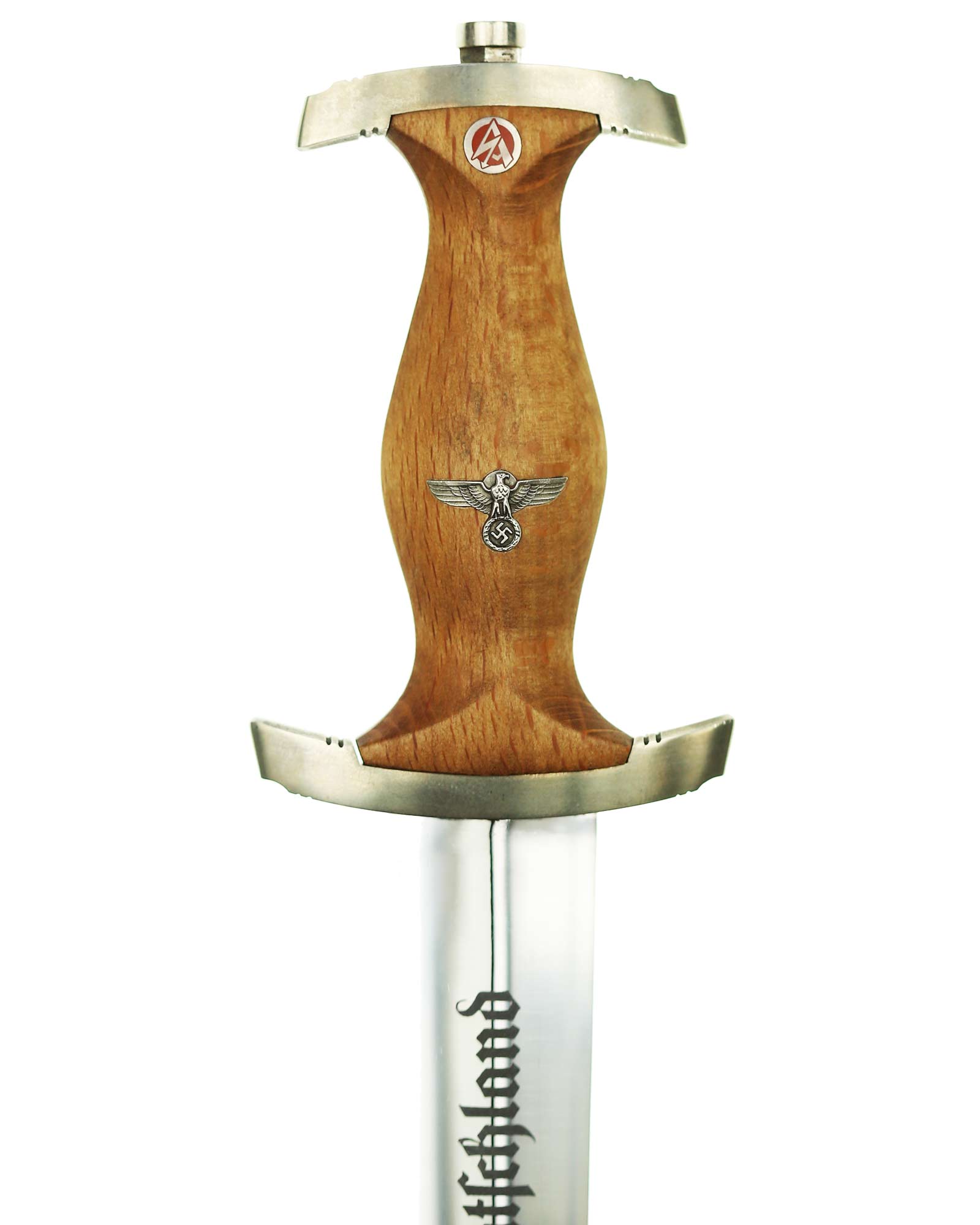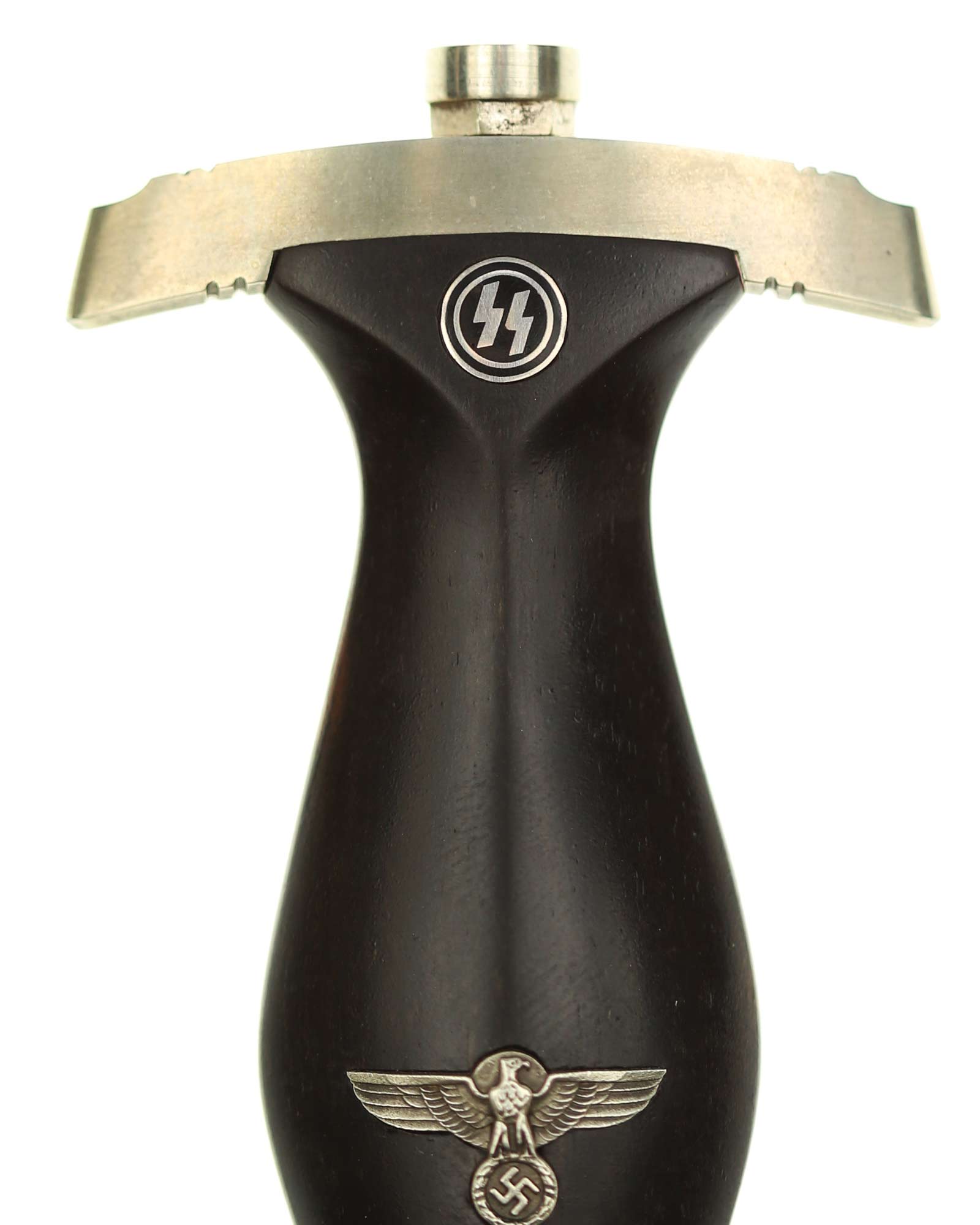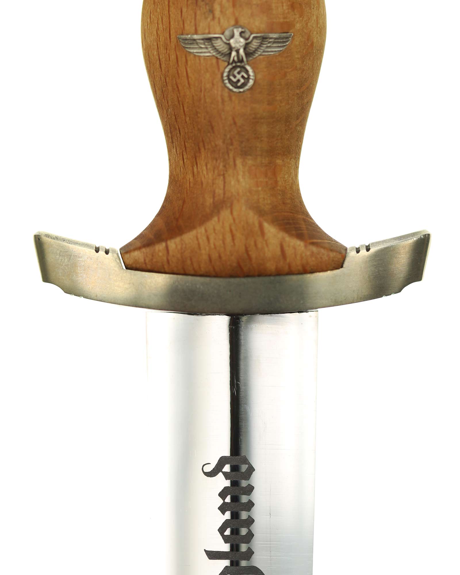 Рукоять: Рукоять из мореного в черный цвет дерева. Рукоять в верхней части имеет вставку в виде черного эмалевого глазка с рунами, в средней части рукояти – металлический знак в виде стилизованного изображения раскинувшего крылья орла, держащего в когтях венок со свастикой. Крестовина С-образная, с концами, чуть загнутыми вверх, в несколько увеличенном и перевернутом виде копирует навершие рукояти - "I" [Мюнхен].