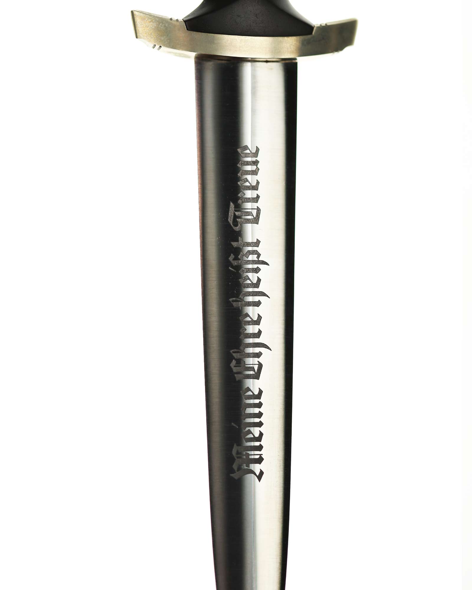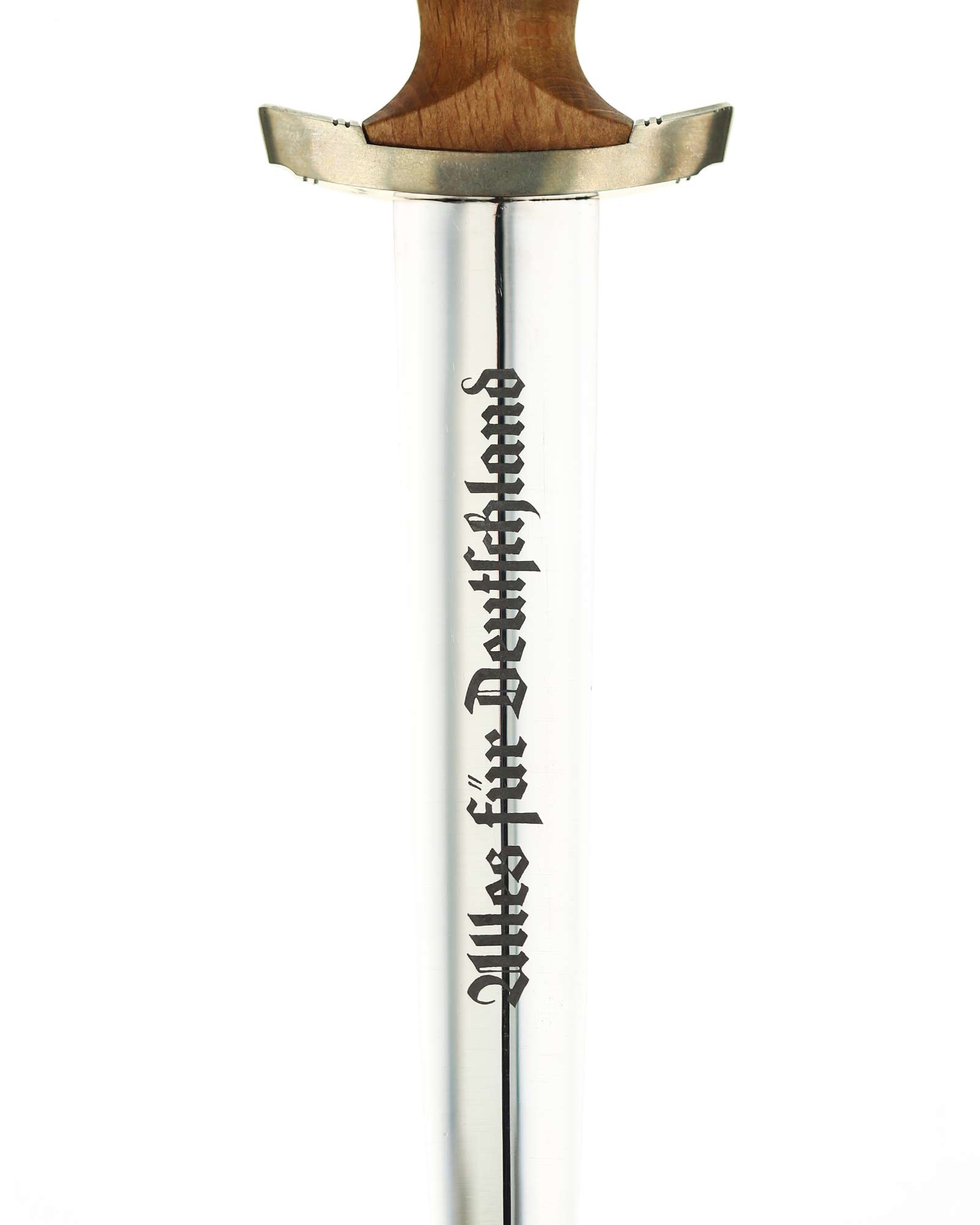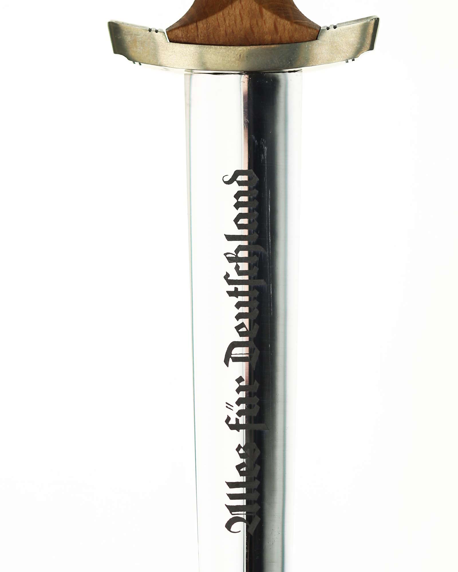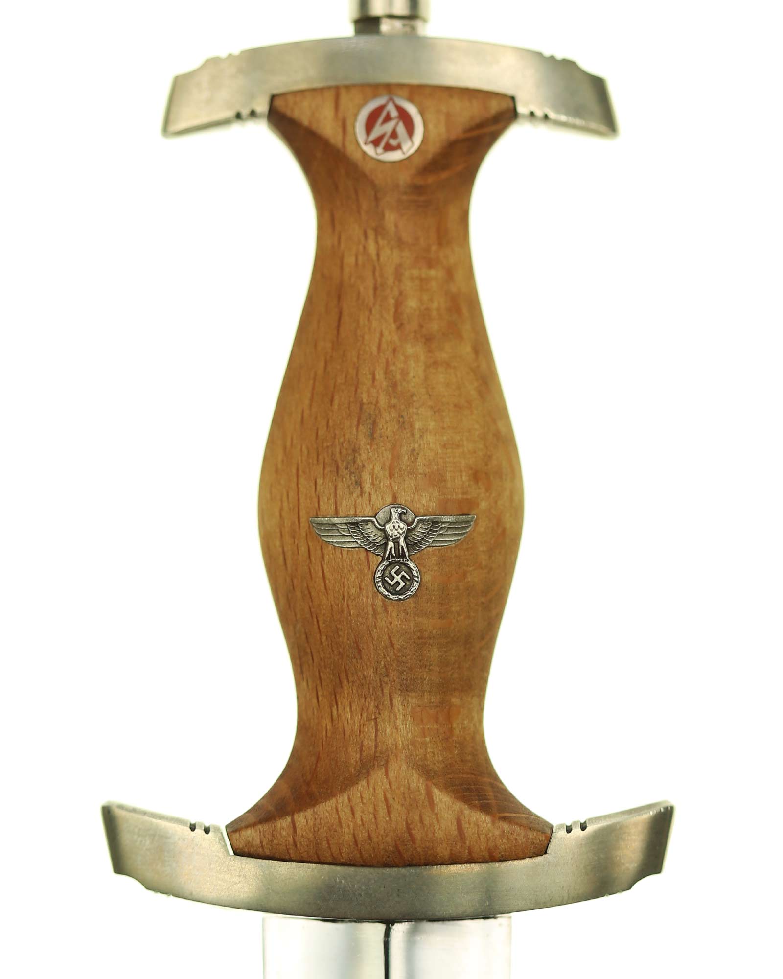 Рукоять: Рукоять из мореного в черный цвет дерева. Рукоять в верхней части имеет вставку в виде черного эмалевого глазка с рунами, в средней части рукояти – металлический знак в виде стилизованного изображения раскинувшего крылья орла, держащего в когтях венок со свастикой. Крестовина С-образная, с концами, чуть загнутыми вверх, в несколько увеличенном и перевернутом виде копирует навершие рукояти - "I" [Мюнхен].