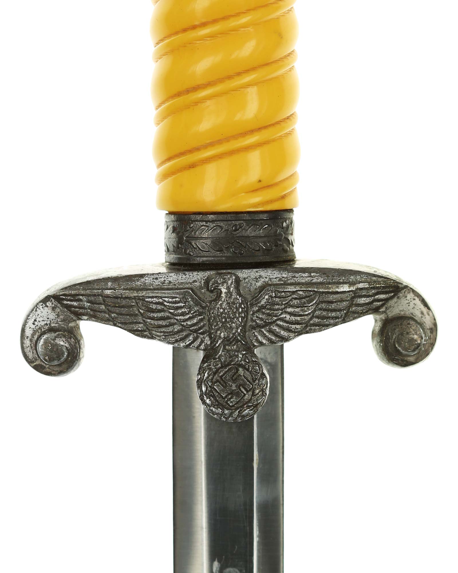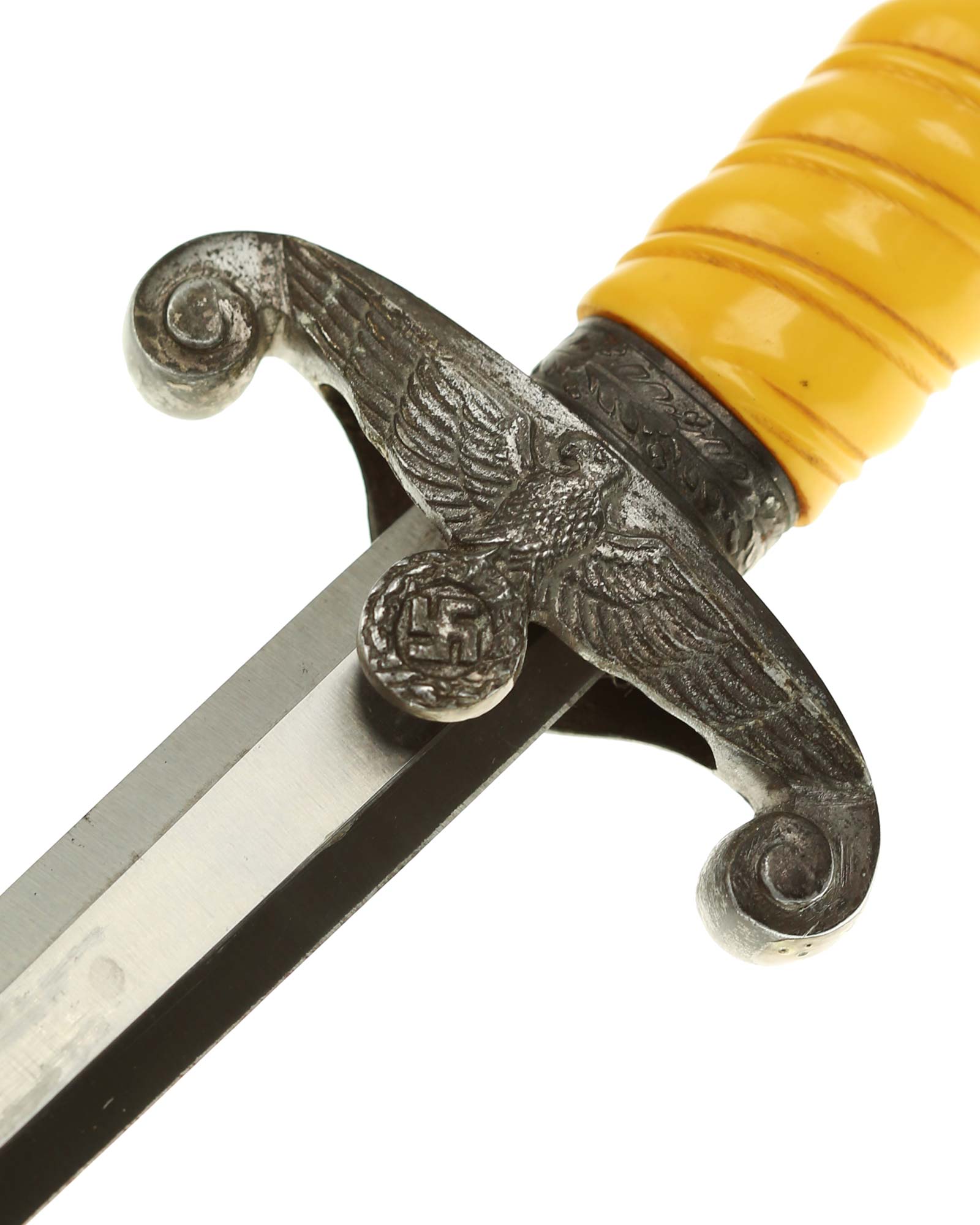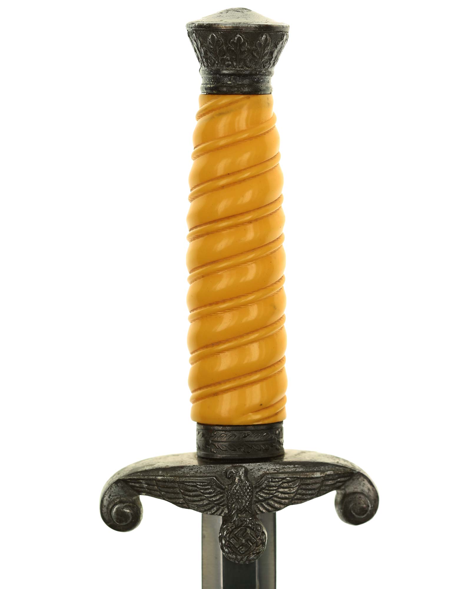 Рукоять: Рукоять из пластмассы, в сечении – овальная, с двойными поперечными желобками. Снизу на рукояти расположена металлическая втулка с изображениями дубовых листьев. Головка рукояти – литая, конической формы, имеет в нижней части два ободка, также украшена изображениями дубовых листьев. Крестовина кортика металлическая, литая, с симметричными концами, закругленными и загнутыми вниз. На перекрестье с лицевой стороны рельефное изображение германского орла, держащего в когтях венок со свастикой.