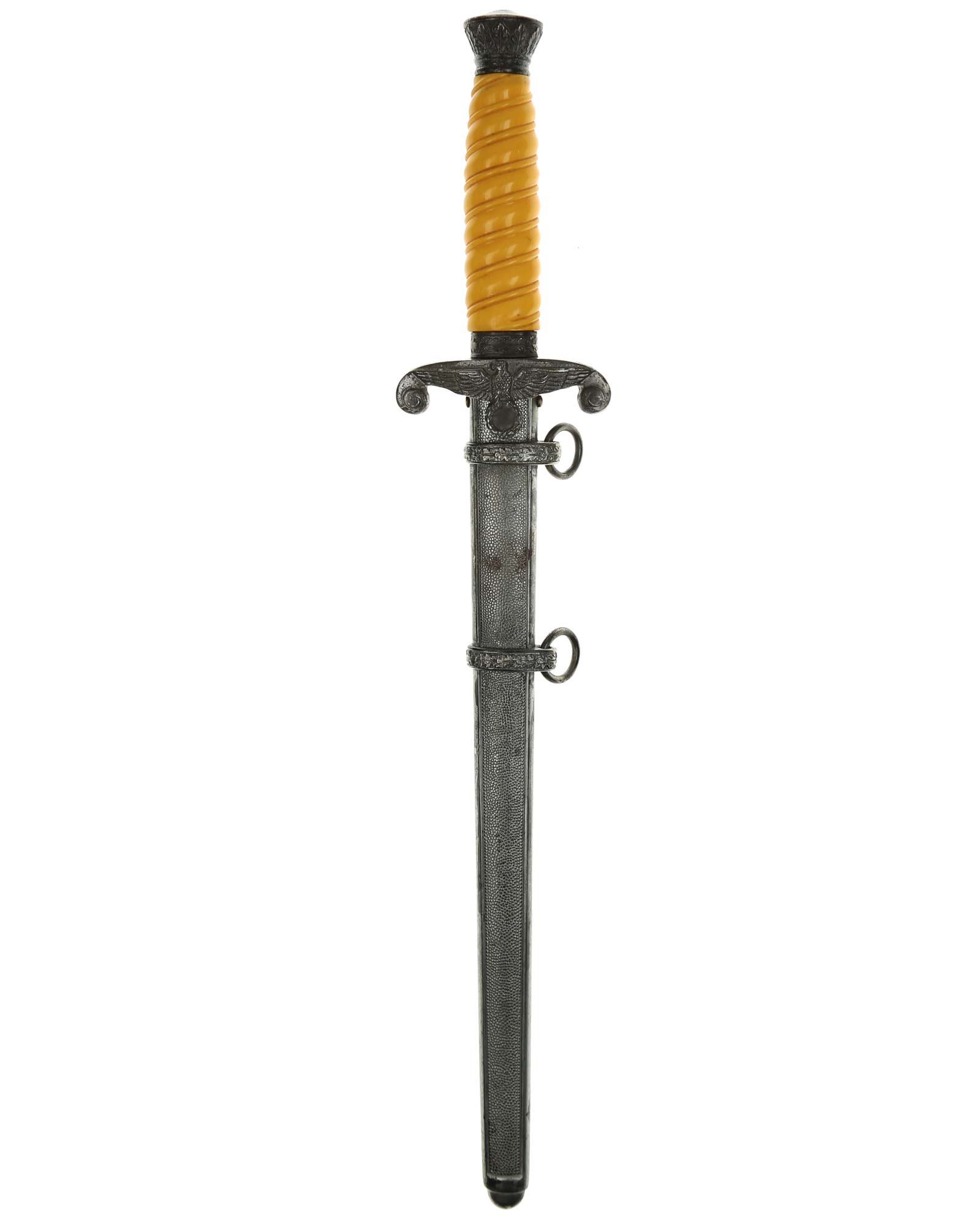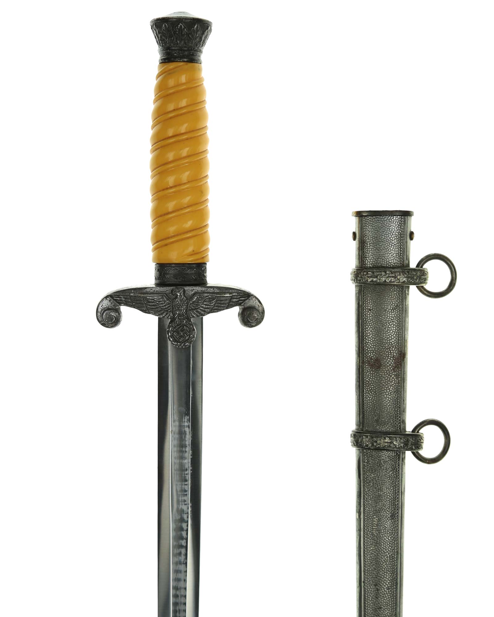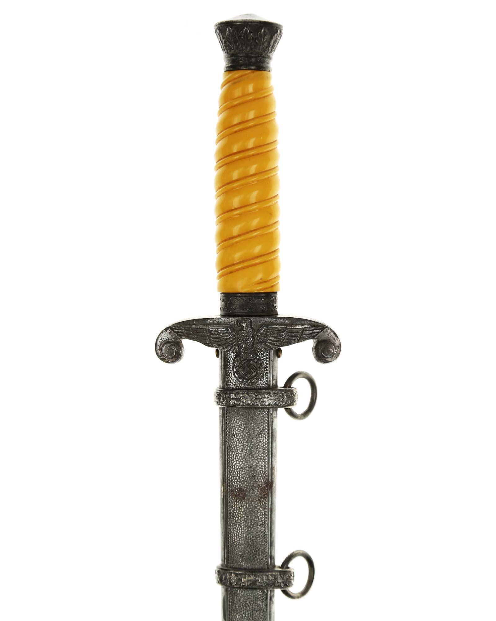 Рукоять: Рукоять из пластмассы, в сечении – овальная, с двойными поперечными желобками. Снизу на рукояти расположена металлическая втулка с изображениями дубовых листьев. Головка рукояти – литая, конической формы, имеет в нижней части два ободка, также украшена изображениями дубовых листьев. Крестовина кортика металлическая, литая, с симметричными концами, закругленными и загнутыми вниз. На перекрестье с лицевой стороны рельефное изображение германского орла, держащего в когтях венок со свастикой.