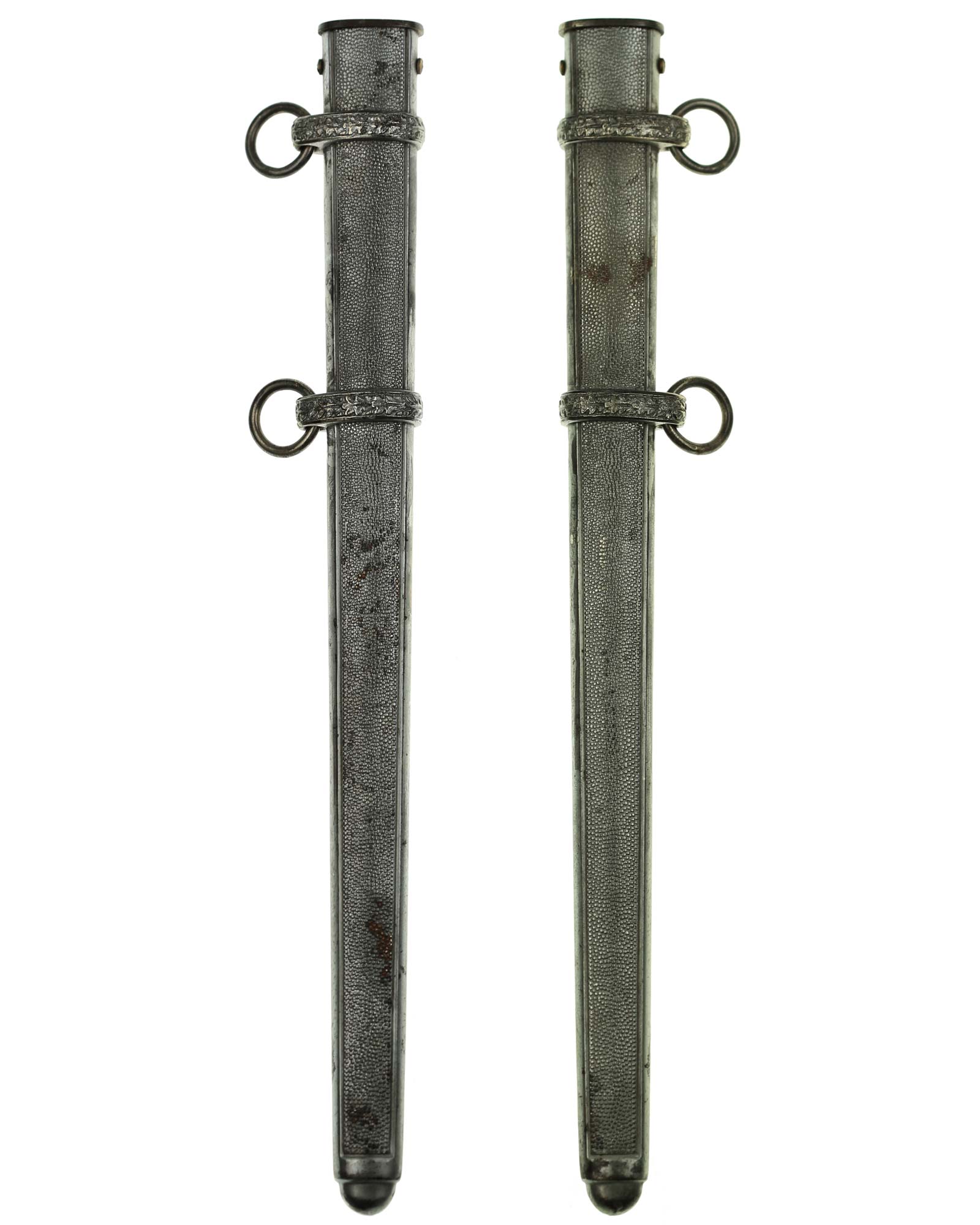 Ножны: Ножны металлические, имеющие с внешней и внутренней стороны мелкоточечную рифленую поверхность в линейной окантовке; прибор состоит из вставного устья; наконечник ножен выполнен в виде полуовала. Обоймицы (гайки) украшены рельефными изображениями дубовых листьев; на каждой обоймице (гайке) подвижно укреплено по одному кольцу. Металлические элементы эфеса и ножны посеребрены.