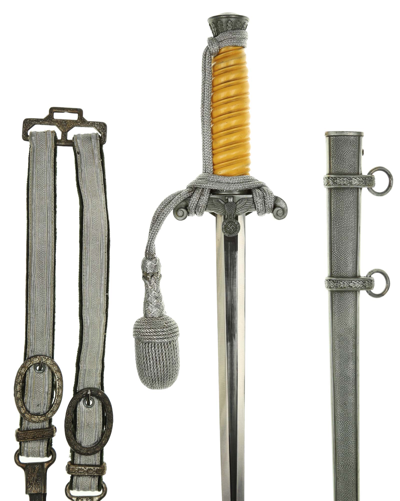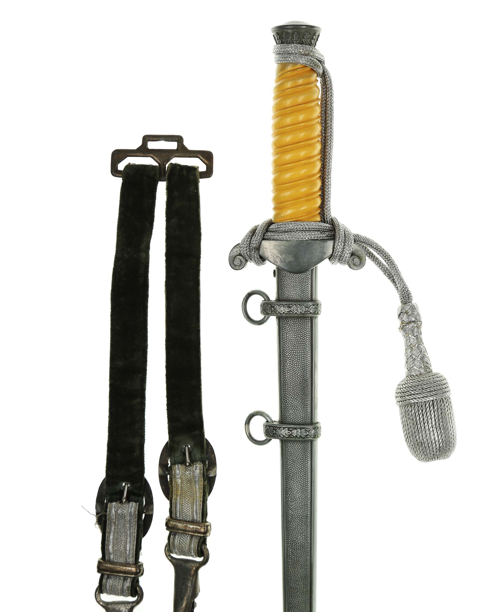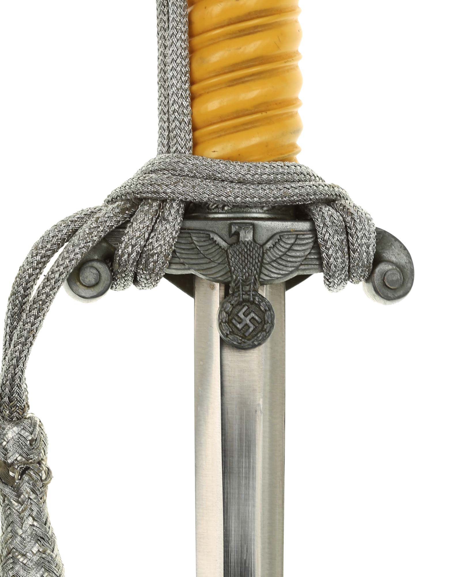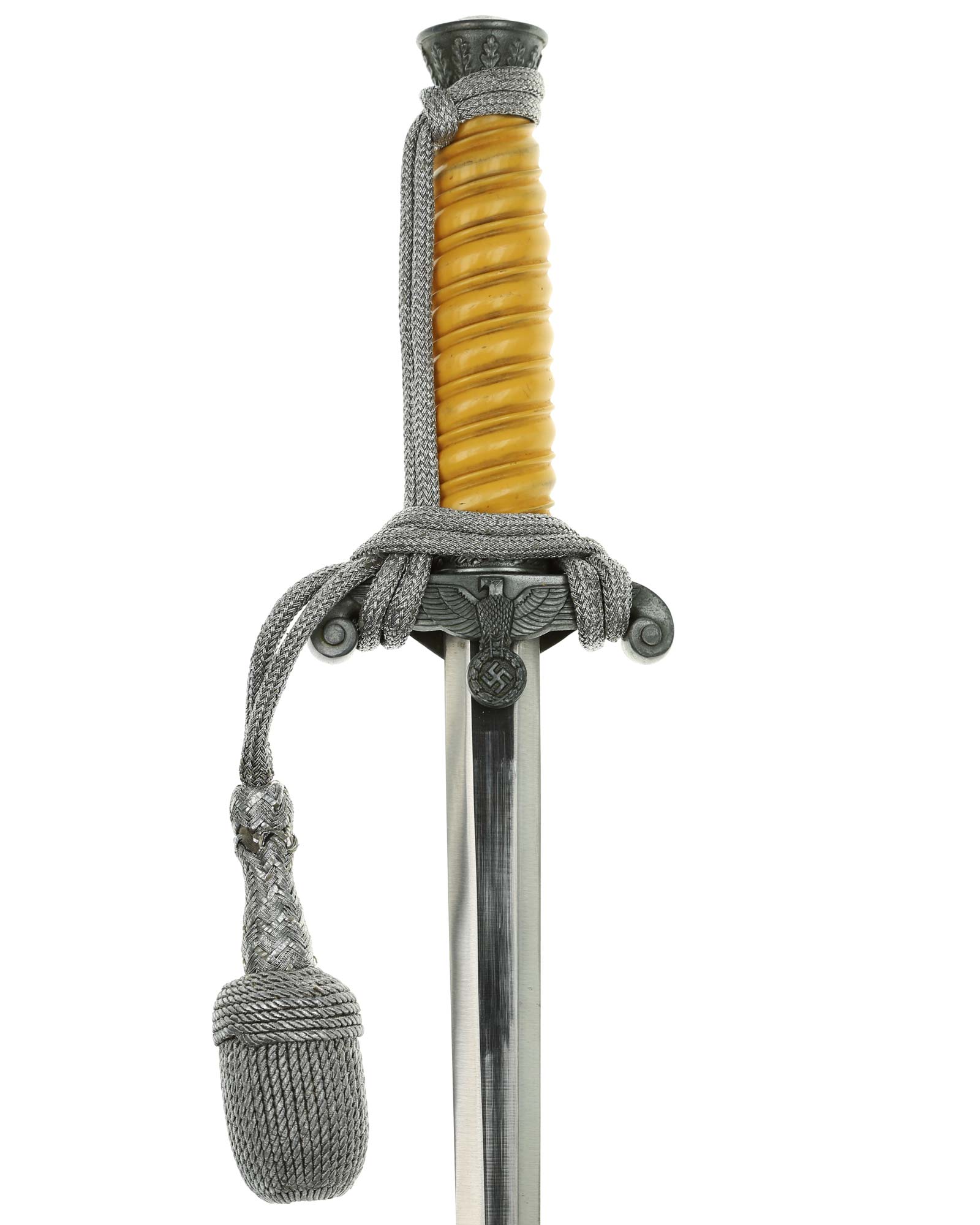 Рукоять: Рукоять из пластмассы, в сечении – овальная, с двойными поперечными желобками. Снизу на рукояти расположена металлическая втулка с изображениями дубовых листьев. Головка рукояти – литая, конической формы, имеет в нижней части два ободка, также украшена изображениями дубовых листьев. Крестовина кортика металлическая, литая, с симметричными концами, закругленными и загнутыми вниз. На перекрестье с лицевой стороны рельефное изображение германского орла, держащего в когтях венок со свастикой.