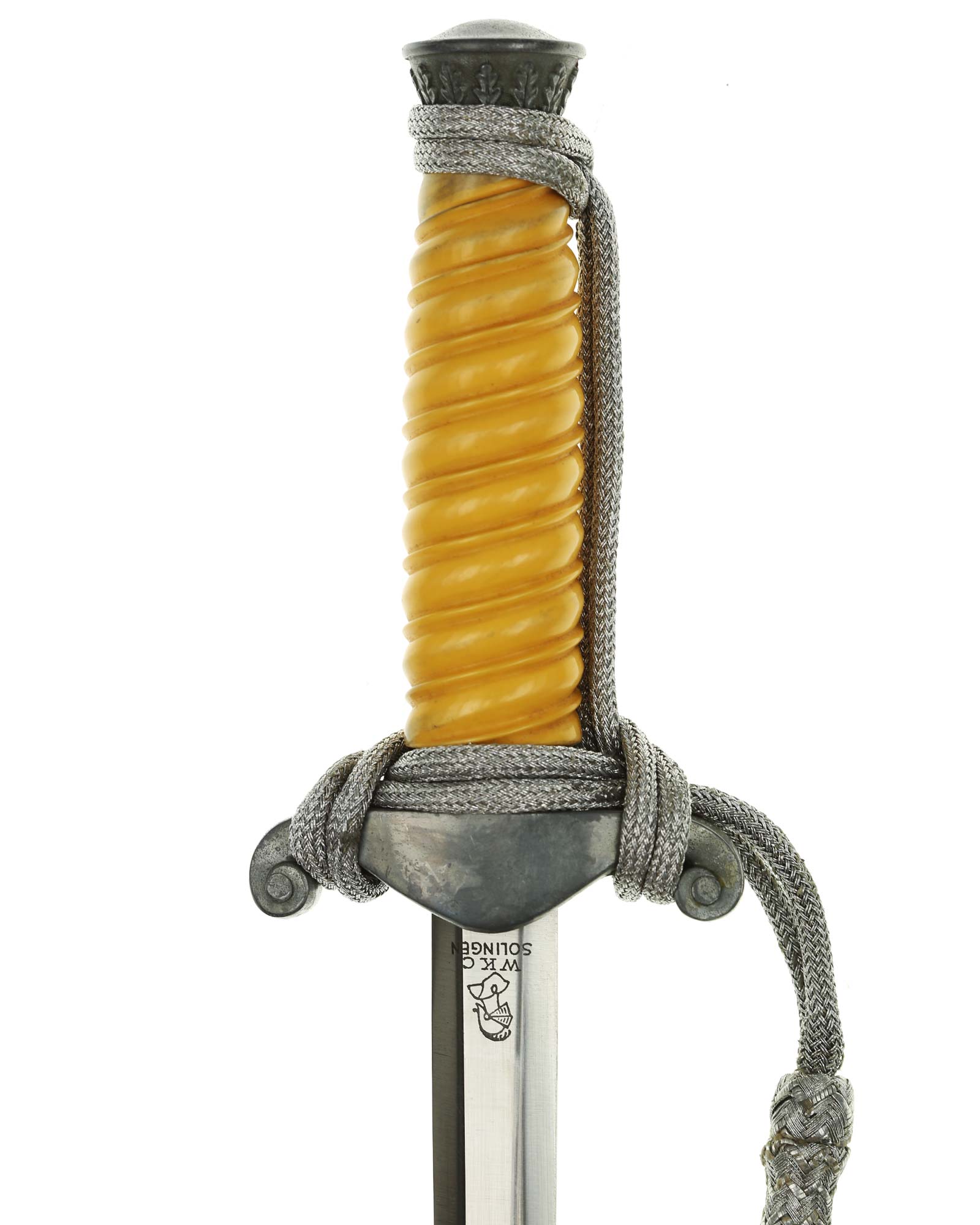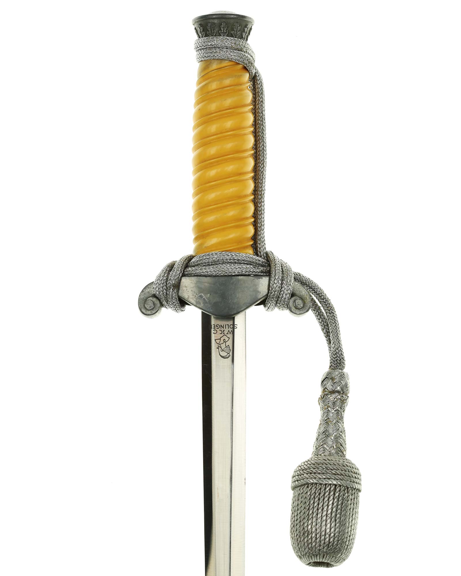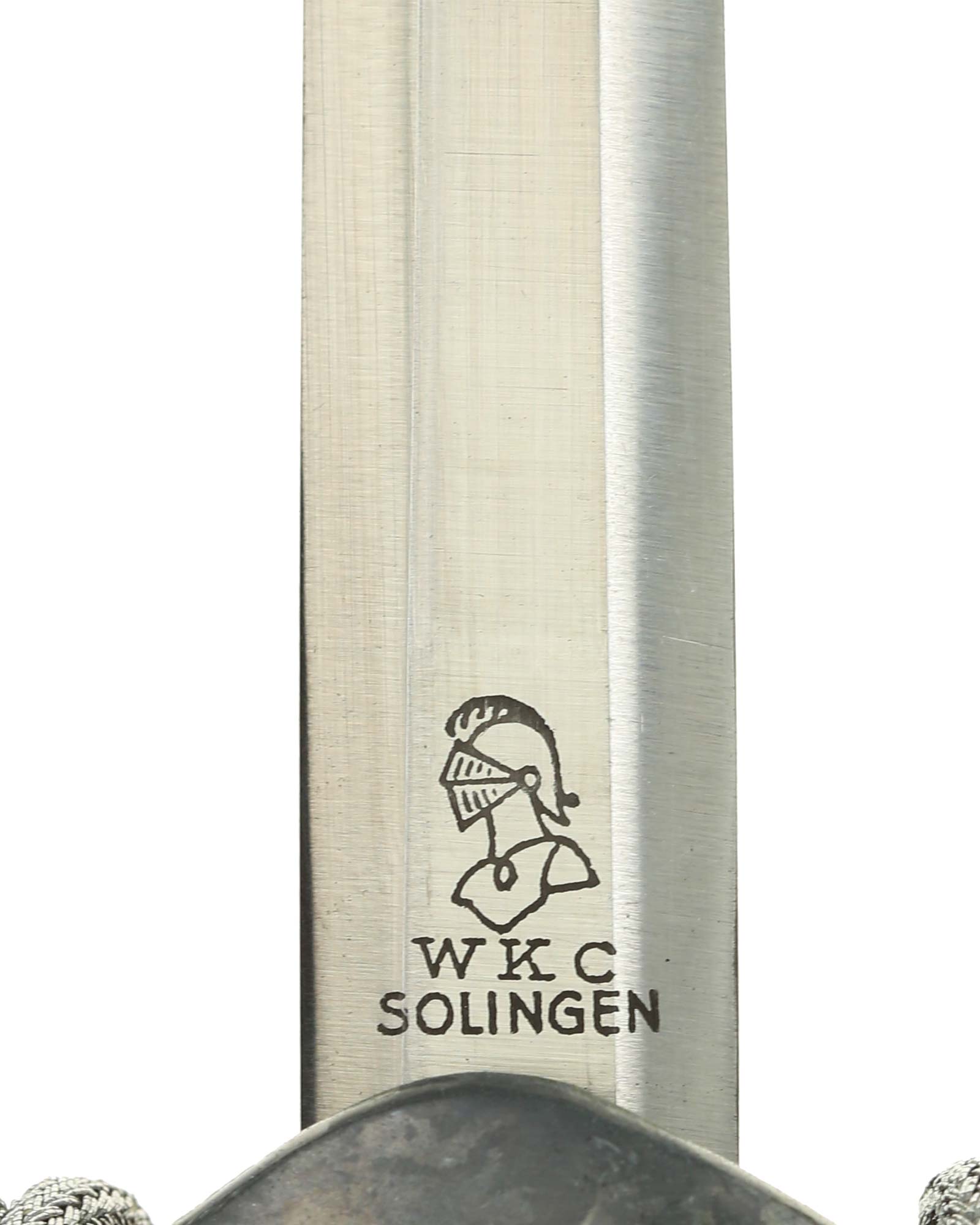 Клинок: Клинок стальной, прямой, двулезвийный, в сечении – шестигранный; боевой конец – ромбического сечения, полированный. На пяте клинка нанесено изображение рыцаря и надпись «WKC Solingen» — клеймо немецкой фирмы производителя «Вайерсберг Киршбаум & Ко., Золинген» (Weyersberg Kirschbaum & Cie Solingen).