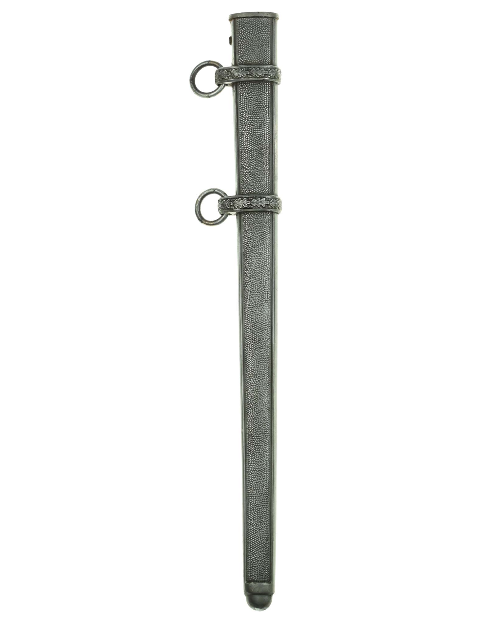 Ножны: Ножны металлические, имеющие с внешней и внутренней стороны мелкоточечную рифленую поверхность в линейной окантовке; прибор состоит из вставного устья; наконечник ножен выполнен в виде полуовала. Обоймицы (гайки) украшены рельефными изображениями дубовых листьев; на каждой обоймице (гайке) подвижно укреплено по одному кольцу. Металлические элементы эфеса и ножны посеребрены.
