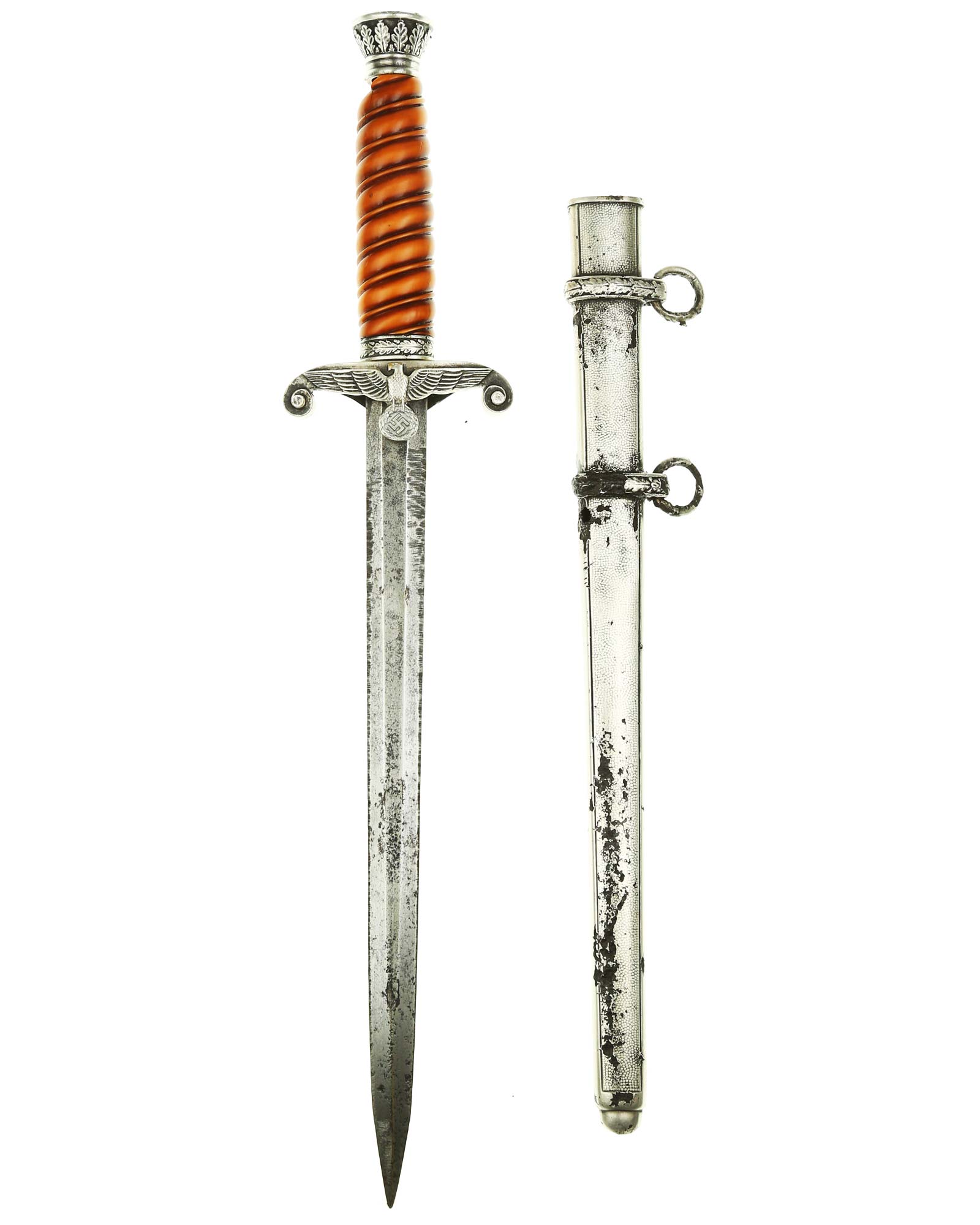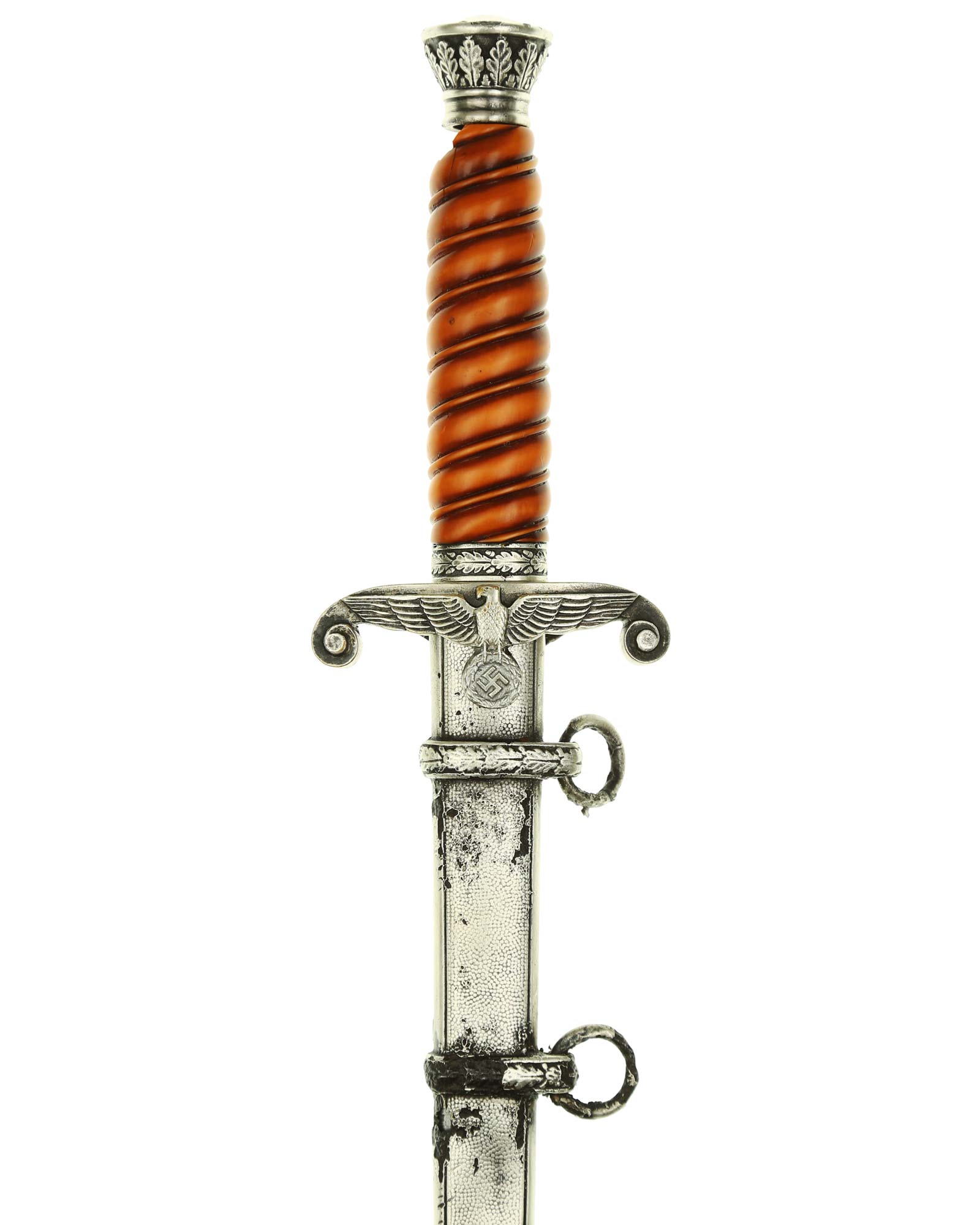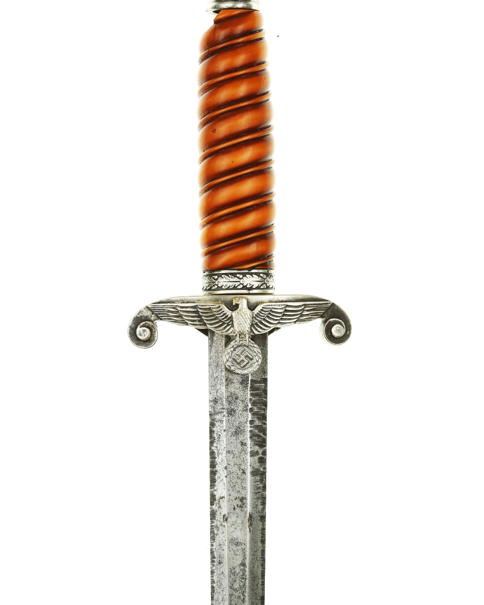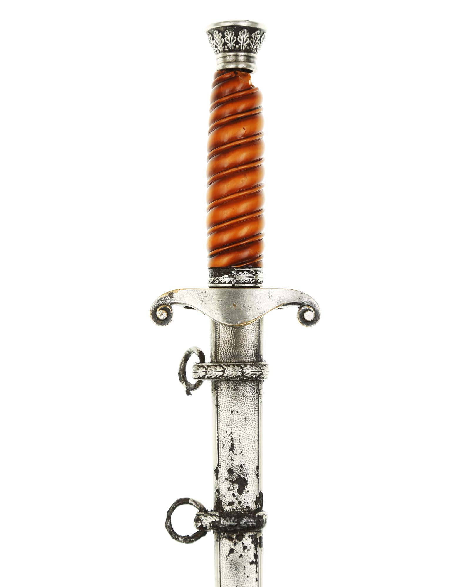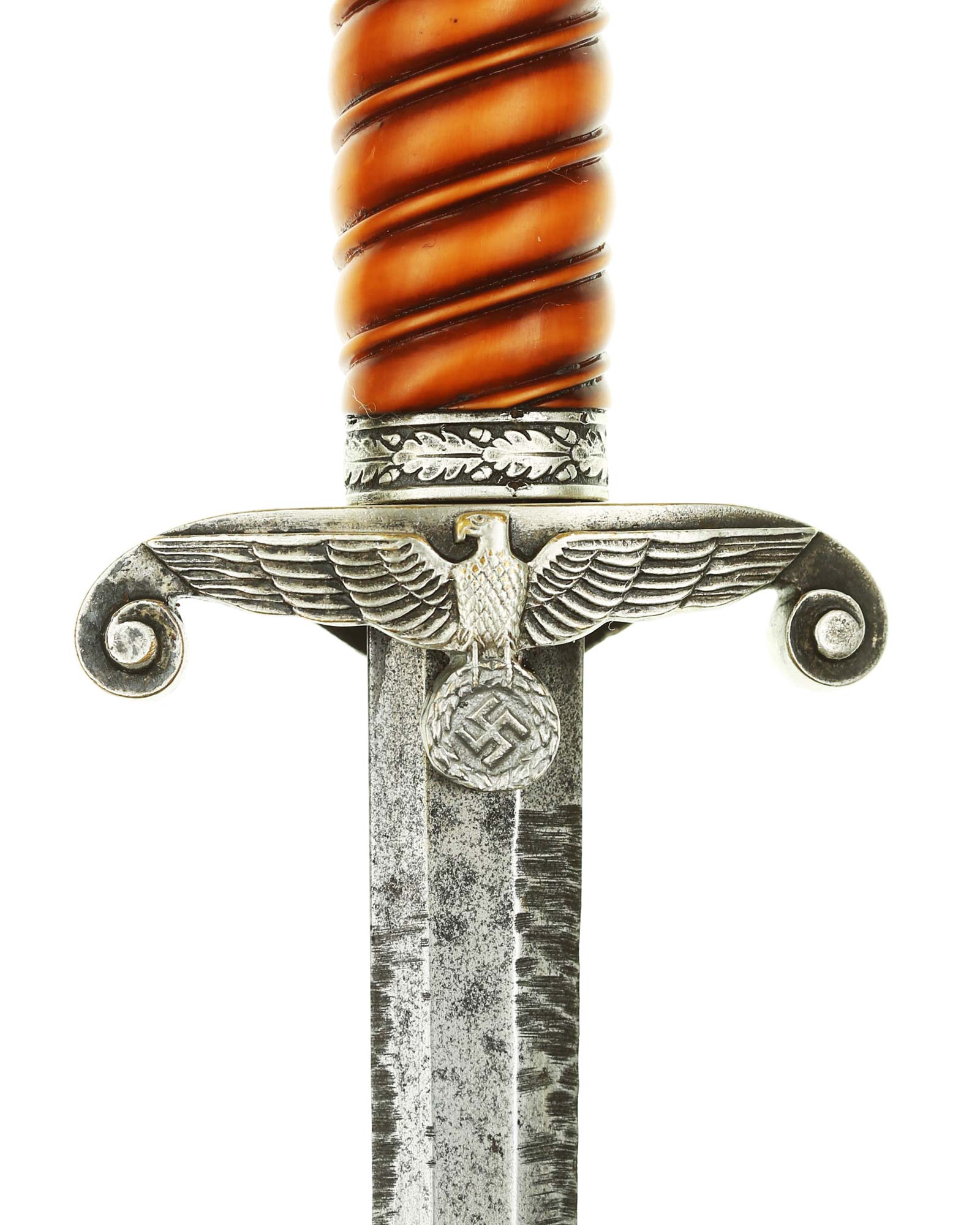 Рукоять: Рукоять из желтой пластмассы, в сечении – овальная, с двойными поперечными желобками. Снизу на рукояти расположена металлическая втулка с изображениями дубовых листьев. Головка рукояти – литая, конической формы, имеет в нижней части два ободка, также украшена изображениями дубовых листьев. Крестовина кортика металлическая, литая, с симметричными концами, закругленными и загнутыми вниз. На перекрестье с лицевой стороны рельефное изображение германского орла, держащего в когтях венок со свастикой.