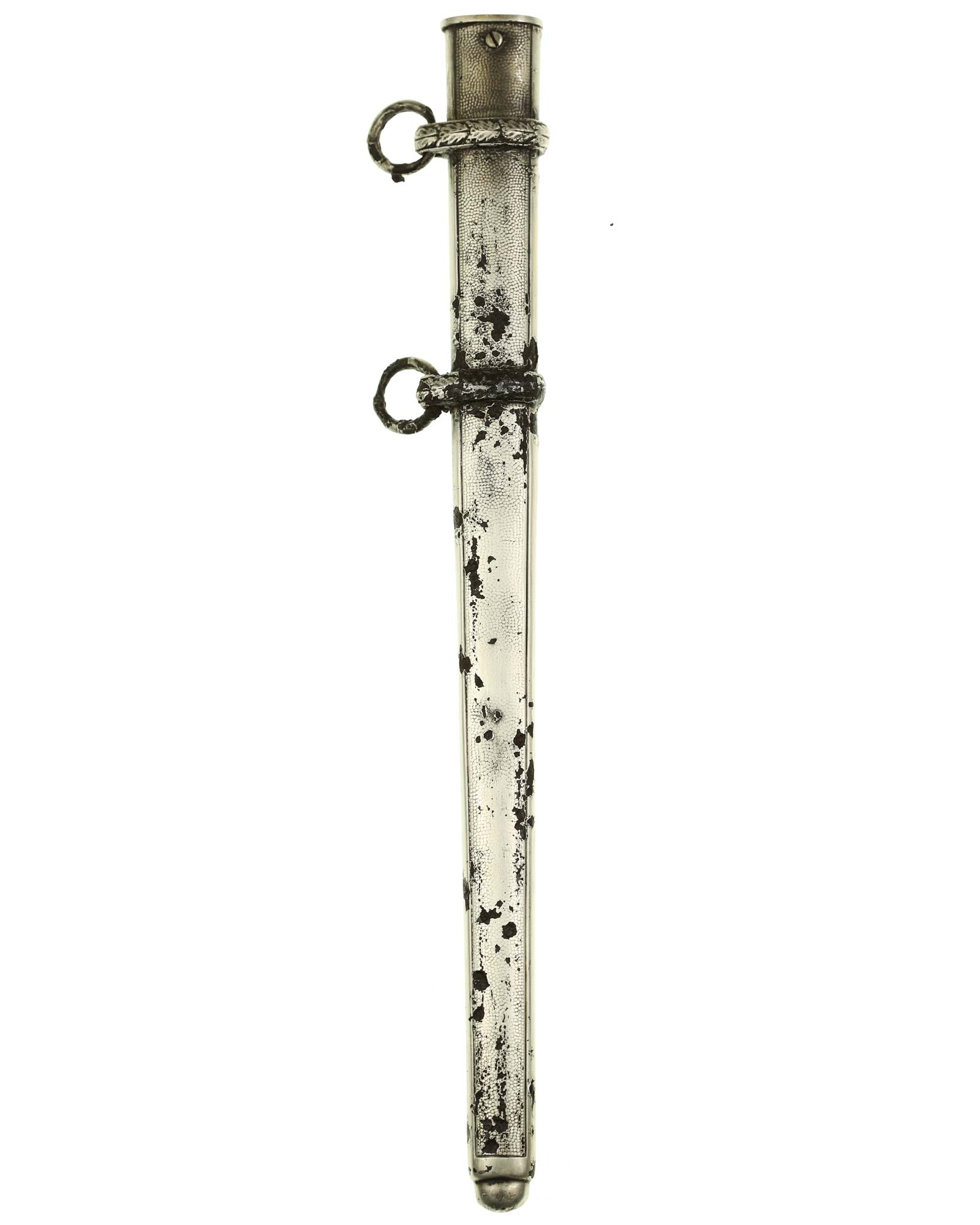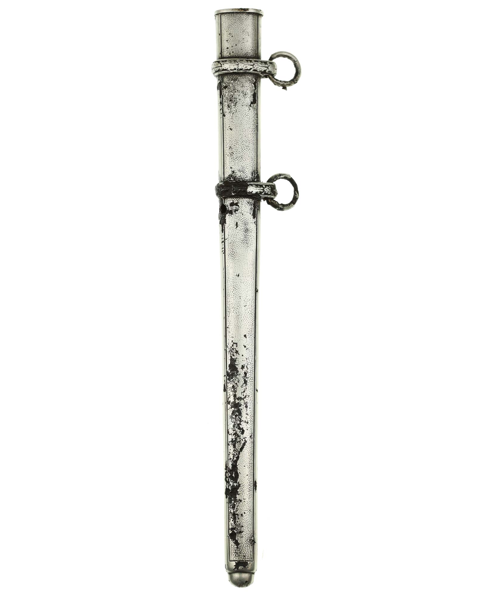 Ножны: Ножны металлические, имеющие с внешней и внутренней стороны мелкоточечную рифленую поверхность в линейной окантовке; прибор состоит из вставного устья; наконечник ножен выполнен в виде полуовала. Обоймицы (гайки) украшены рельефными изображениями дубовых листьев; на каждой обоймице (гайке) подвижно укреплено по одному кольцу. Металлические элементы эфеса и ножны посеребрены.