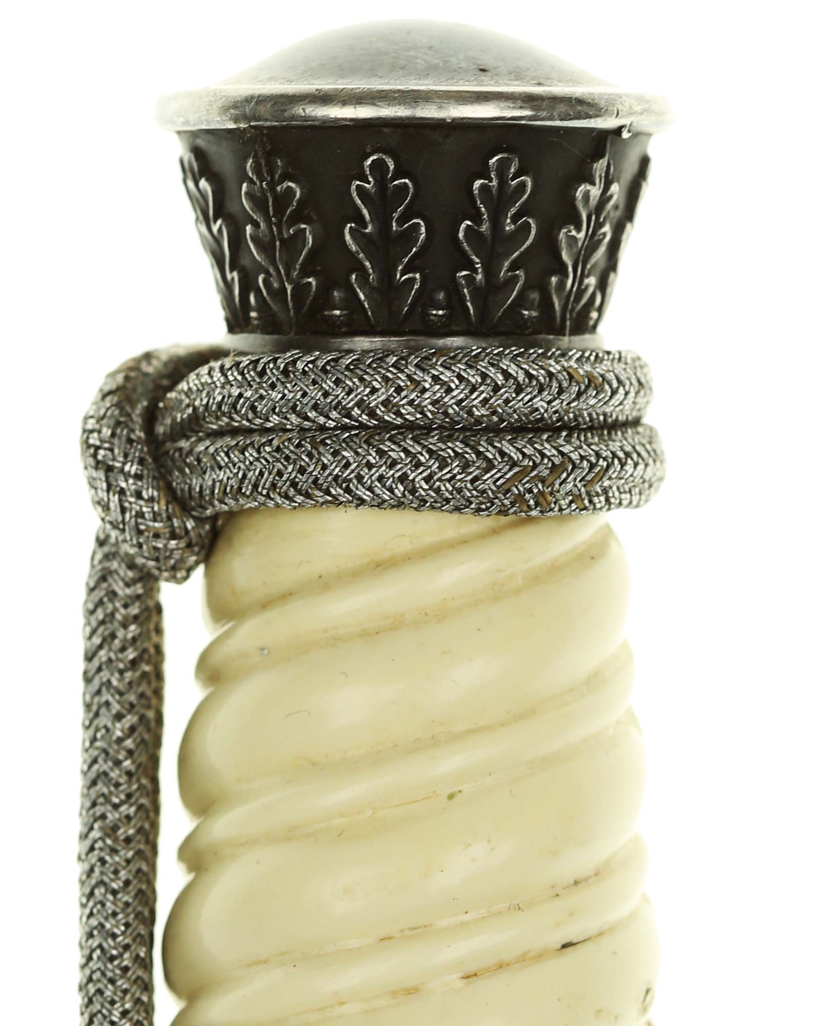 Рукоять: Рукоять кортика, в сечении – овальная, с двойными поперечными желобками. Снизу на рукояти расположена металлическая втулка с изображениями дубовых листьев. Головка рукояти – литая, конической формы, имеет в нижней части два ободка, также украшена изображениями дубовых листьев. Крестовина кортика металлическая, литая, с симметричными концами, закругленными и загнутыми вниз. На перекрестье с лицевой стороны рельефное изображение германского орла, держащего в когтях венок со свастикой.