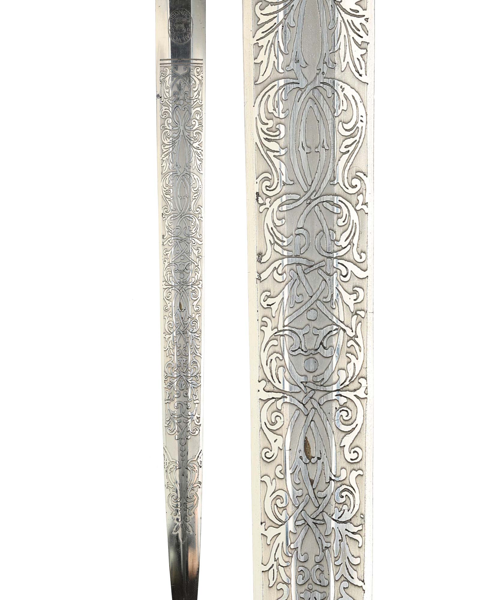 Клинок: Клинок стальной, прямой, двулезвийный, в сечении – шестигранный; боевой конец – ромбического сечения, полированный. На пяте клинка нанесено клеймо немецкой фирмы производителя «Эмиль Фоос Золинген» (Emil Voos Solingen).