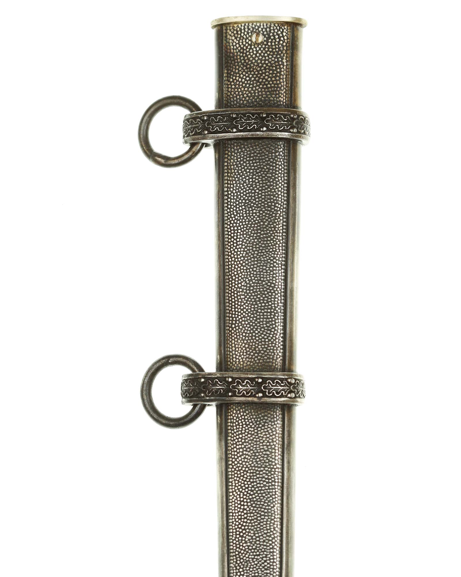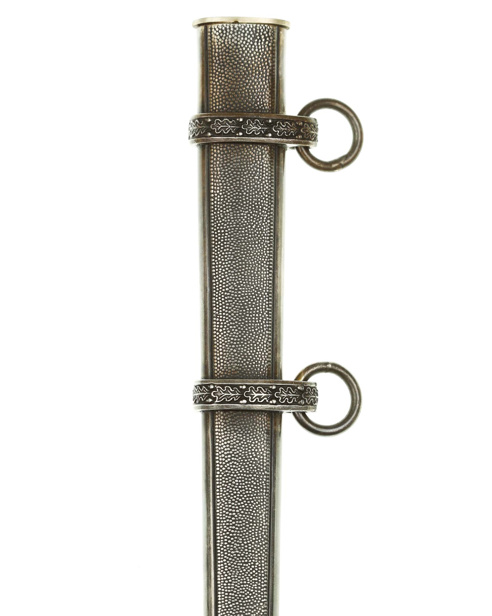 Ножны: Ножны металлические, имеющие с внешней и внутренней стороны мелкоточечную рифленую поверхность в линейной окантовке; прибор состоит из вставного устья; наконечник ножен выполнен в виде полуовала. Обоймицы (гайки) украшены рельефными изображениями дубовых листьев; на каждой обоймице (гайке) подвижно укреплено по одному кольцу. Металлические элементы эфеса и ножны посеребрены.