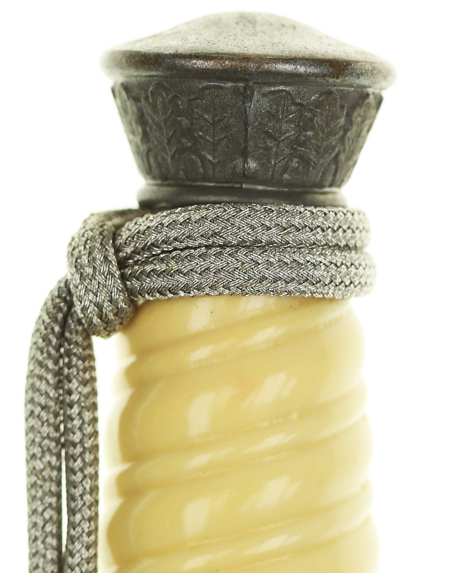 Рукоять: Рукоять кортика, в сечении – овальная, с двойными поперечными желобками. Снизу на рукояти расположена металлическая втулка с изображениями дубовых листьев. Головка рукояти – литая, конической формы, имеет в нижней части два ободка, также украшена изображениями дубовых листьев. Крестовина кортика металлическая, литая, с симметричными концами, закругленными и загнутыми вниз. На перекрестье с лицевой стороны рельефное изображение германского орла, держащего в когтях венок со свастикой.