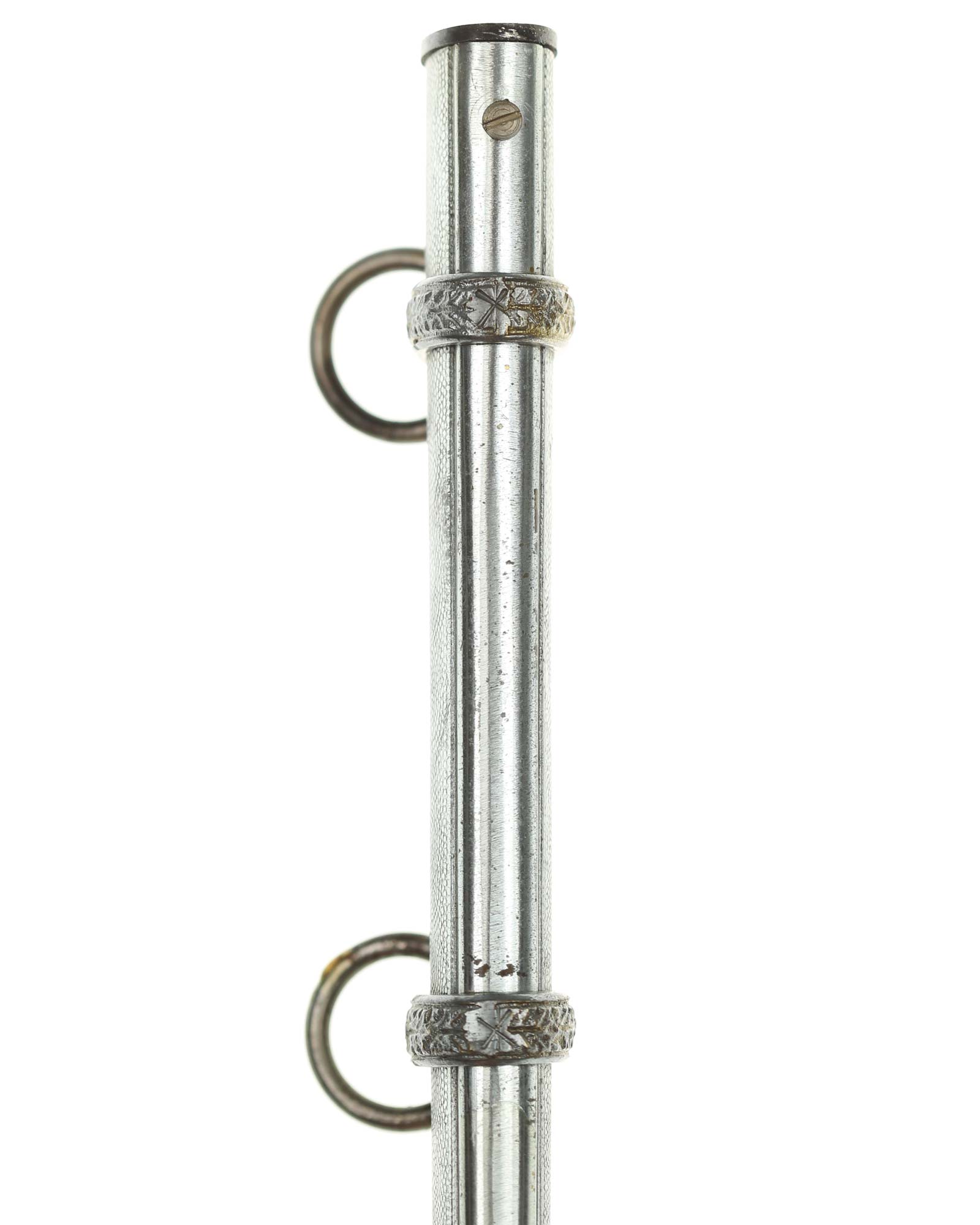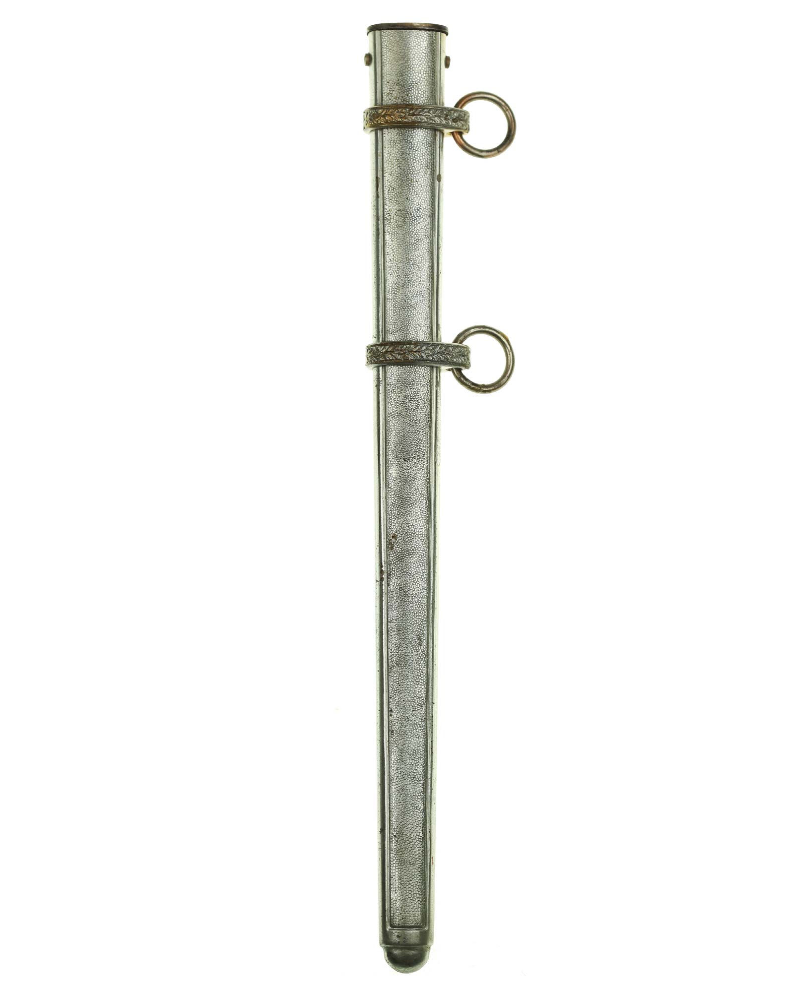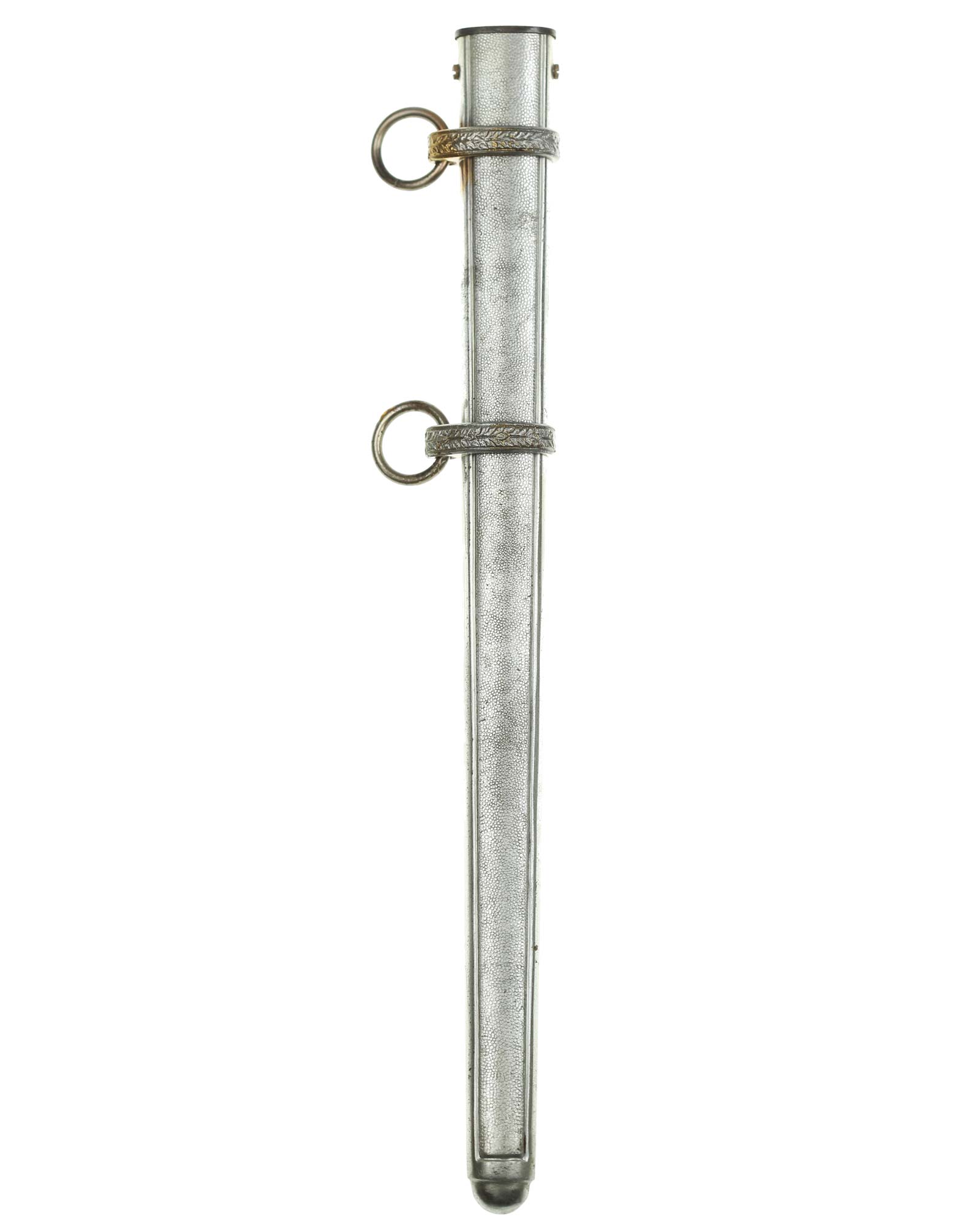 Ножны: Ножны металлические, имеющие с внешней и внутренней стороны мелкоточечную рифленую поверхность в линейной окантовке; прибор состоит из вставного устья и двух цельнолитых обоймиц (гаек); наконечник ножен выполнен в виде полуовала. Обоймицы (гайки) украшены рельефными изображениями дубовых листьев; на каждой обоймице (гайке) подвижно укреплено по одному кольцу. Металлические элементы эфеса и ножны посеребрены.