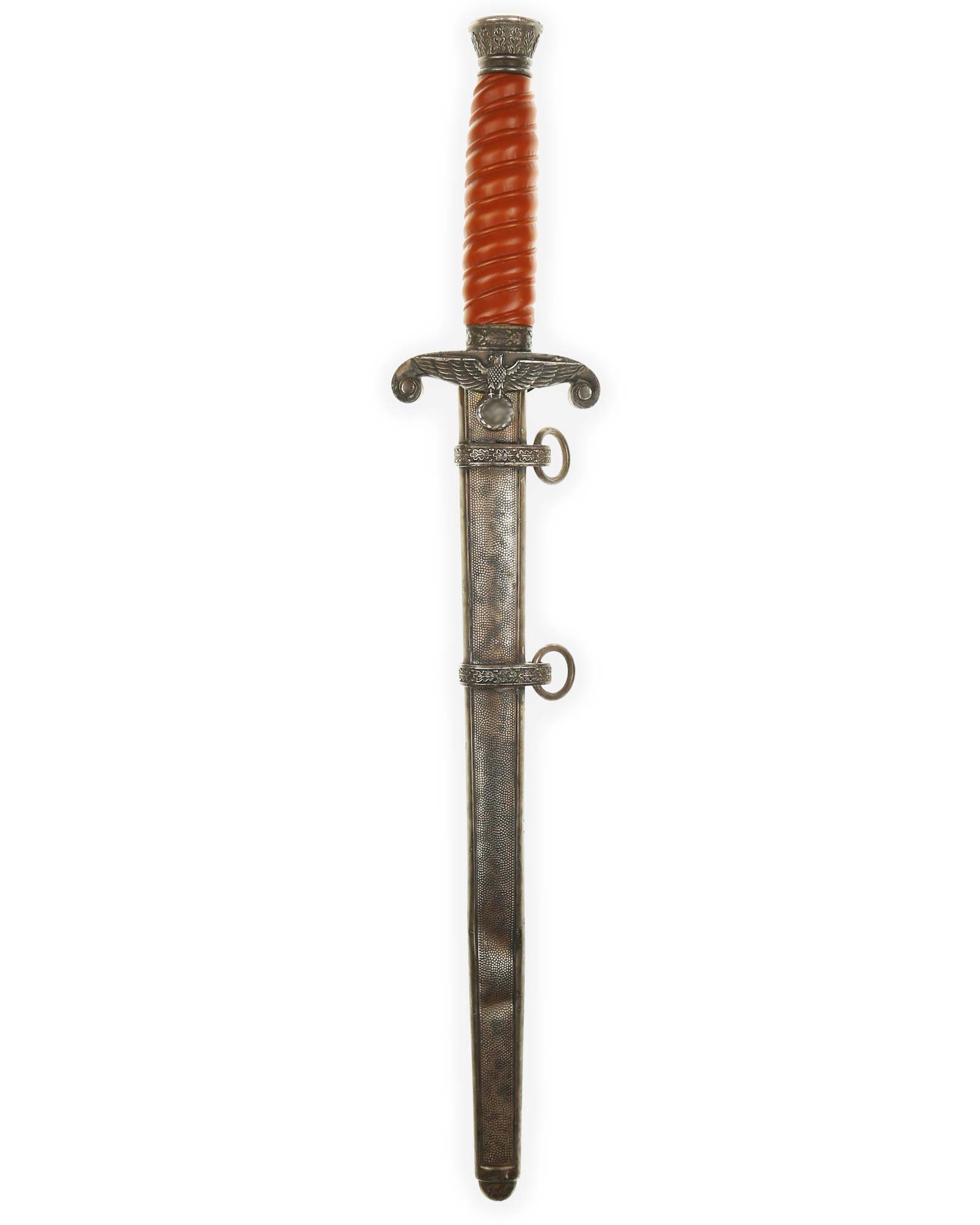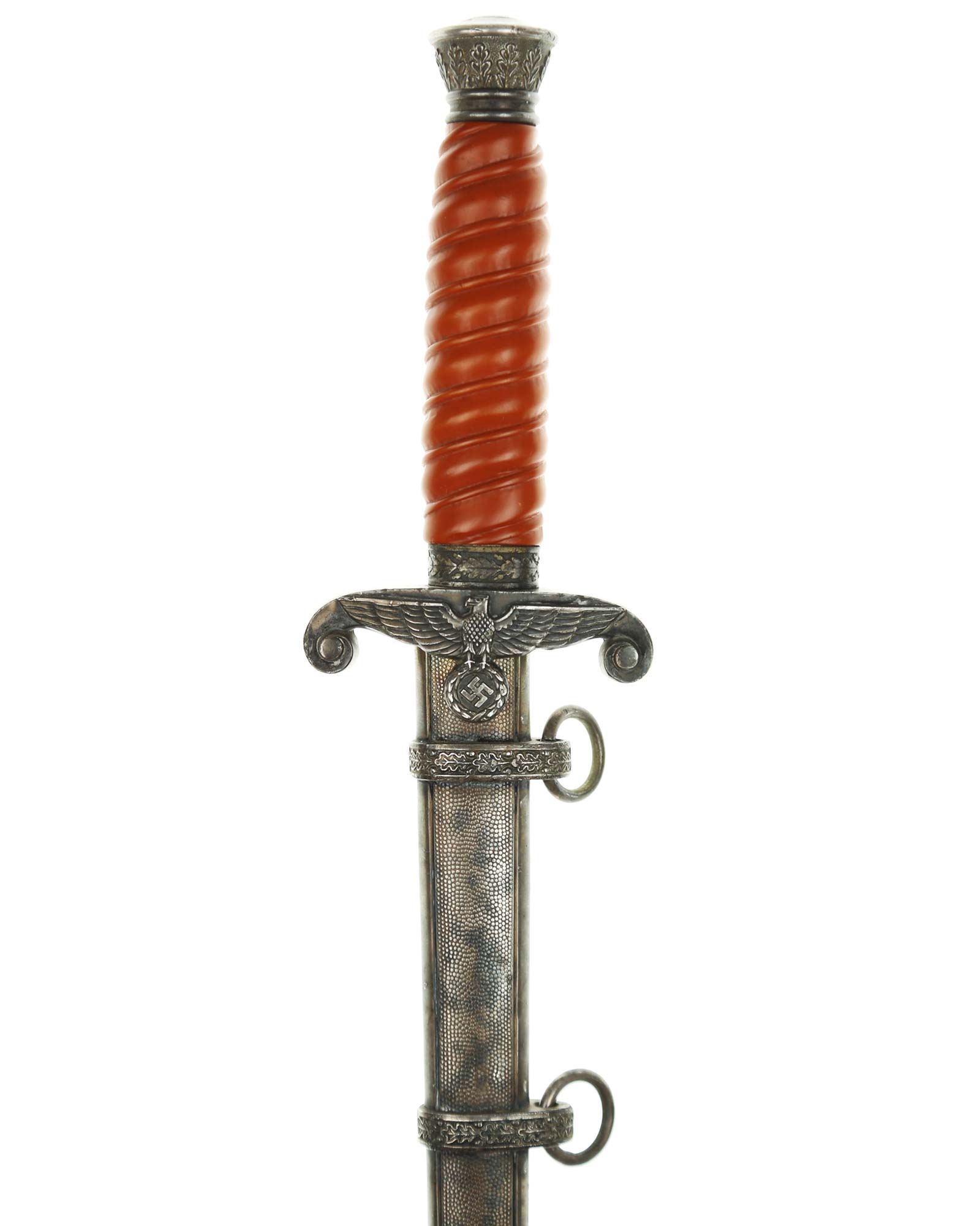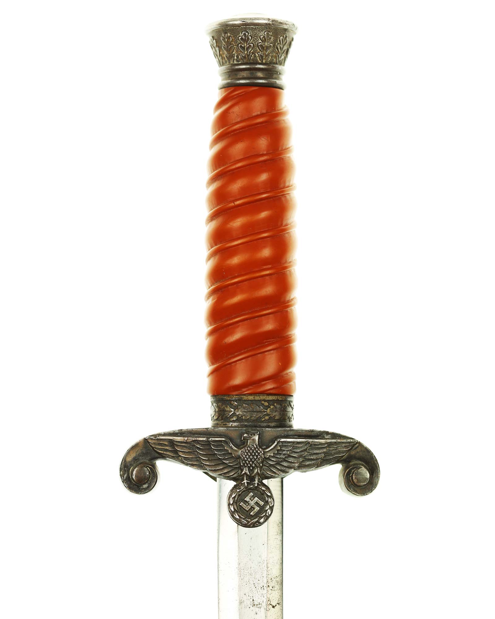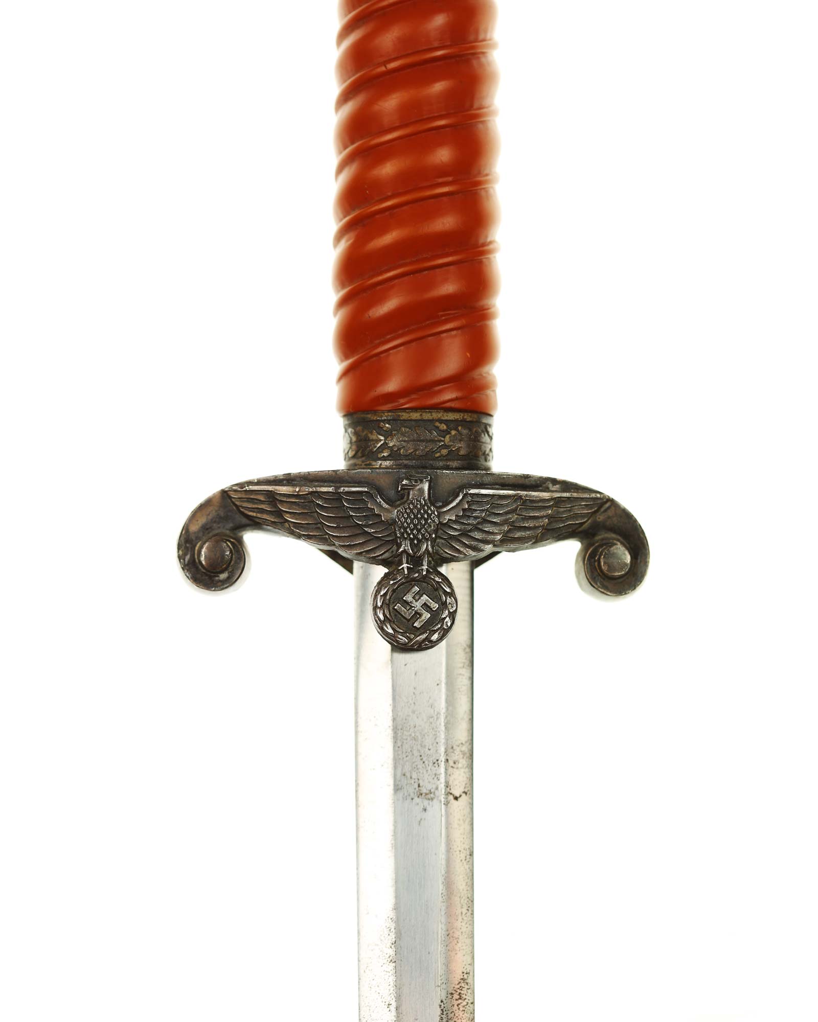 Рукоять: Рукоять из пластмассы, в сечении – овальная, с двойными поперечными желобками. Снизу на рукояти расположена металлическая втулка с изображениями дубовых листьев. Головка рукояти – литая, конической формы, имеет в нижней части два ободка, также украшена изображениями дубовых листьев. Крестовина кортика металлическая, литая, с симметричными концами, закругленными и загнутыми вниз. На перекрестье с лицевой стороны рельефное изображение германского орла, держащего в когтях венок со свастикой.