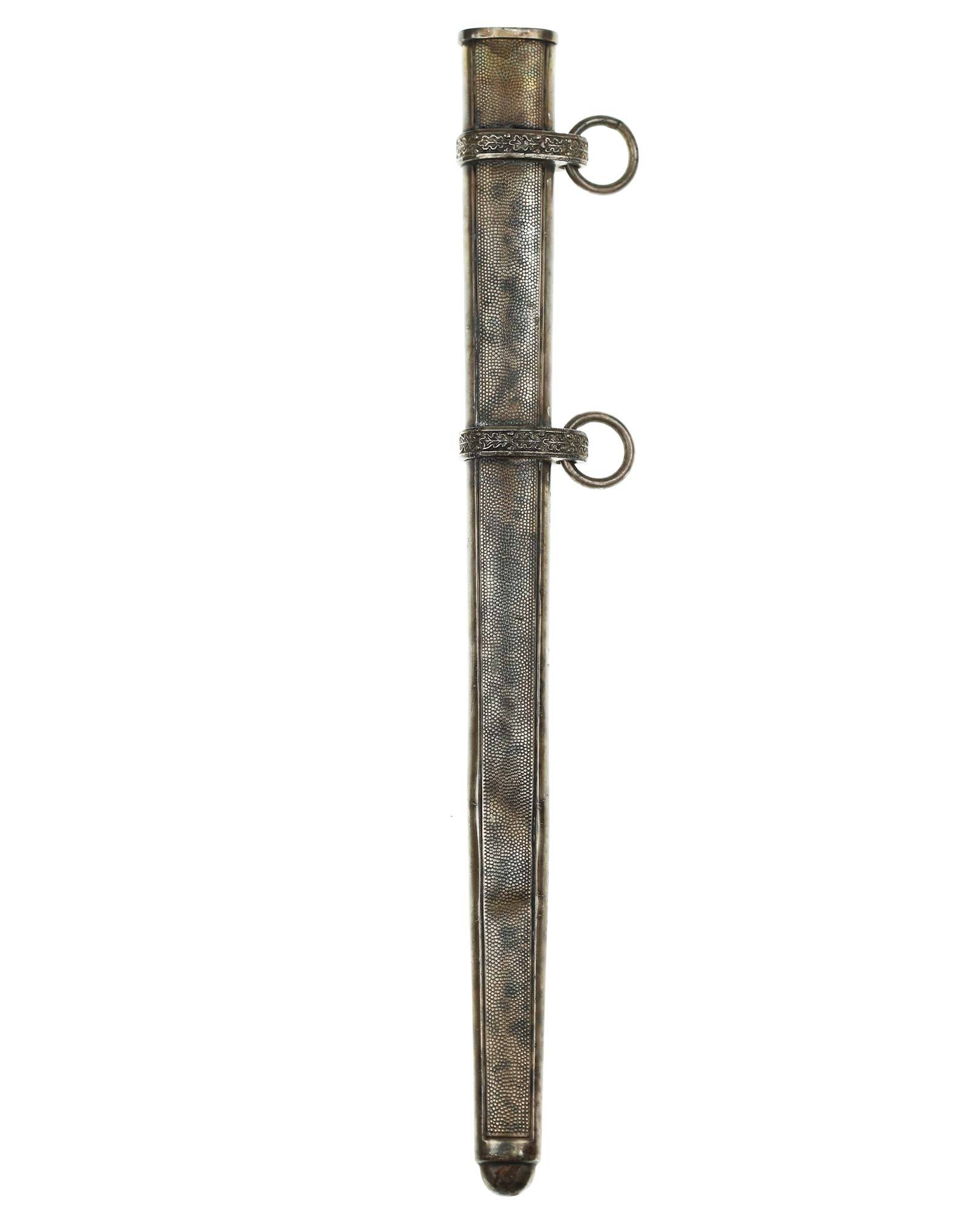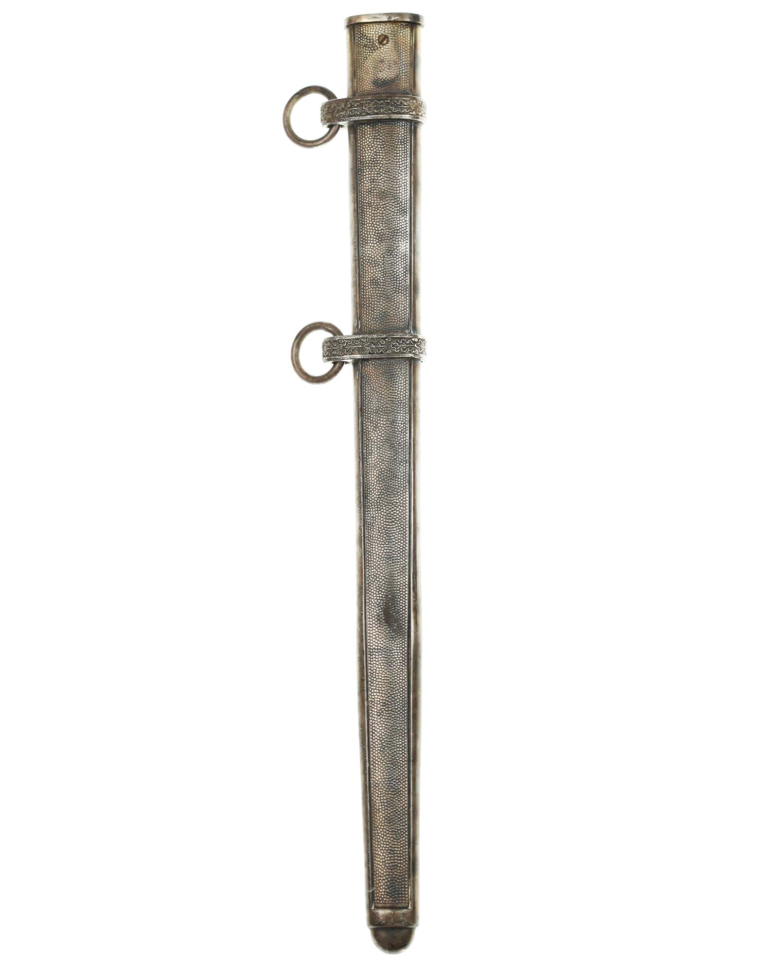 Ножны: Ножны металлические, имеющие с внешней и внутренней стороны мелкоточечную рифленую поверхность в линейной окантовке; прибор состоит из вставного устья; наконечник ножен выполнен в виде полуовала. Обоймицы (гайки) украшены рельефными изображениями дубовых листьев; на каждой обоймице (гайке) подвижно укреплено по одному кольцу. Металлические элементы эфеса и ножны посеребрены.