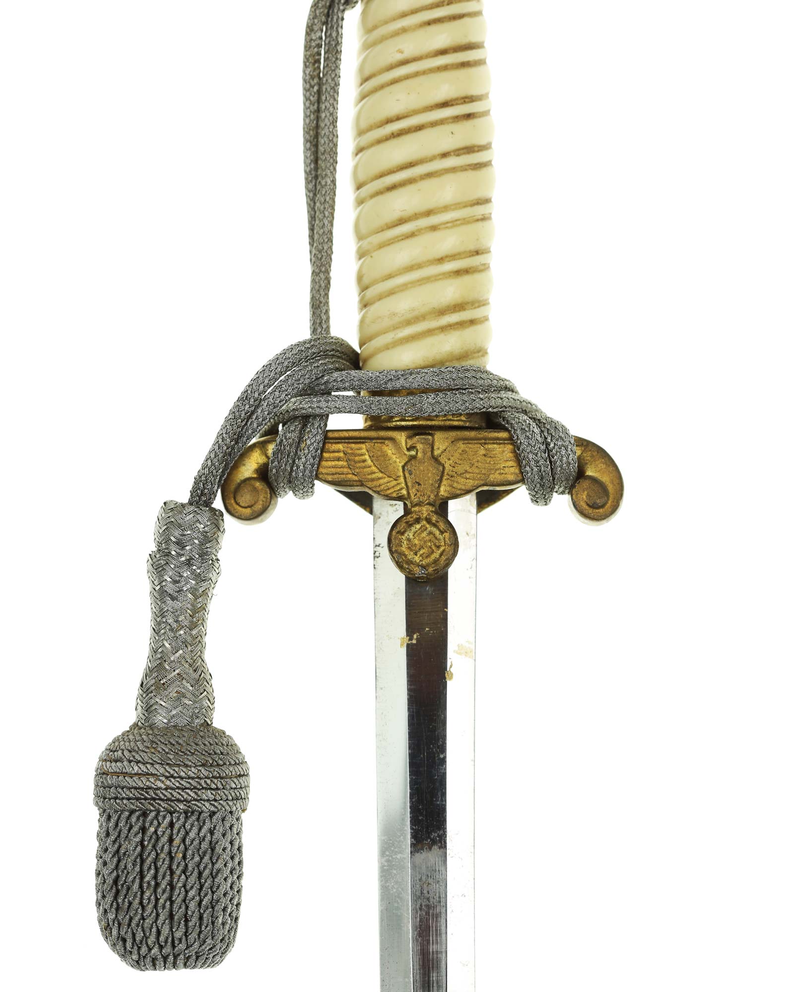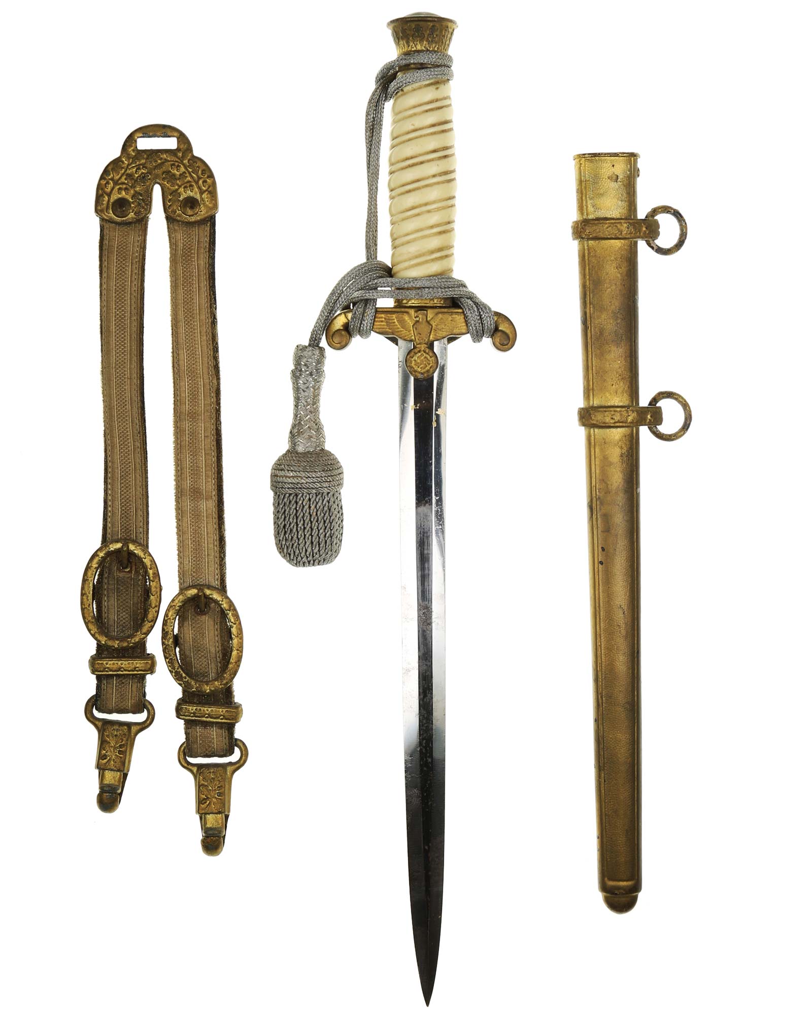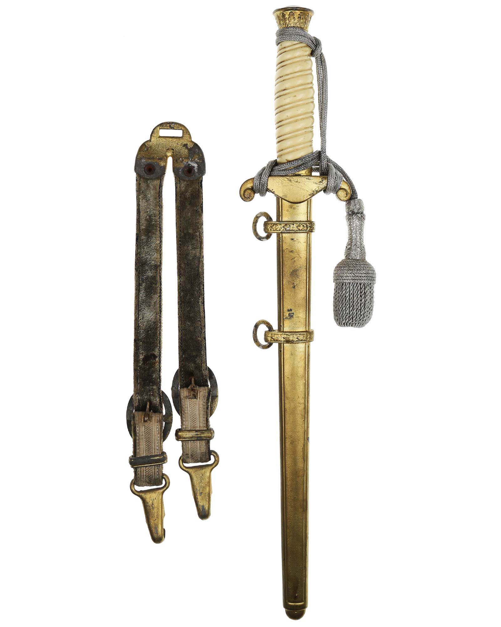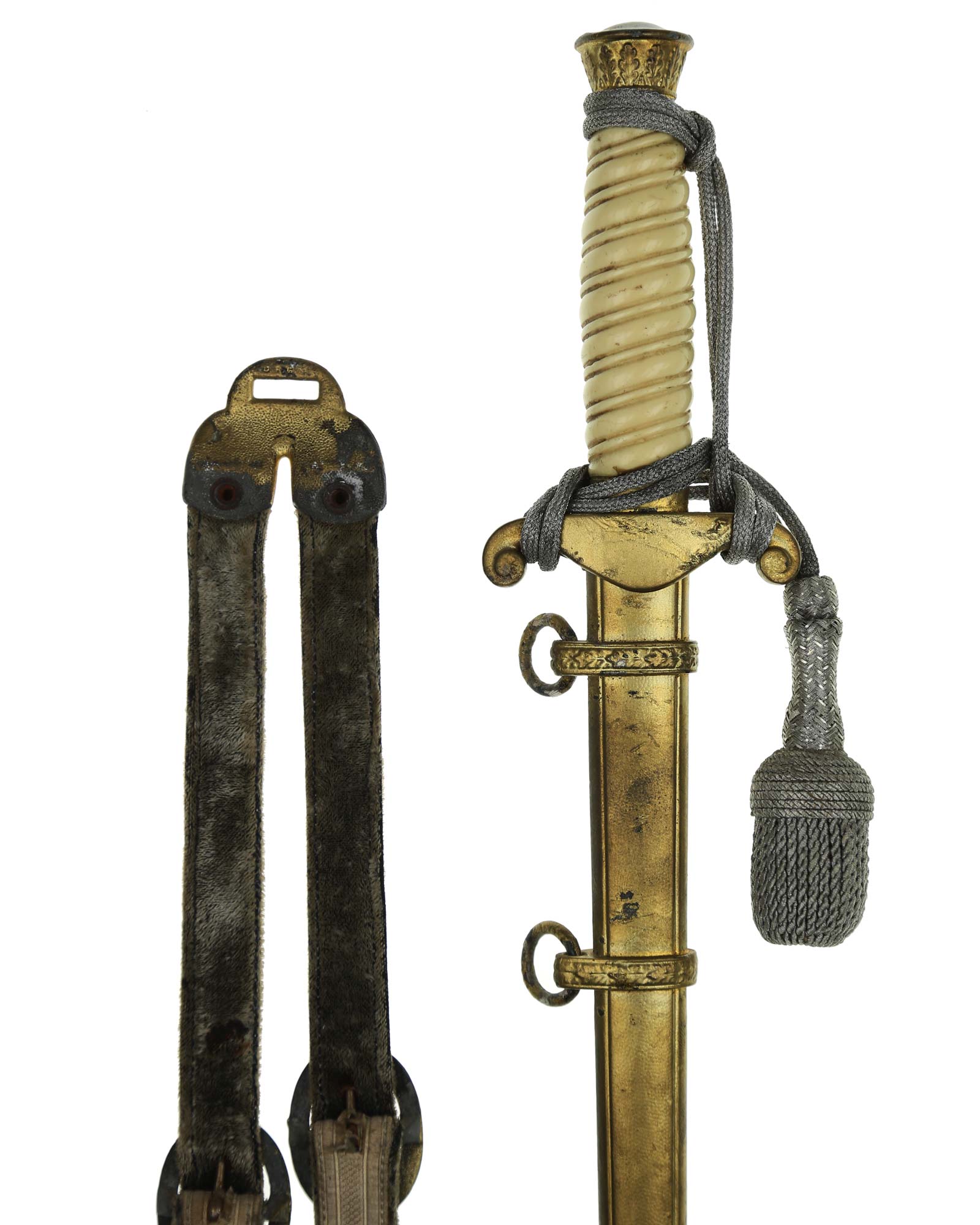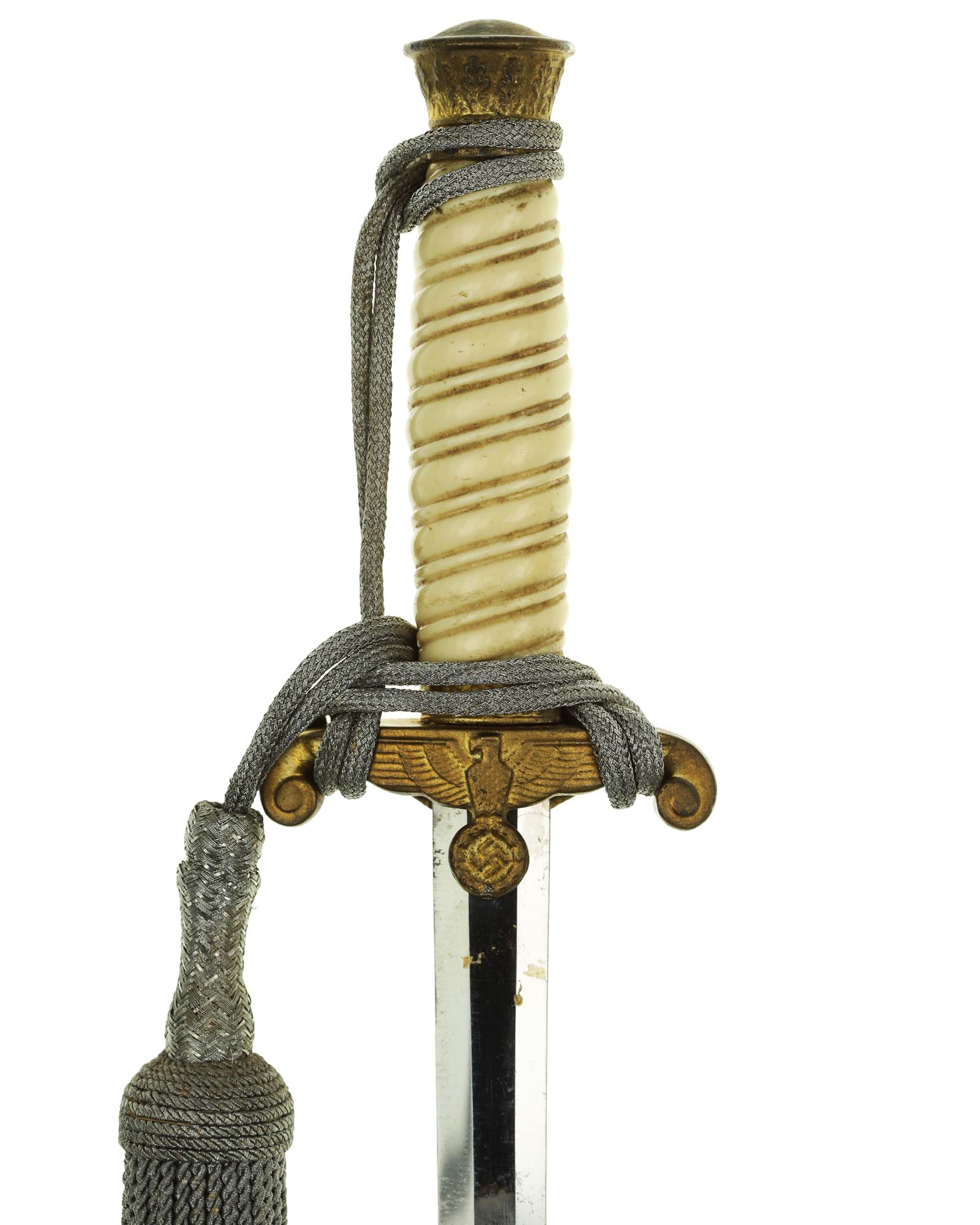 Рукоять: Рукоять кортика пластмассовая, белого цвета, в сечении – овальная, с двойными поперечными желобками. Снизу на рукояти расположена металлическая втулка с изображениями дубовых листьев. Головка рукояти – литая, конической формы, имеет в нижней части два ободка, также украшена изображениями дубовых листьев. Крестовина кортика металлическая, литая, с симметричными концами, закругленными и загнутыми вниз. На перекрестье с лицевой стороны рельефное изображение германского орла, держащего в когтях венок со свастикой.