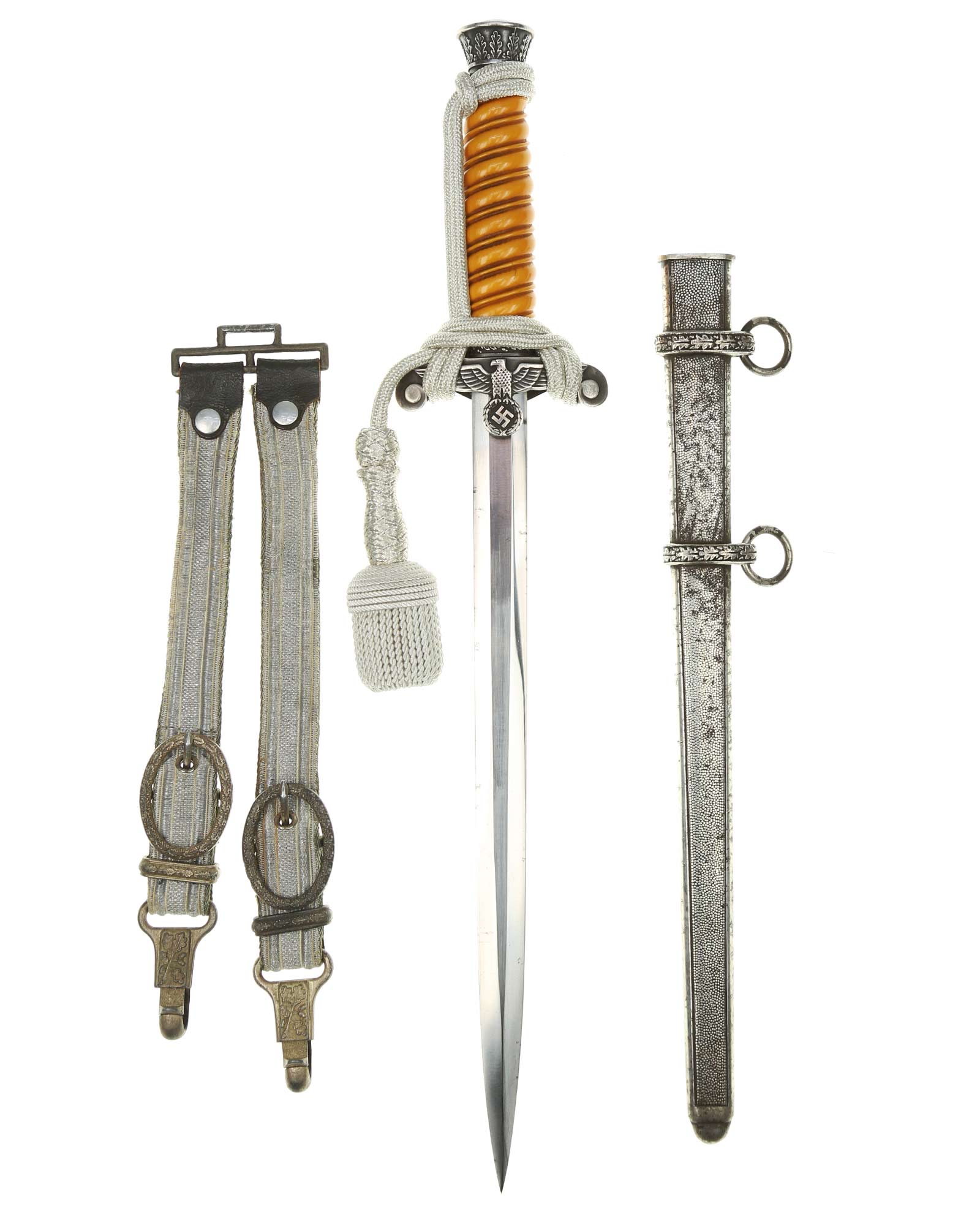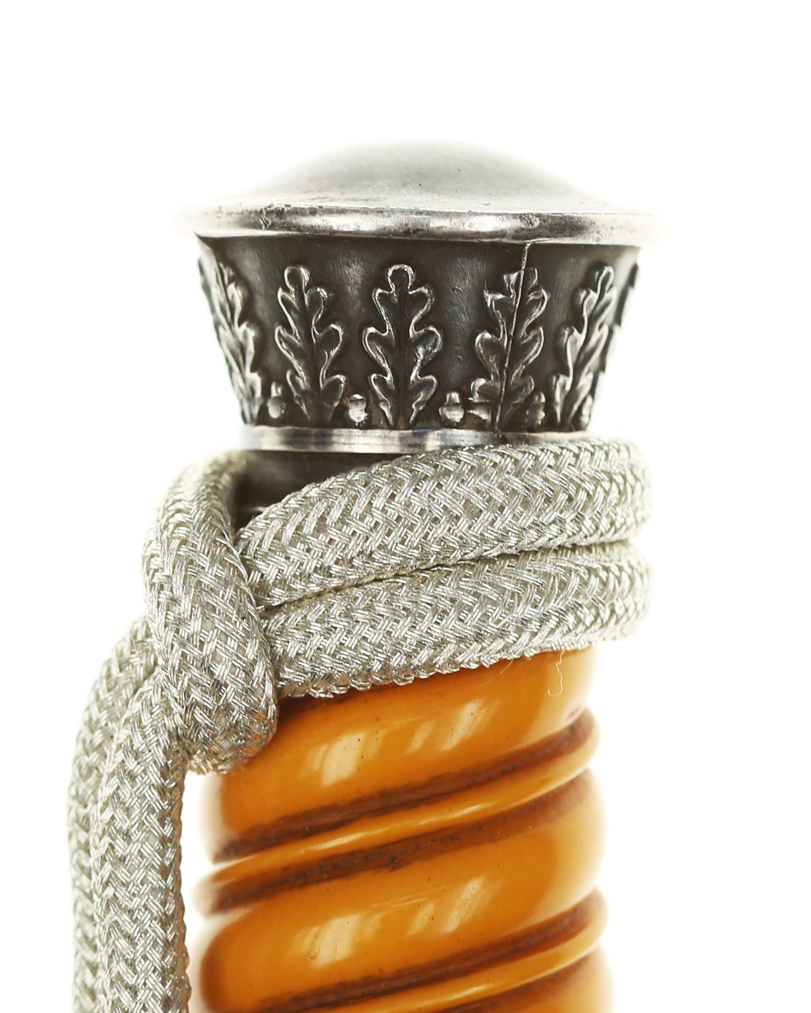 Рукоять: Рукоять кортика пластмассовая, в сечении – овальная, с двойными поперечными желобками. Снизу на рукояти расположена металлическая втулка с изображениями дубовых листьев. Головка рукояти – литая, конической формы, имеет в нижней части два ободка, также украшена изображениями дубовых листьев. Крестовина кортика металлическая, литая, с симметричными концами, закругленными и загнутыми вниз. На перекрестье с лицевой стороны рельефное изображение германского орла, держащего в когтях венок со свастикой.