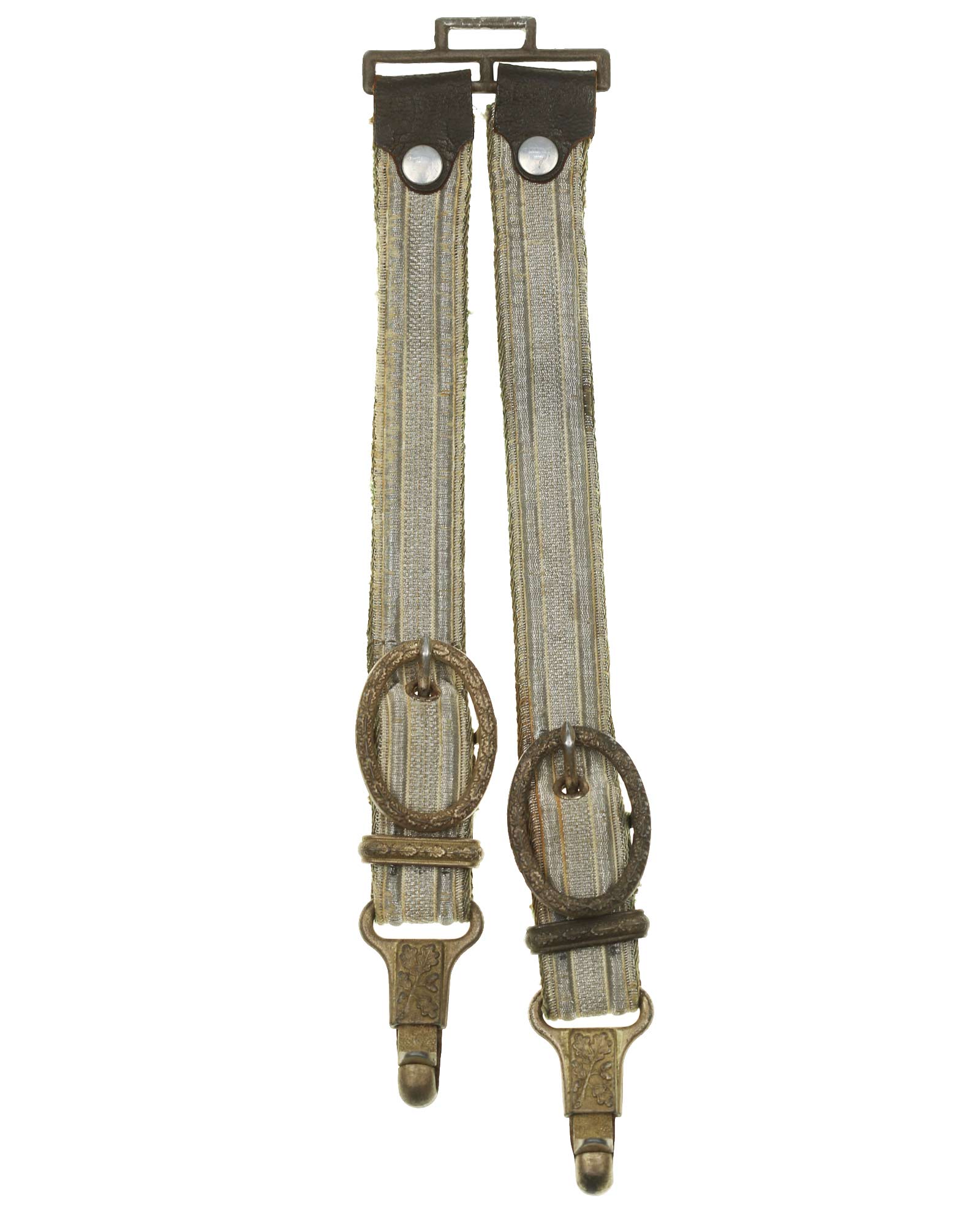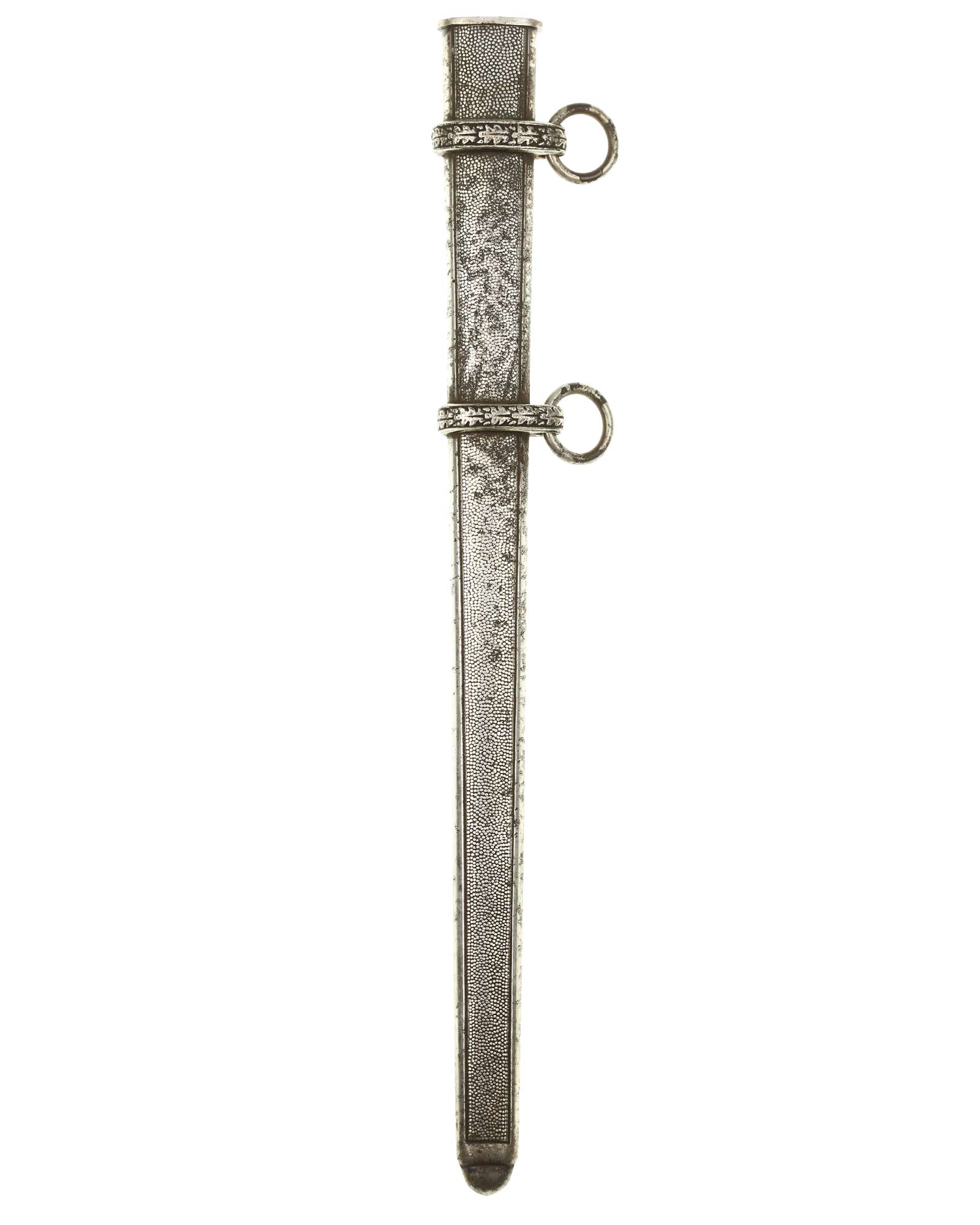 Ножны: Ножны металлические, имеющие с внешней и внутренней стороны мелкоточечную рифленую поверхность в линейной окантовке; прибор состоит из вставного устья; наконечник ножен выполнен в виде полуовала. Обоймицы (гайки) украшены рельефными изображениями дубовых листьев; на каждой обоймице (гайке) подвижно укреплено по одному кольцу. Металлические элементы эфеса и ножны посеребрены.