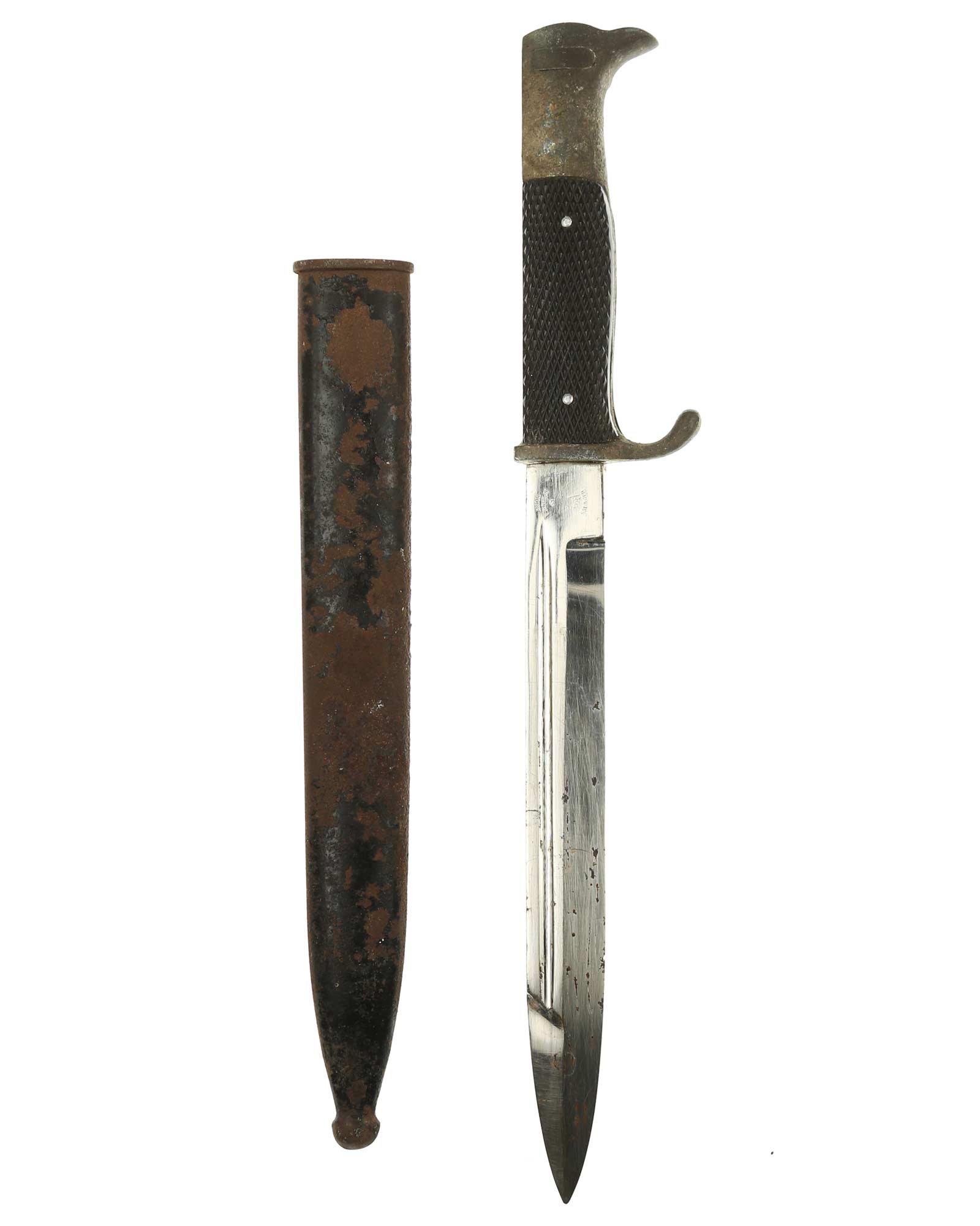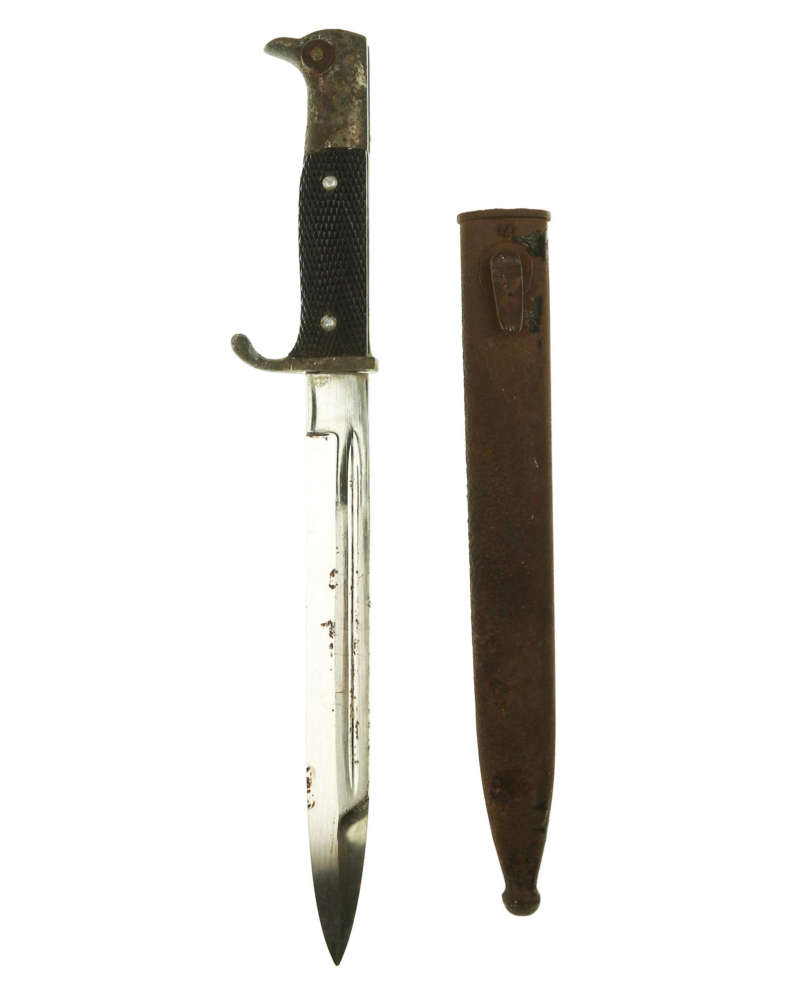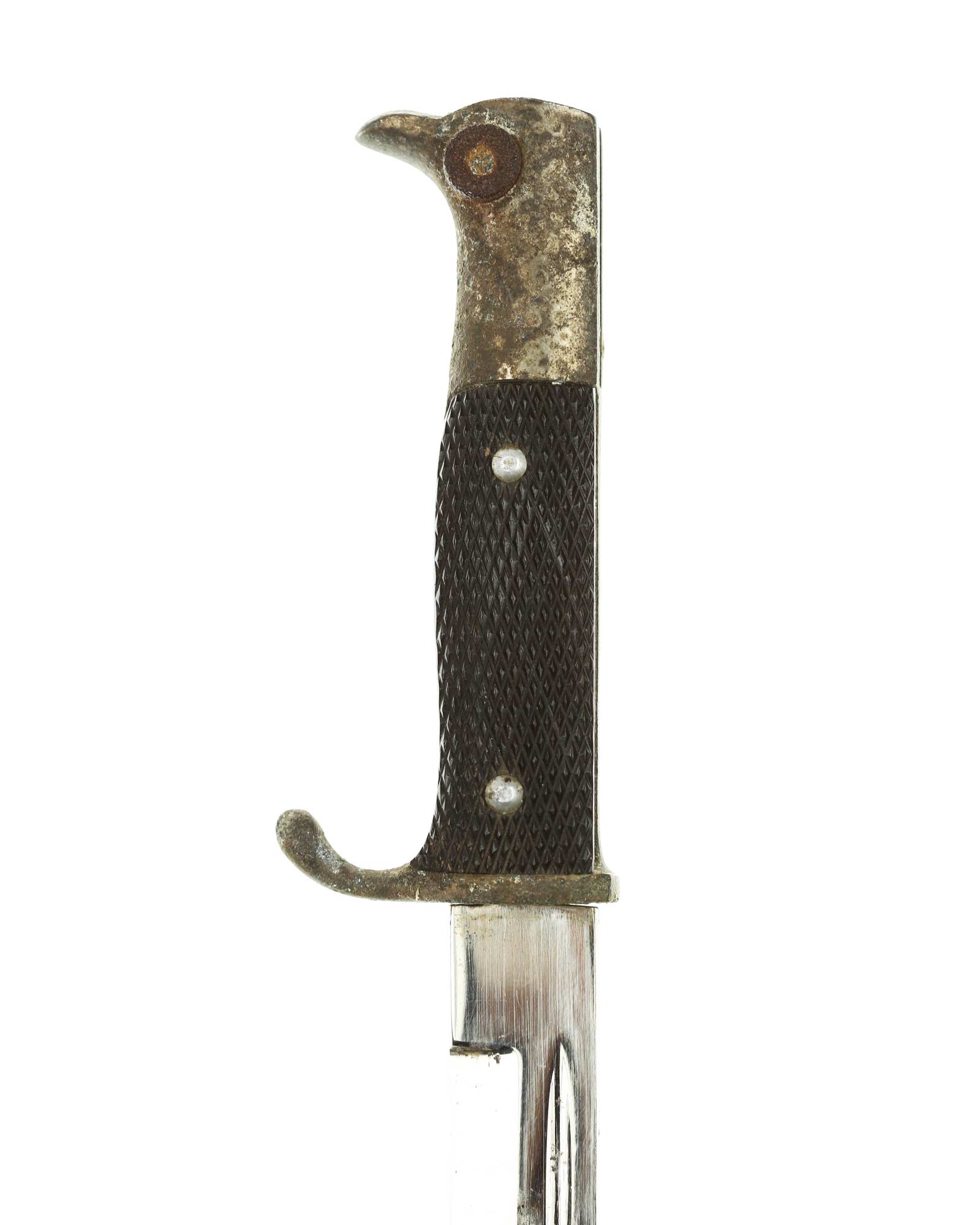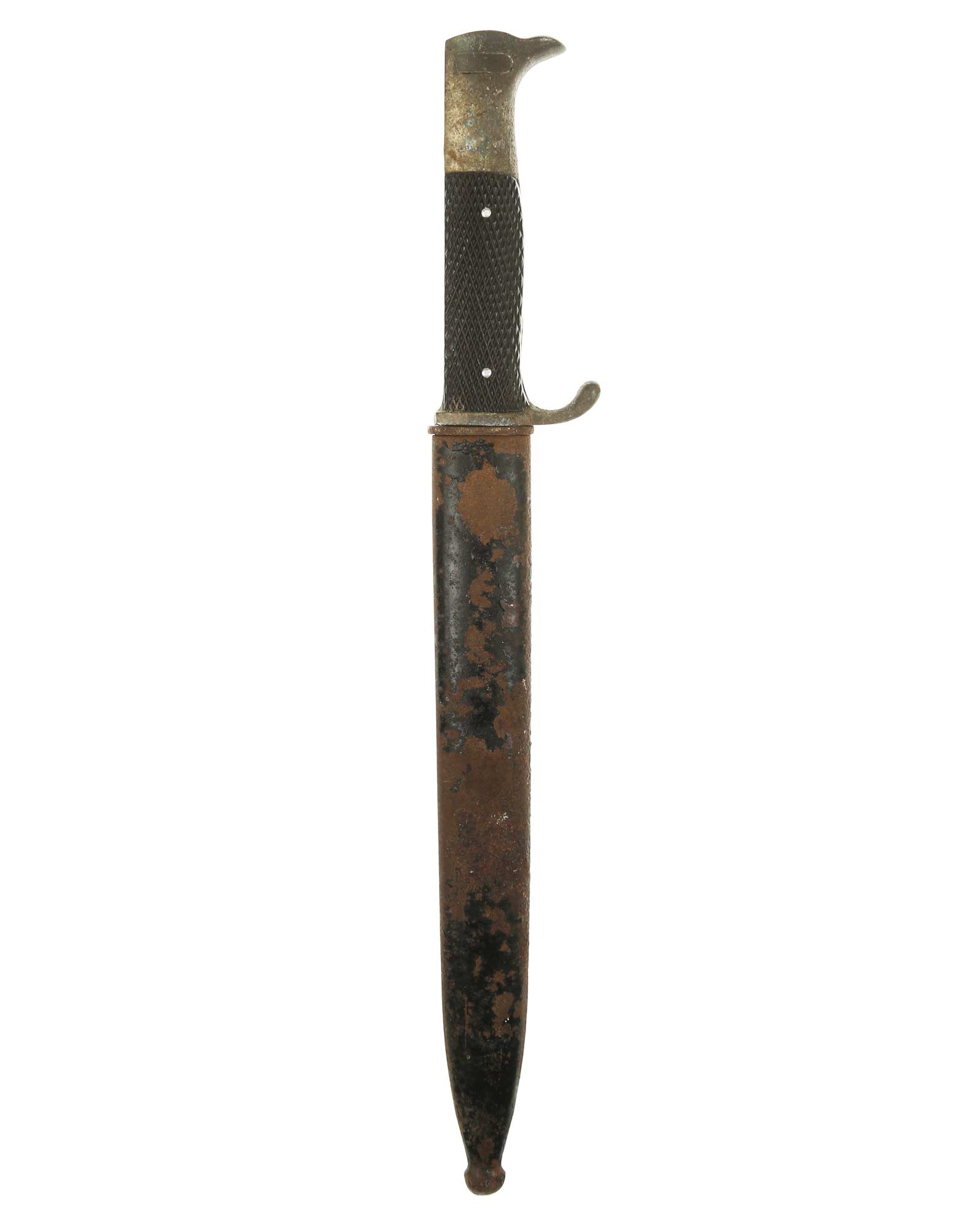 Штык внестроевой обр. 1933-45 гг. (тип KS98). Рукоять образована двумя пластмассовыми рифлеными щечками, скрепленными с хвостовиком клинка заклепками. Головка рукояти стилизована под птичью голову. Клинок прямой, стальной, однолезвийный, с долом на каждой стороне и пилой на обухе. Ножны стальные, с крючком и шариком на конце. На пяте клинка имеется клеймо известного производителя - Anton Wingen Solingen, клеймо немецкой фирмы «Антон Винген» Золинген.