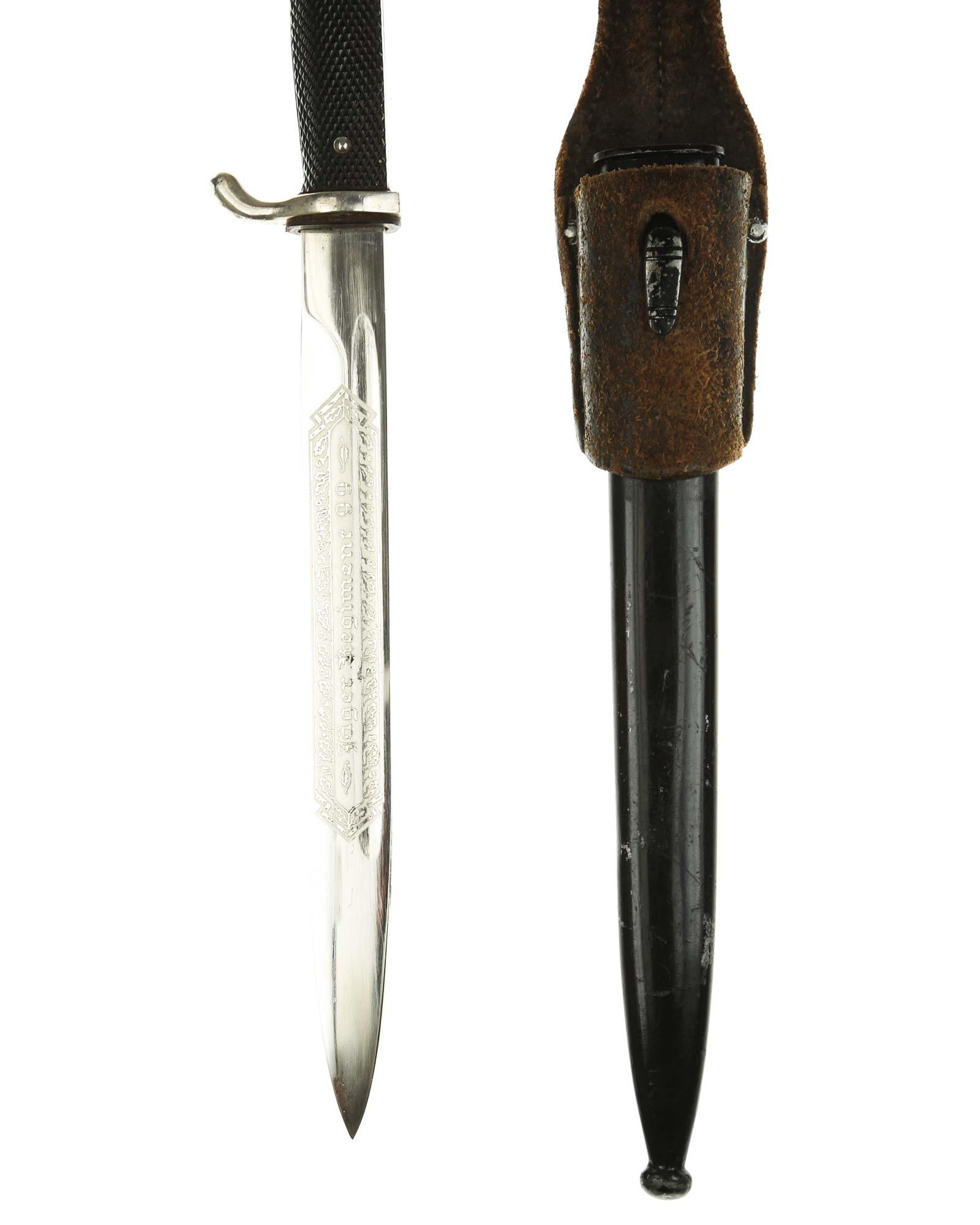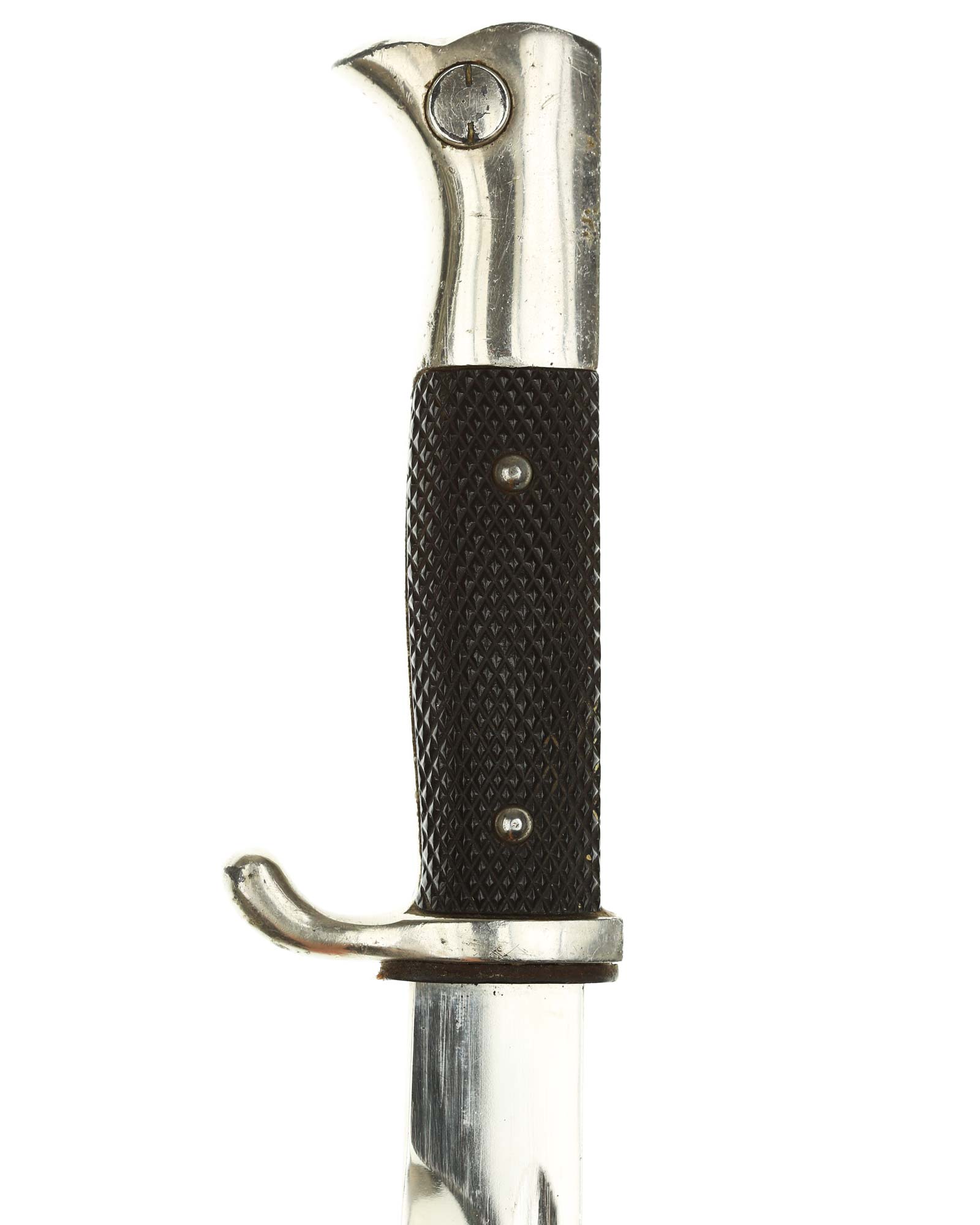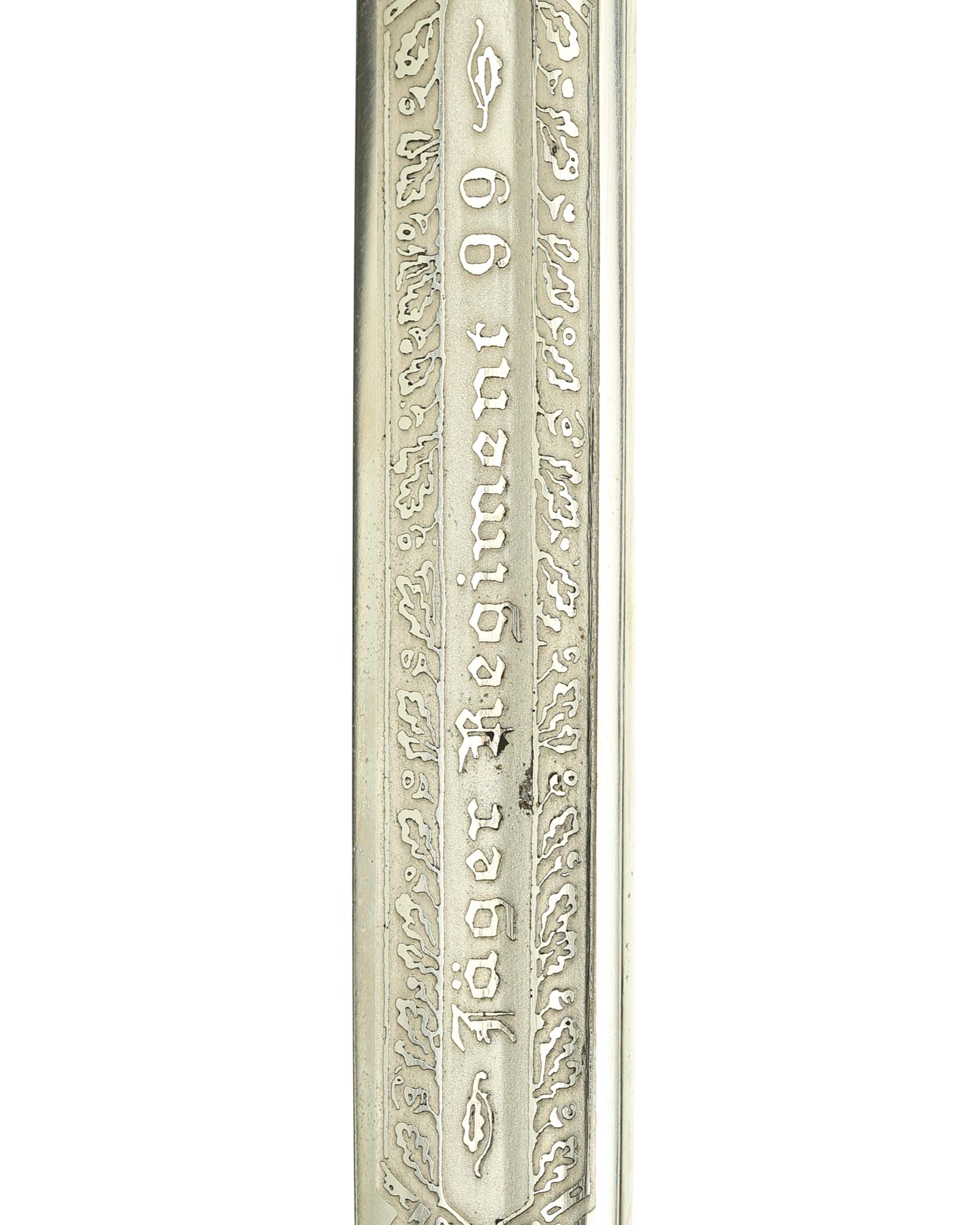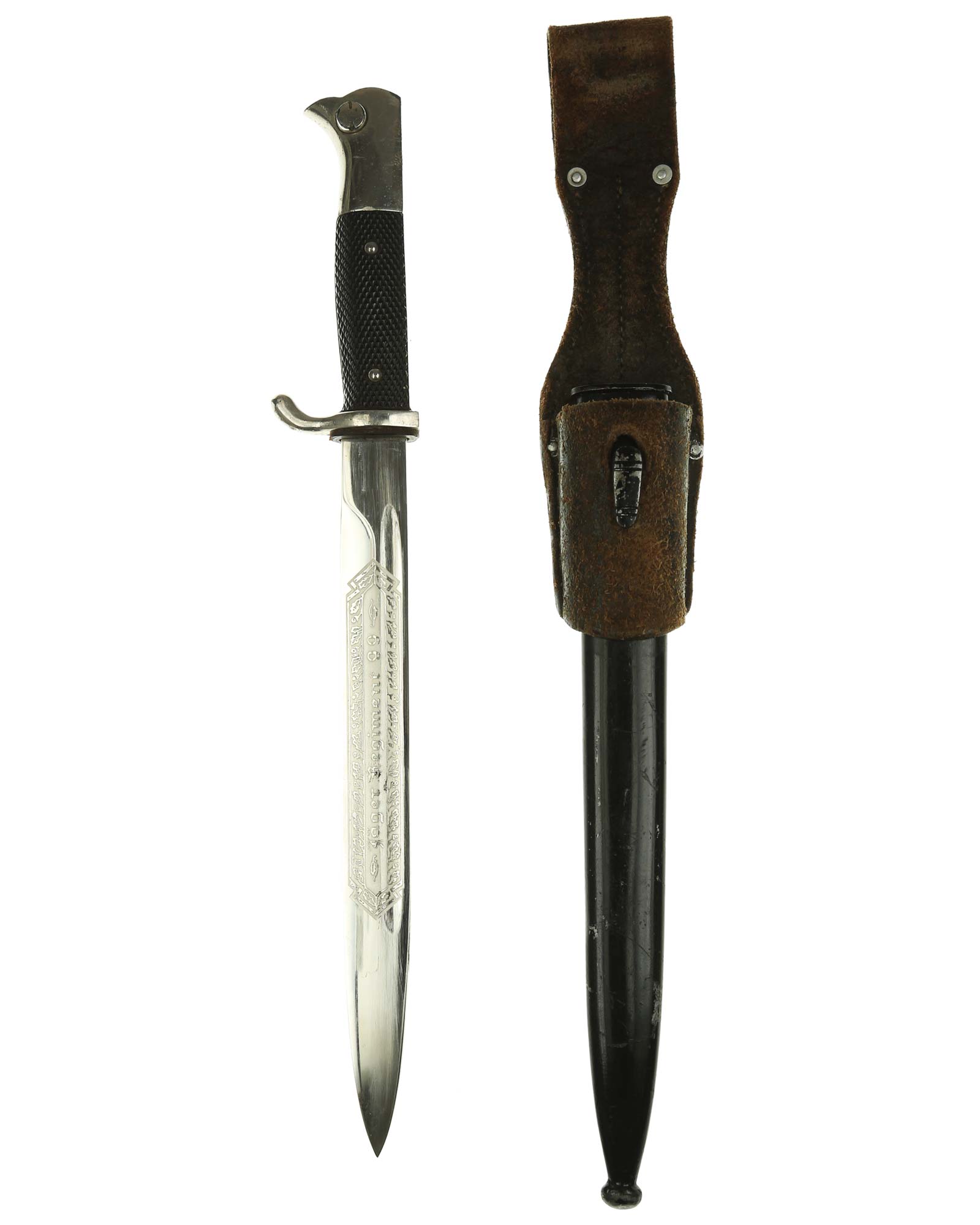 Парадный (внестроевой) штык к винтовке Маузер с травленым украшенным клинком. Клинок никелированный с красиво оформленной травленой готической надписью: "Jäger Regiment 99" - "Охотник полка 99". На пяте клинка имеется клеймо известного производителя - F.W. Höller Solingen, клеймо немецкой фирмы «Ф.В. Хёллер» Золинген. Элементы рукояти также никелированные, щечки изготовлены из черной рифленой пластмассы. Ножны металлические, выкрашенные в черный цвет.
