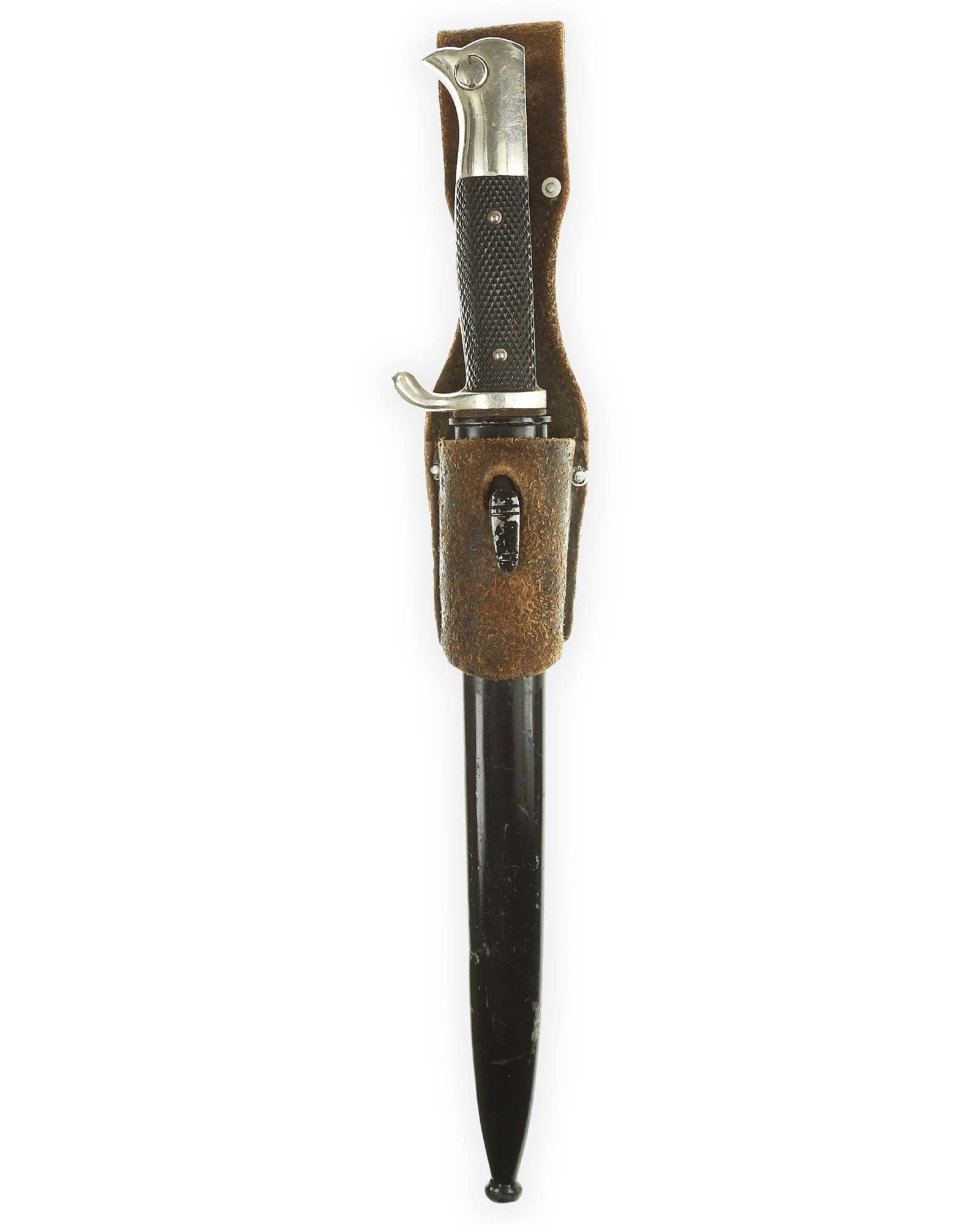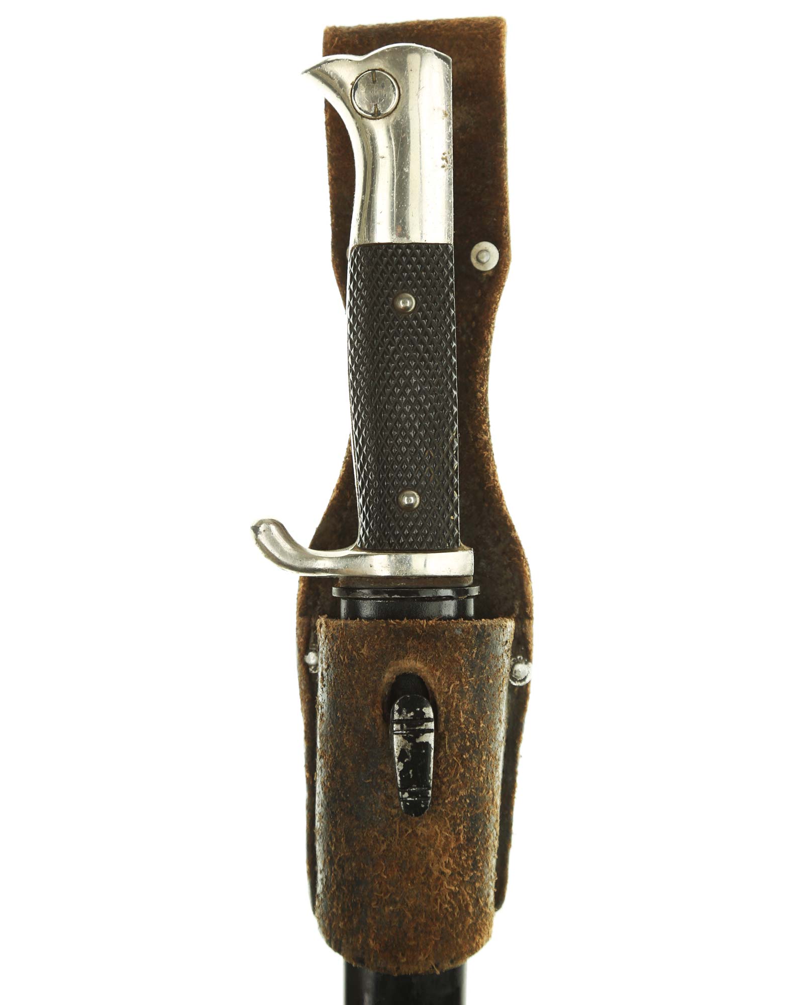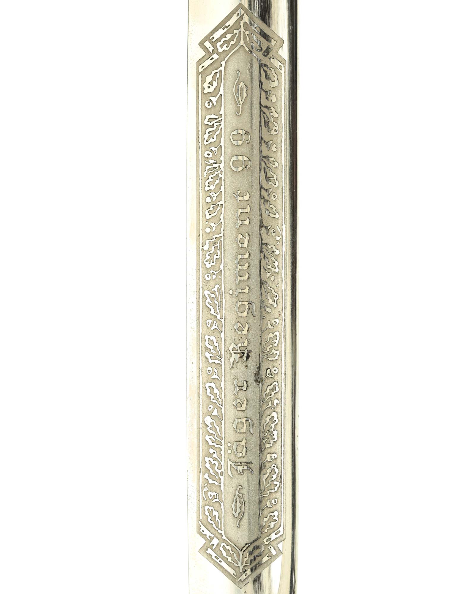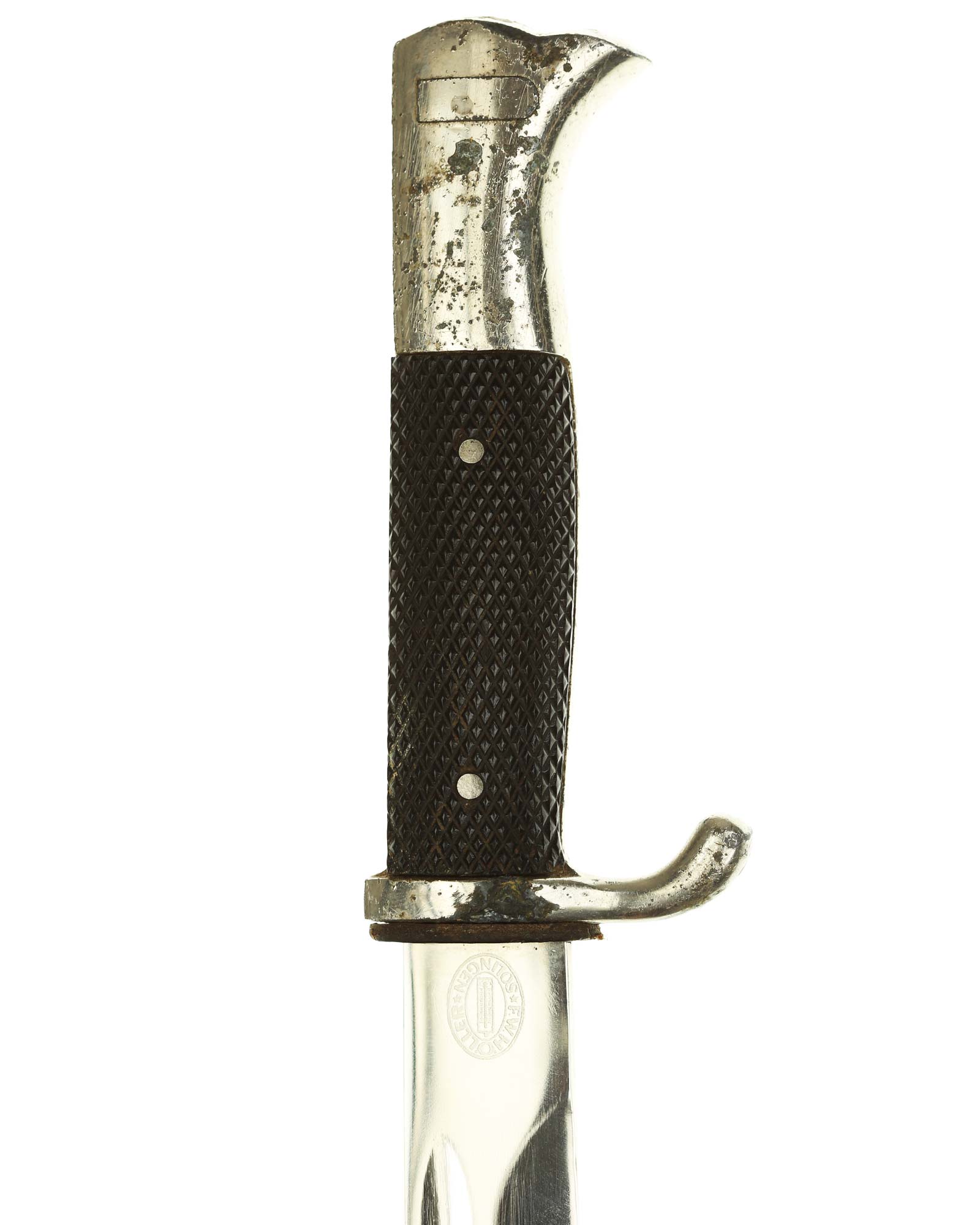 Парадный (внестроевой) штык к винтовке Маузер с травленым украшенным клинком. Клинок никелированный с красиво оформленной травленой готической надписью: "Jäger Regiment 99" - "Охотник полка 99". На пяте клинка имеется клеймо известного производителя - F.W. Höller Solingen, клеймо немецкой фирмы «Ф.В. Хёллер» Золинген. Элементы рукояти также никелированные, щечки изготовлены из черной рифленой пластмассы. Ножны металлические, выкрашенные в черный цвет.