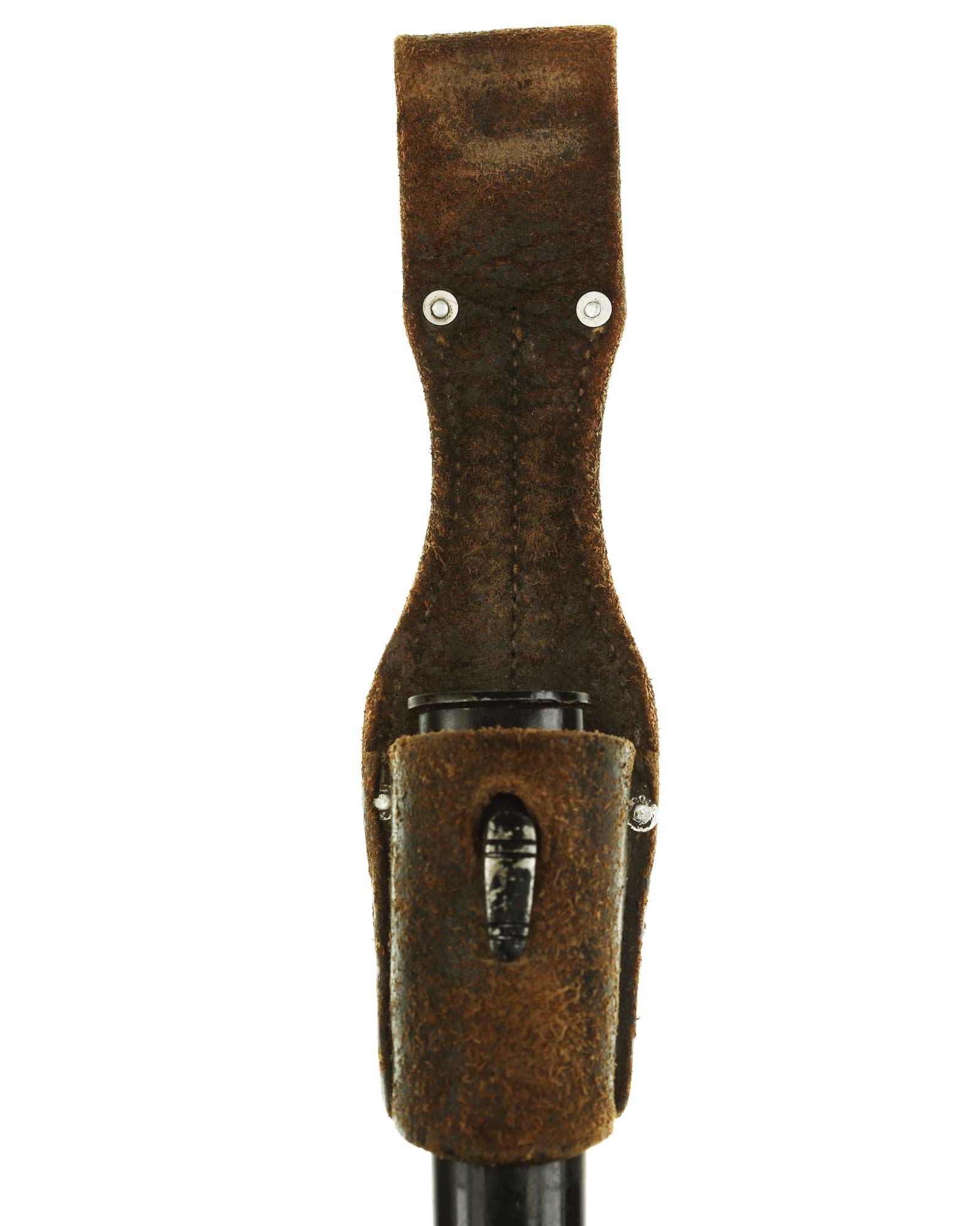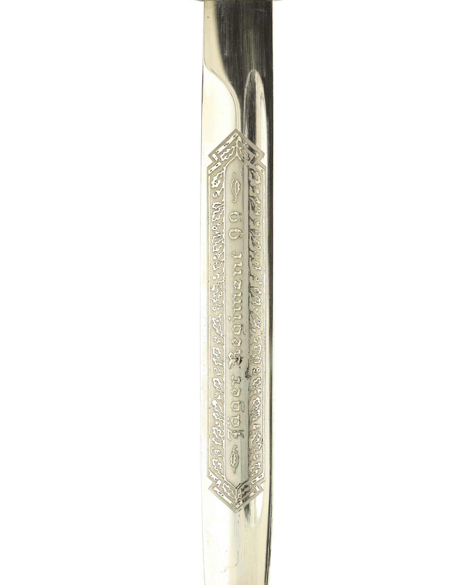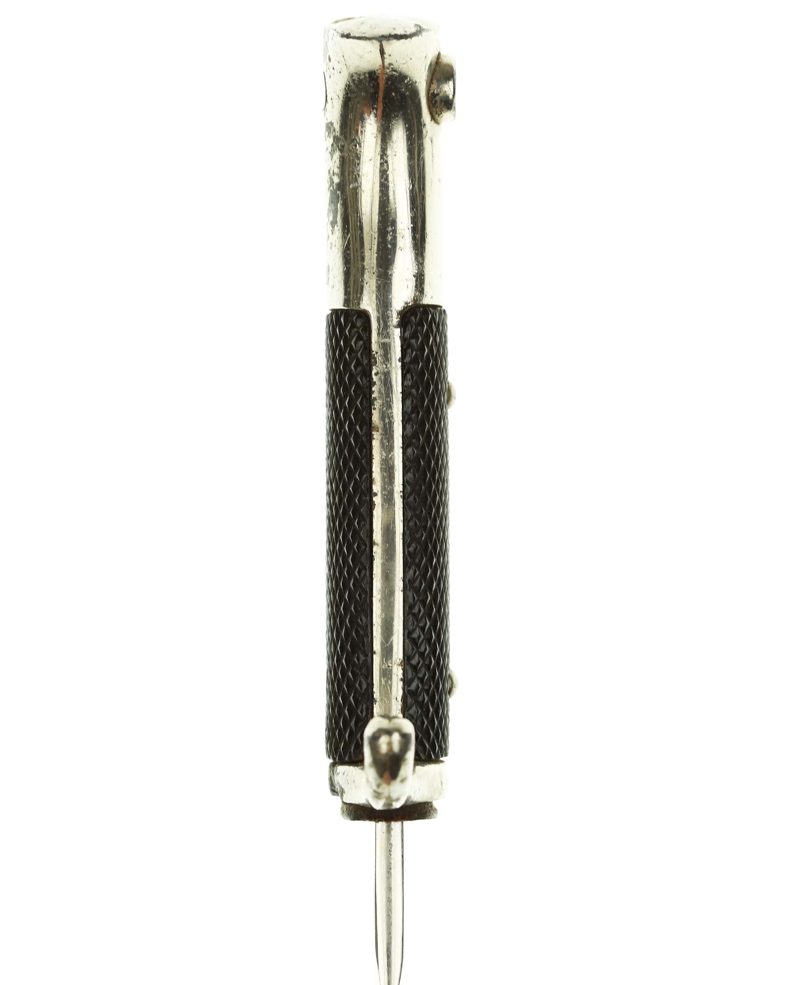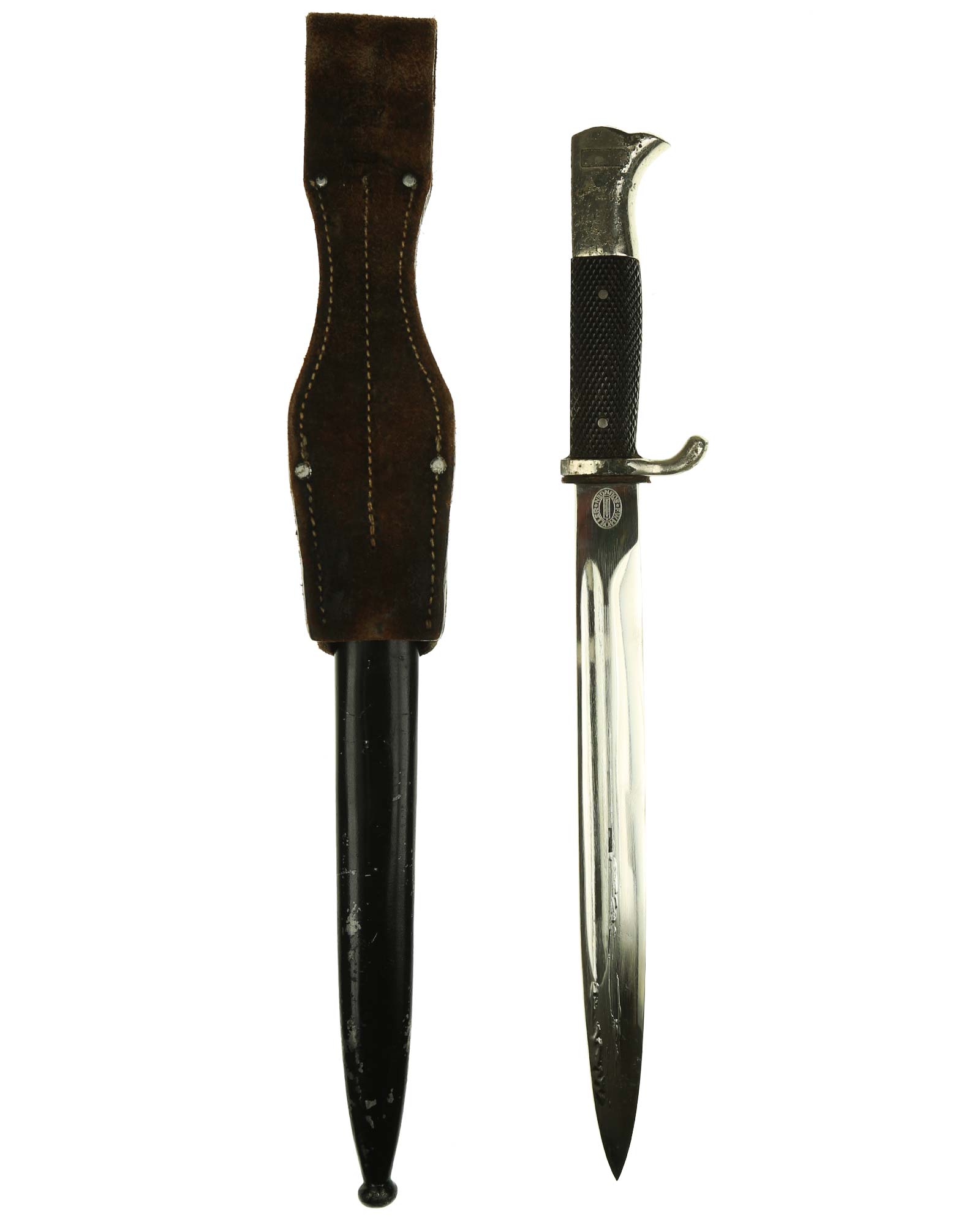 Парадный (внестроевой) штык к винтовке Маузер с травленым украшенным клинком. Клинок никелированный с красиво оформленной травленой готической надписью: "Jäger Regiment 99" - "Охотник полка 99". На пяте клинка имеется клеймо известного производителя - F.W. Höller Solingen, клеймо немецкой фирмы «Ф.В. Хёллер» Золинген. Элементы рукояти также никелированные, щечки изготовлены из черной рифленой пластмассы. Ножны металлические, выкрашенные в черный цвет.