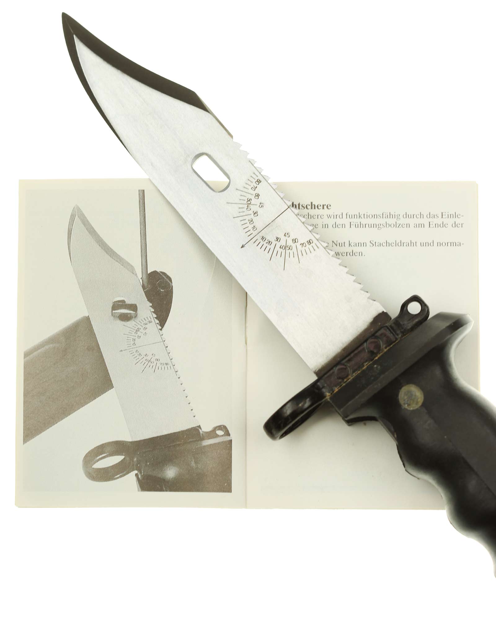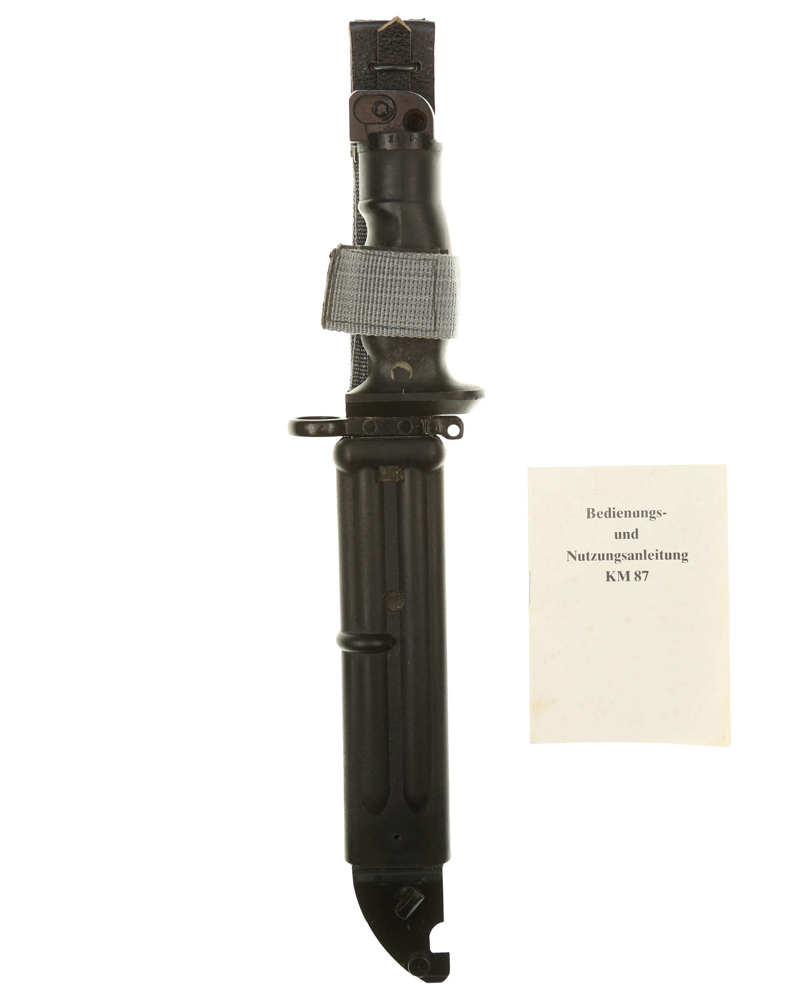 Штык-нож АК (боевой нож СВА КМ87) с ножнами. Пластиковая ручка. Общая длина 33,0 см. Однолезвийный клинок. Общий вес 457 г. Общая длина: 330 мм. состояние 1. Штык-нож КМ-87 (Kampfmesser-87, что буквально переводится как «Боевой нож – 87») был разработан для армии ГДР в 1987 году для использования с автоматом MPi-AK-74N, немецкой копией советского АК-74. Штык-нож также мог примыкаться и к предыдущим моделям автомата системы Калашникова, начиная с MPi KM/АКМ. Штык-нож КМ-87 представлял собой комбинацию штыка-ножа и ножа для выживания. Рукоять пластмассовая, полая, с утолщениями для более удобного обхвата. В рукояти расположен контейнер с набором для выживания. Клинок штыка однолезвийный, с пилой на обухе (20 двойных зубцов). Боевой конец двулезвийный, с вогнутым лезвием со стороны обуха клинка. В передней части клинка имеется прямоугольное отверстие, которое позволяет крепить штык к ножнам и использовать эту конструкцию как кусачки. На клинке также имеется выгравированная 5-ти сантиметровая линейка с ценой деления 1 мм и транспортир (угломер), который можно использовать как простейший квадрант. Крестовина с кольцом со стороны лезвия клинка. В головке рукояти Т-образный паз и пружинная защёлка с внутренним расположением спиральной пружины. Головка рукояти отвинчивается, обеспечивая доступ к контейнеру внутри рукояти.
