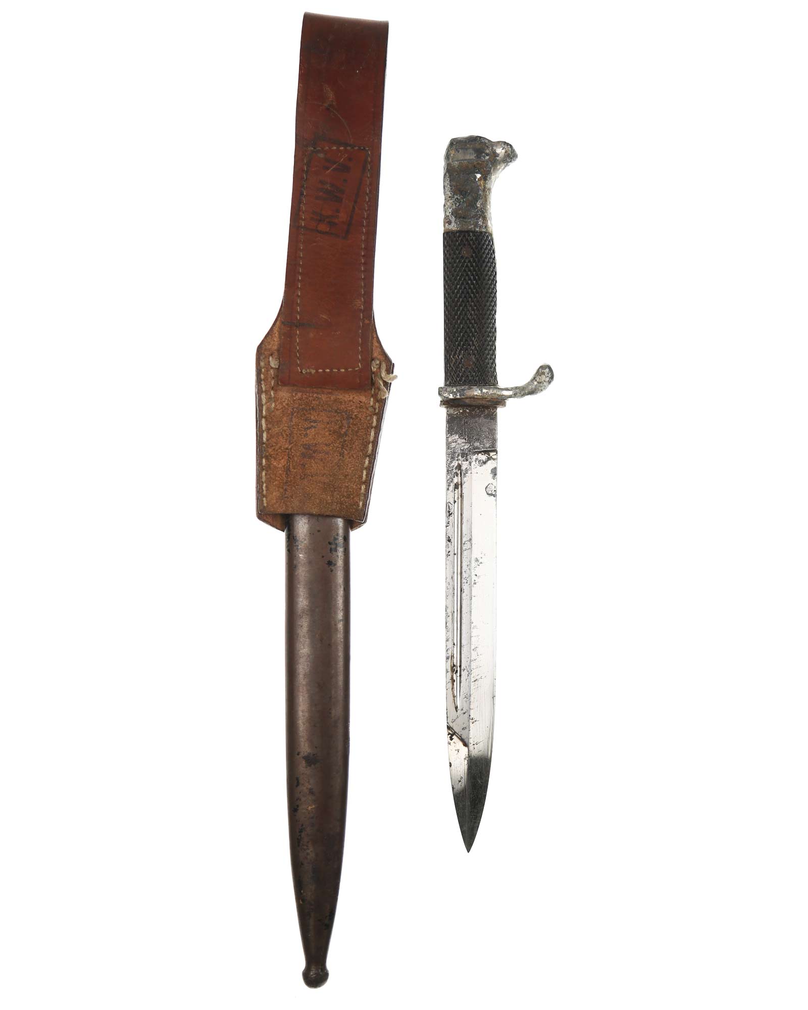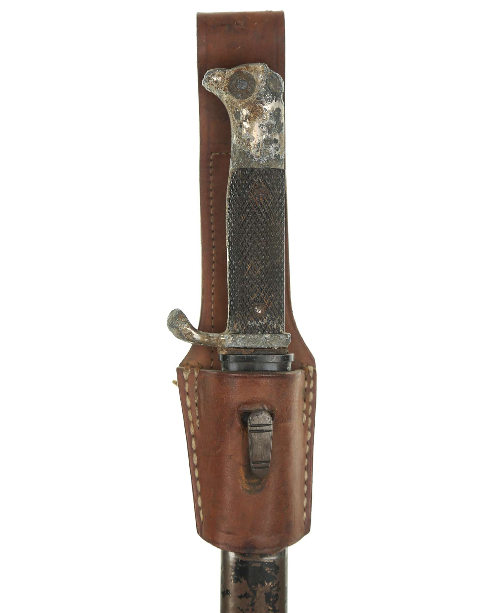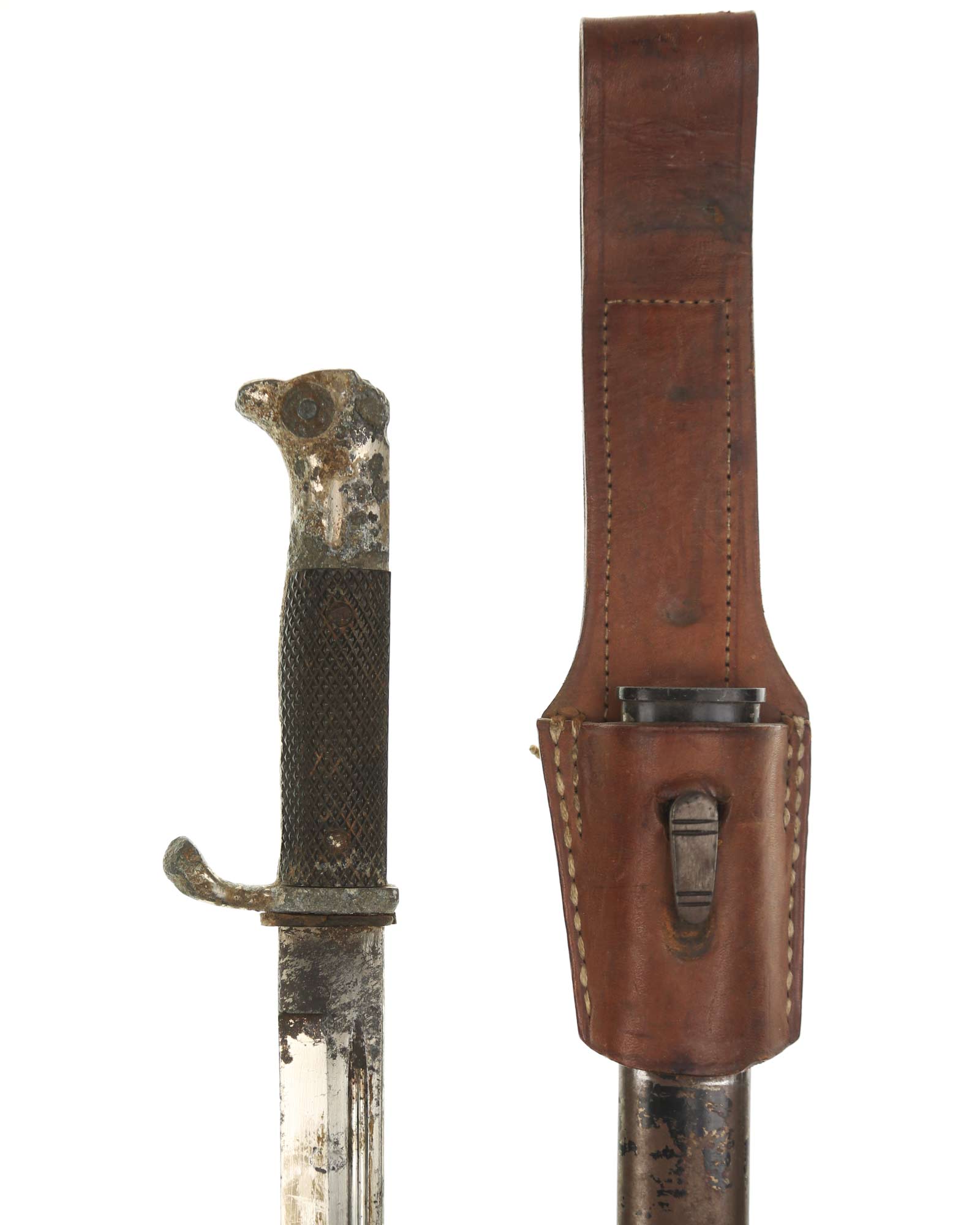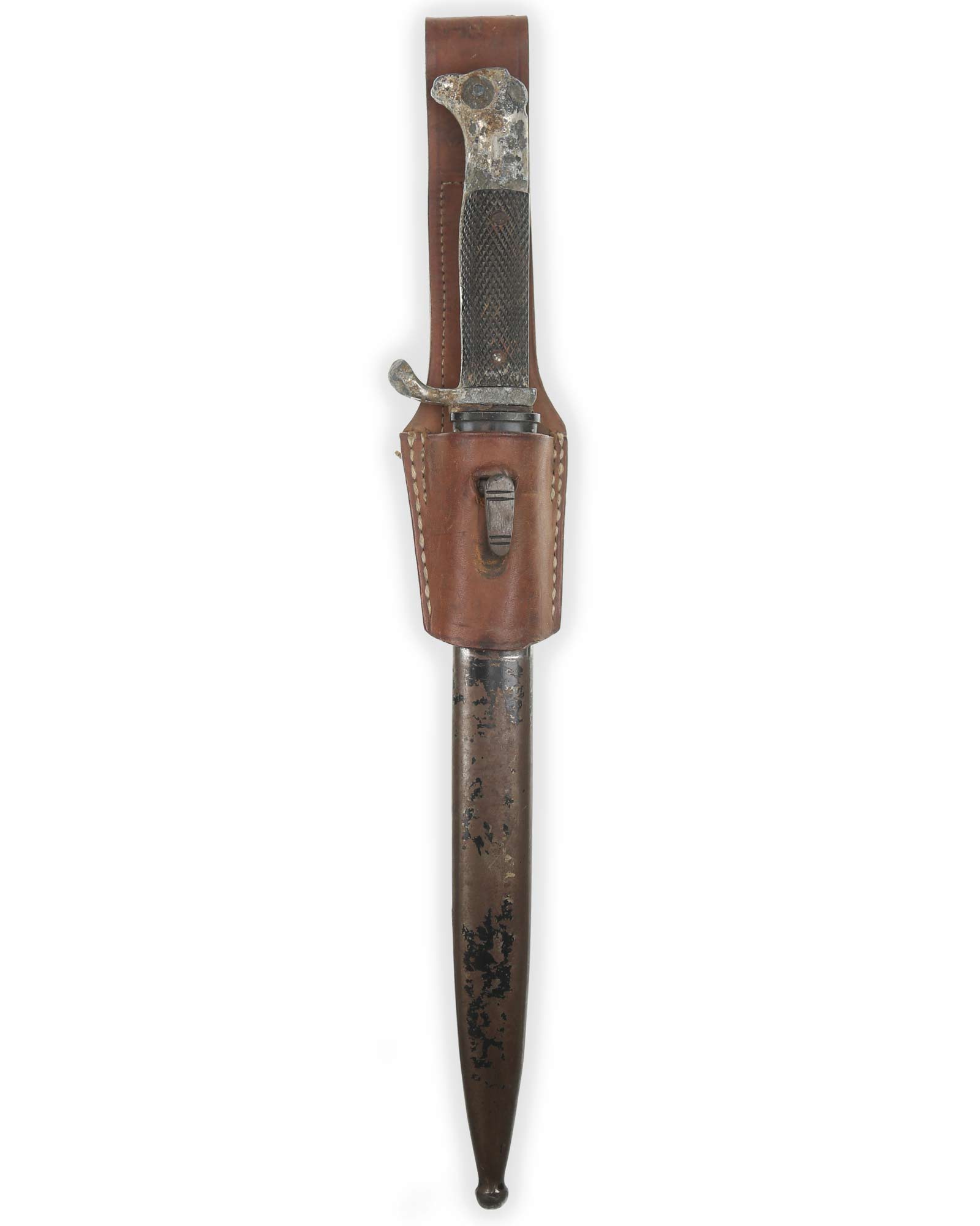 Штык внестроевой обр. 1933-45 гг. (тип K98). Рукоять образована двумя пластмассовыми рифлеными щечками, скрепленными с хвостовиком клинка заклепками. Головка рукояти стилизована под птичью голову. Клинок прямой, стальной, однолезвийный, с долом на каждой стороне и пилой на обухе. Ножны стальные, окрашены в черный цвет, с крючком и шариком на конце. На пяте клинка имеется клеймо известного производителя - Original Eickhorn Solingen, клеймо немецкой фирмы «Карл Айкхорн» Золинген.