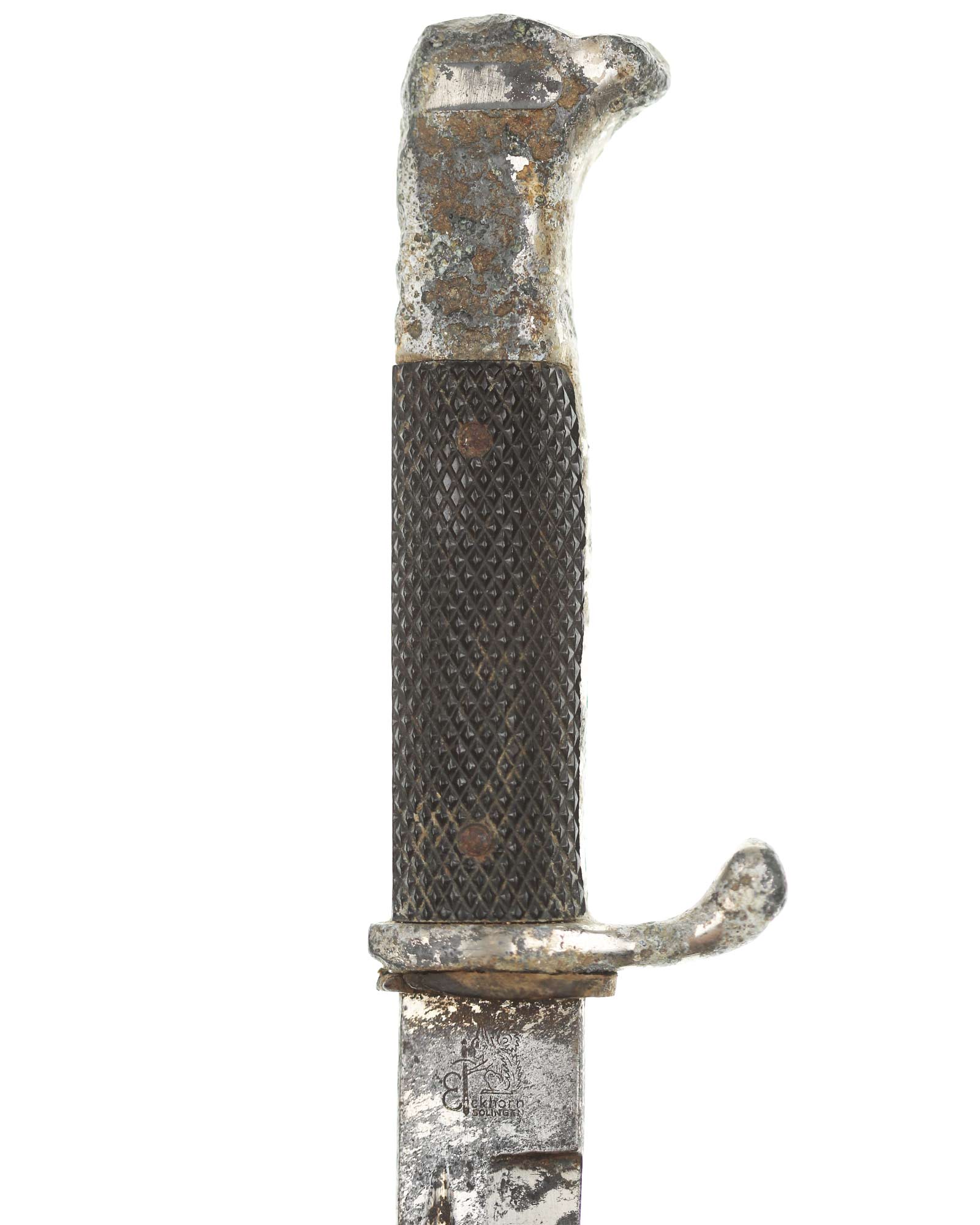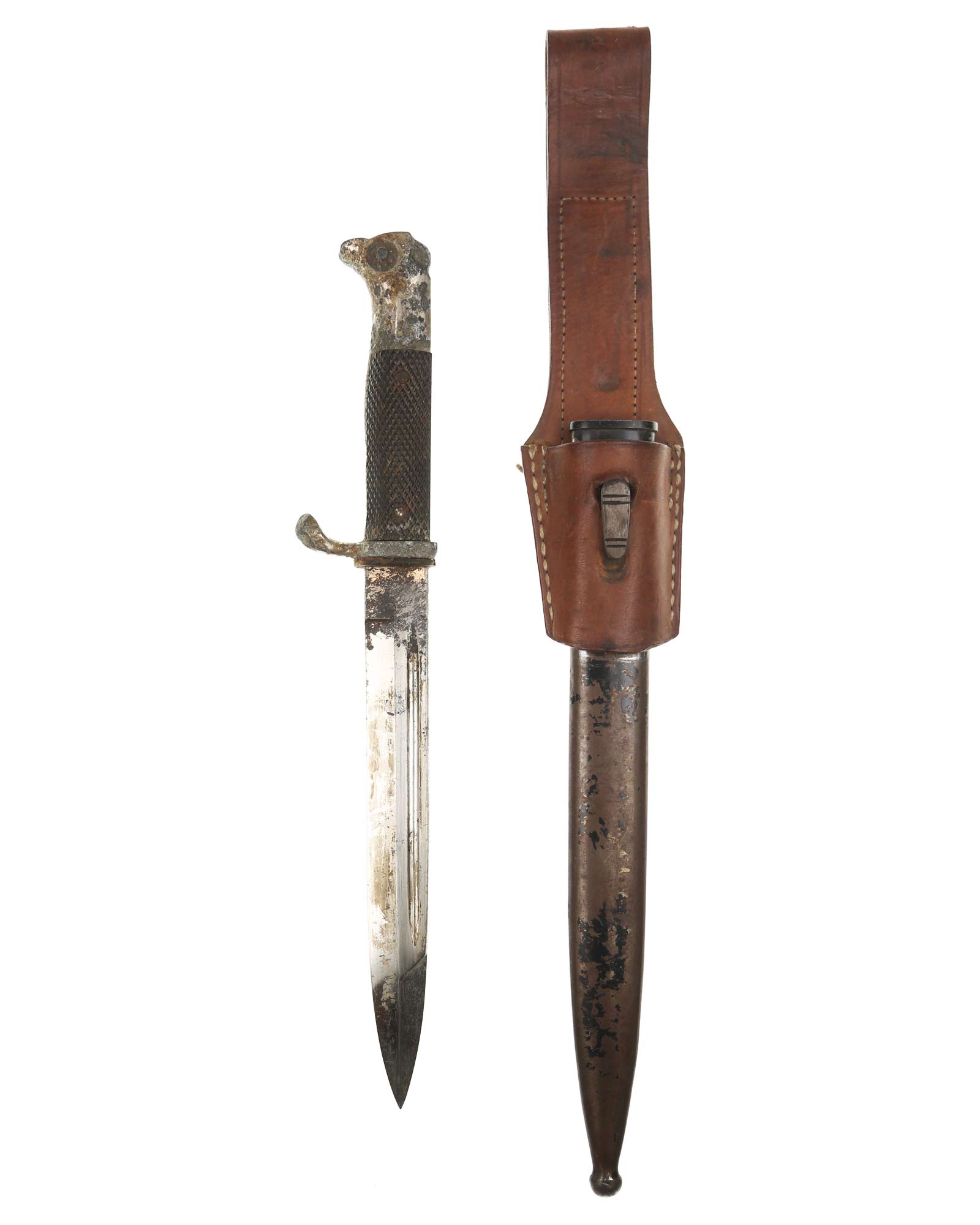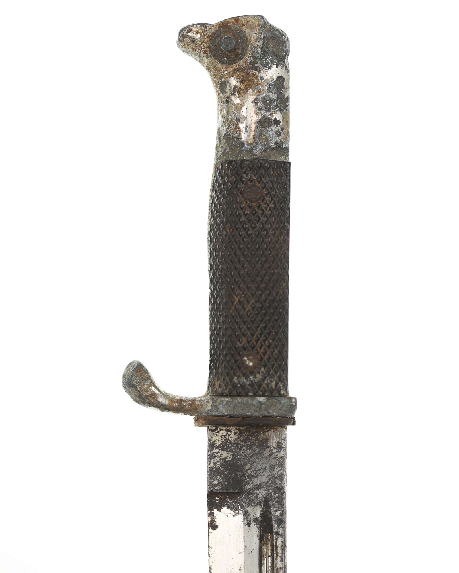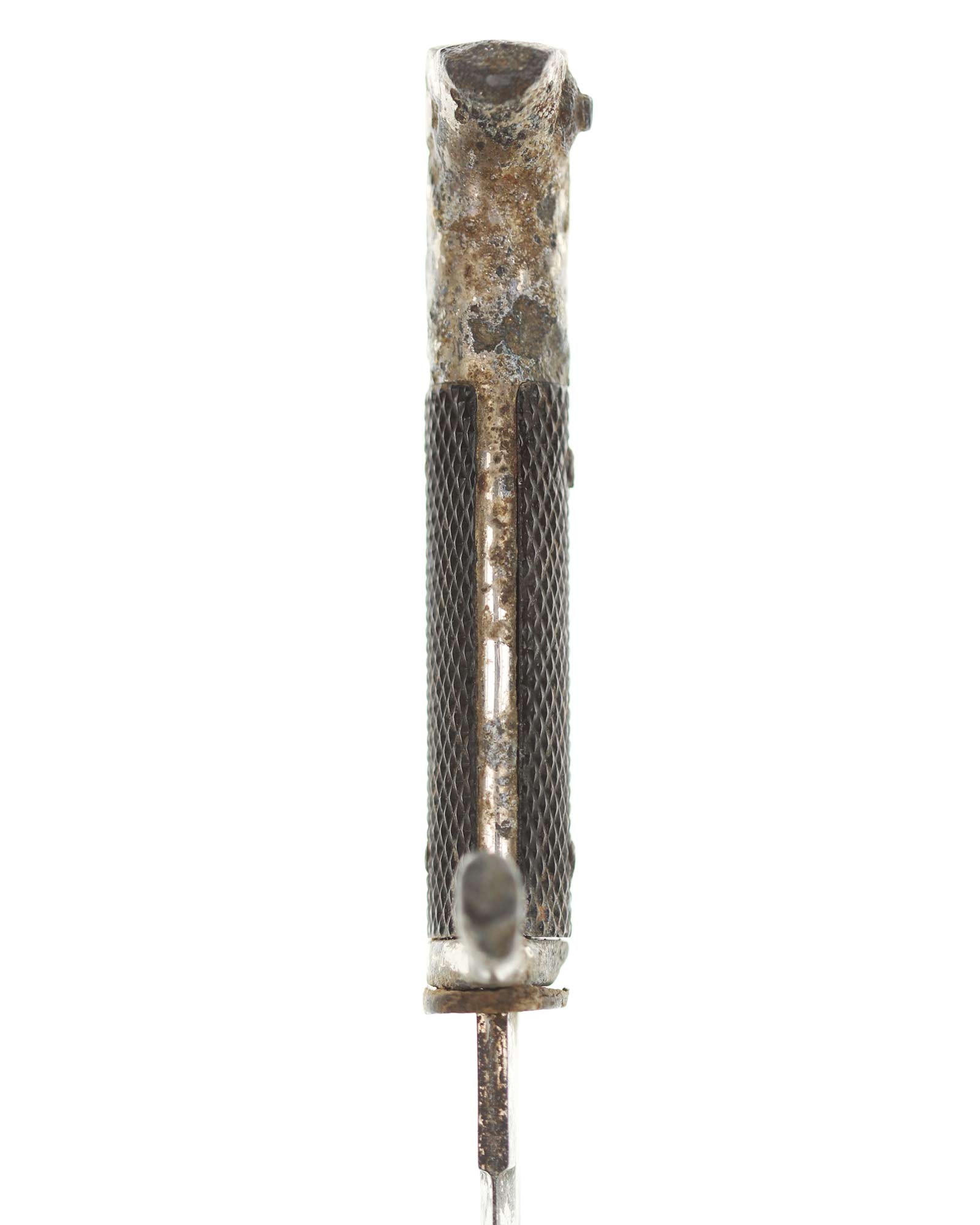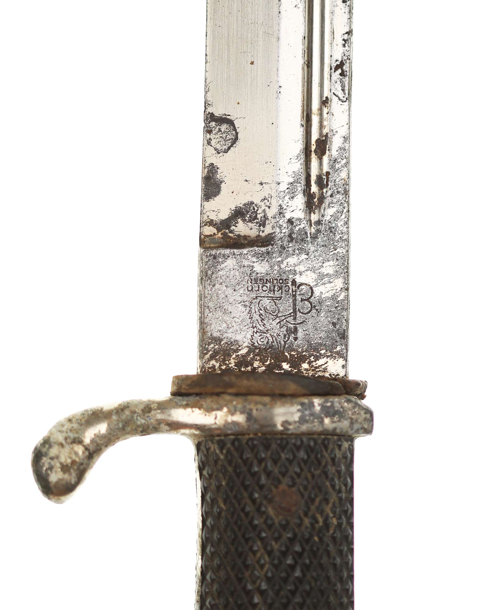 Штык внестроевой обр. 1933-45 гг. (тип K98). Рукоять образована двумя пластмассовыми рифлеными щечками, скрепленными с хвостовиком клинка заклепками. Головка рукояти стилизована под птичью голову. Клинок прямой, стальной, однолезвийный, с долом на каждой стороне и пилой на обухе. Ножны стальные, окрашены в черный цвет, с крючком и шариком на конце. На пяте клинка имеется клеймо известного производителя - Original Eickhorn Solingen, клеймо немецкой фирмы «Карл Айкхорн» Золинген.