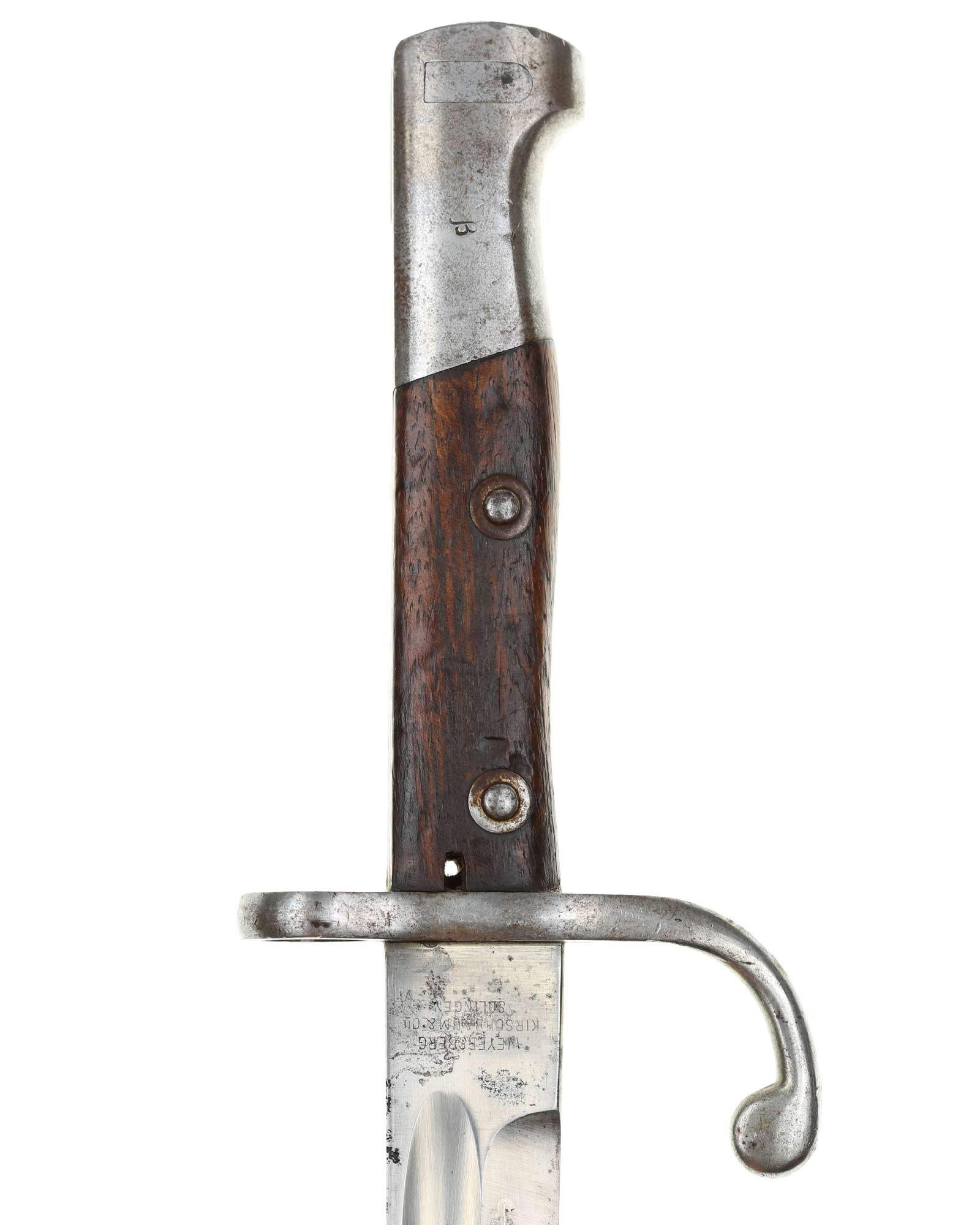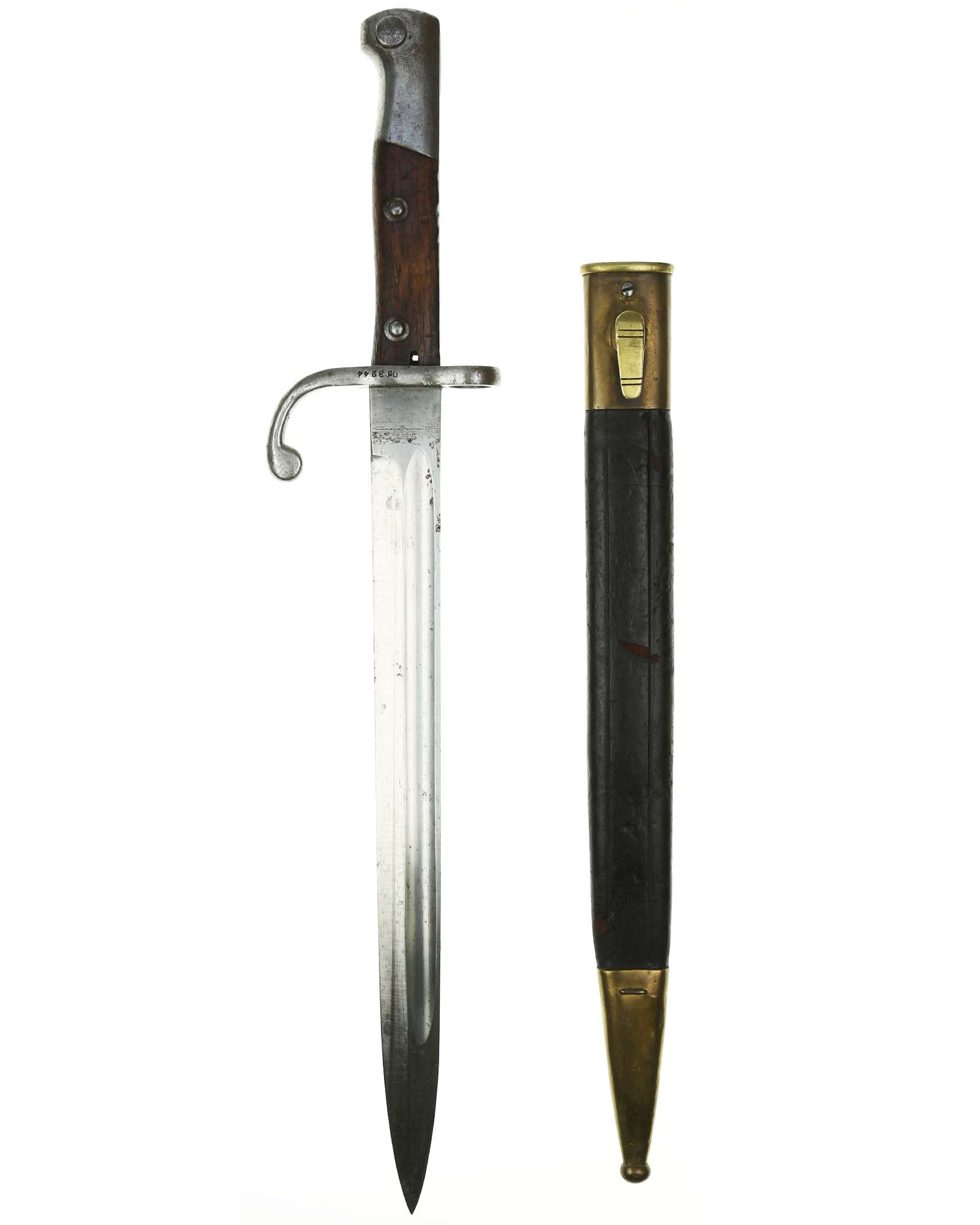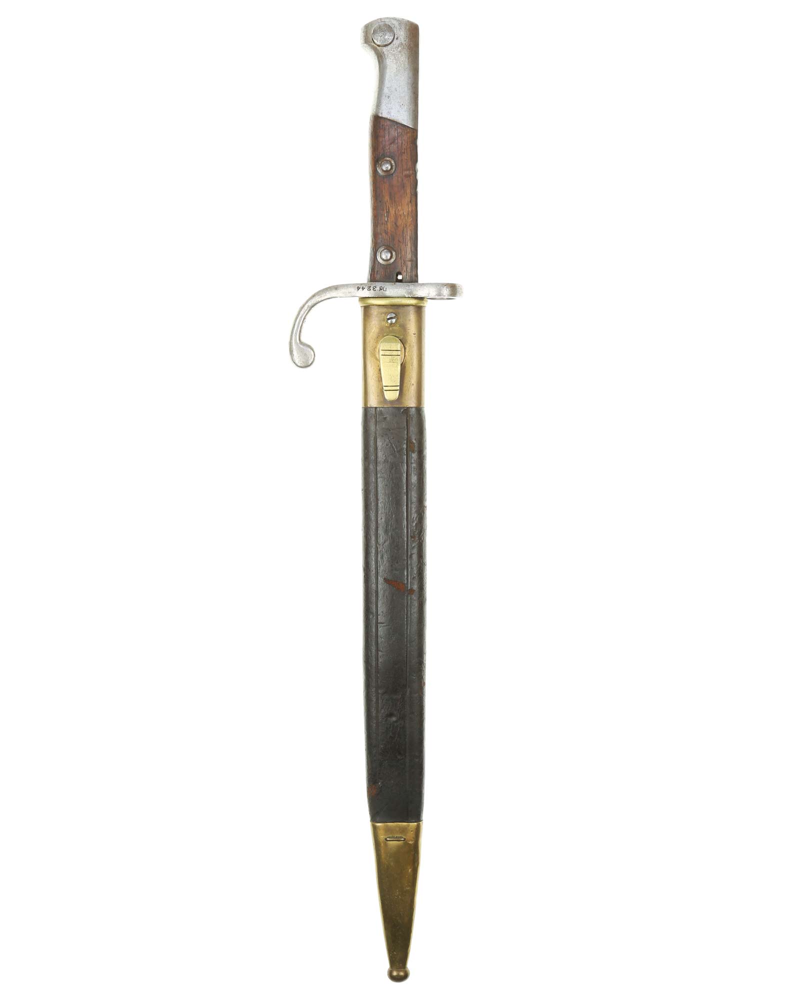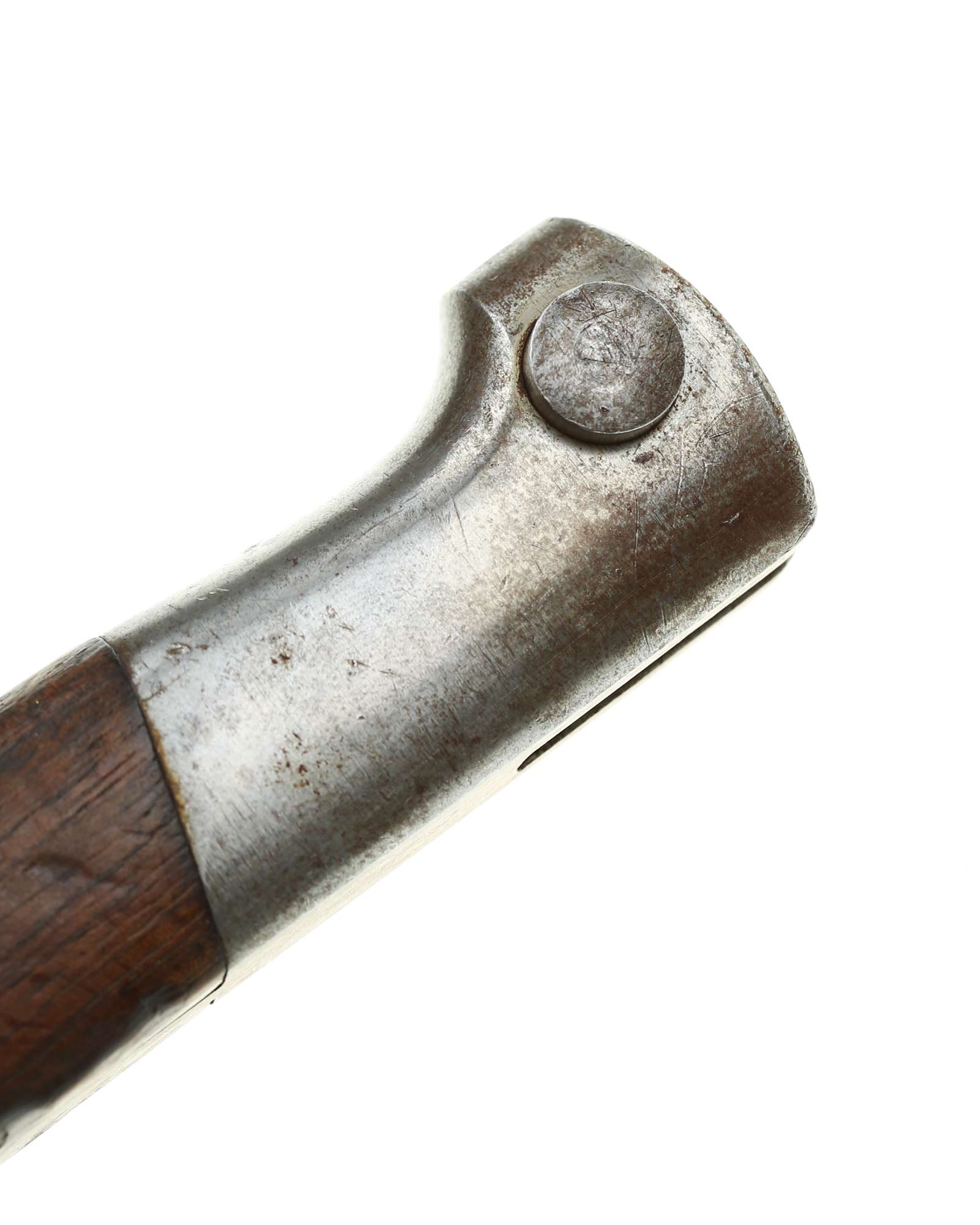 Хорошо сохранившийся штыk Mauser M1908 для Бразилии, изготовленный компанией WKC, Золинген. Классическая комплектация с оригинальными кожаными ножнами и латунным прибором. Общая длина: 46,4 см.