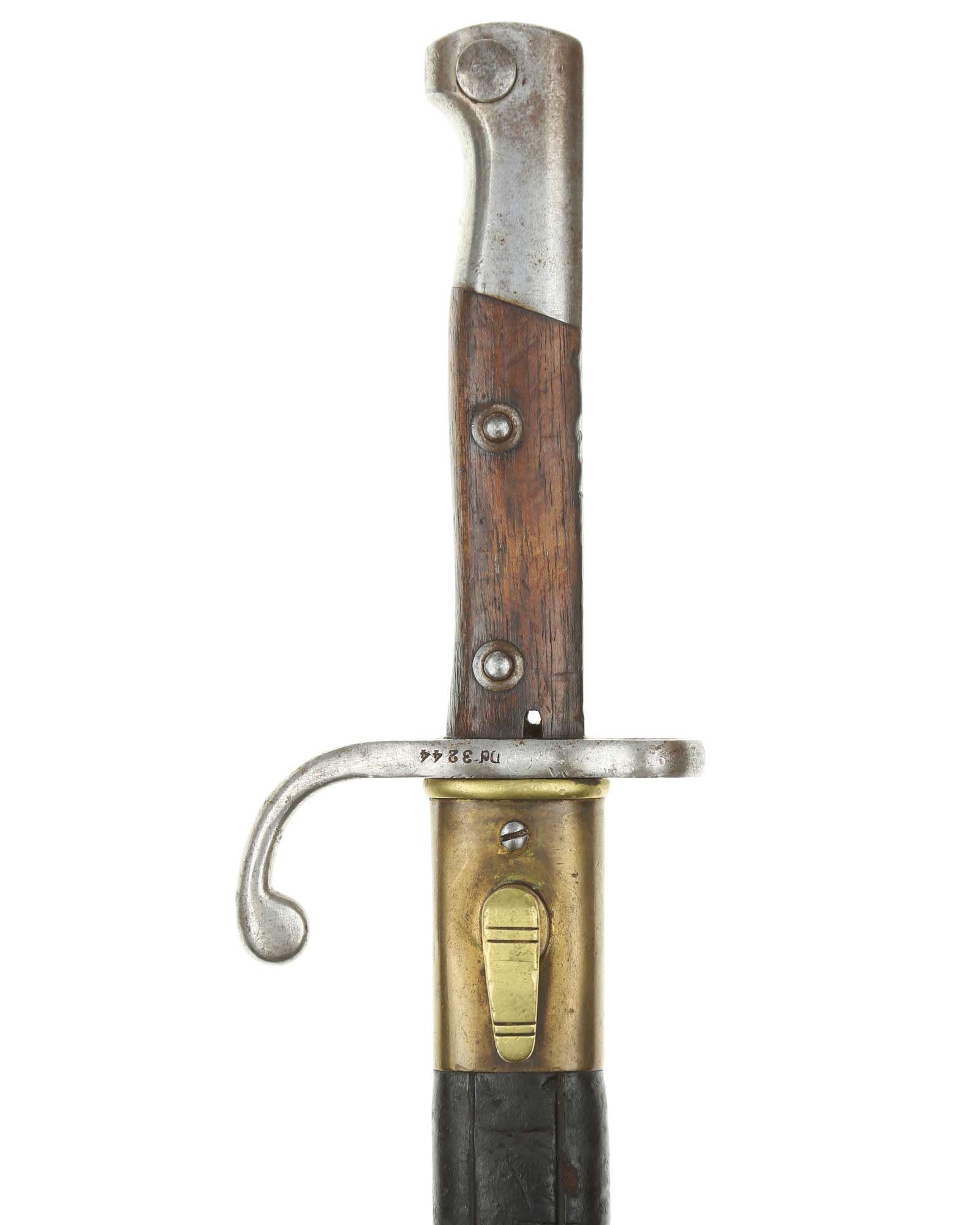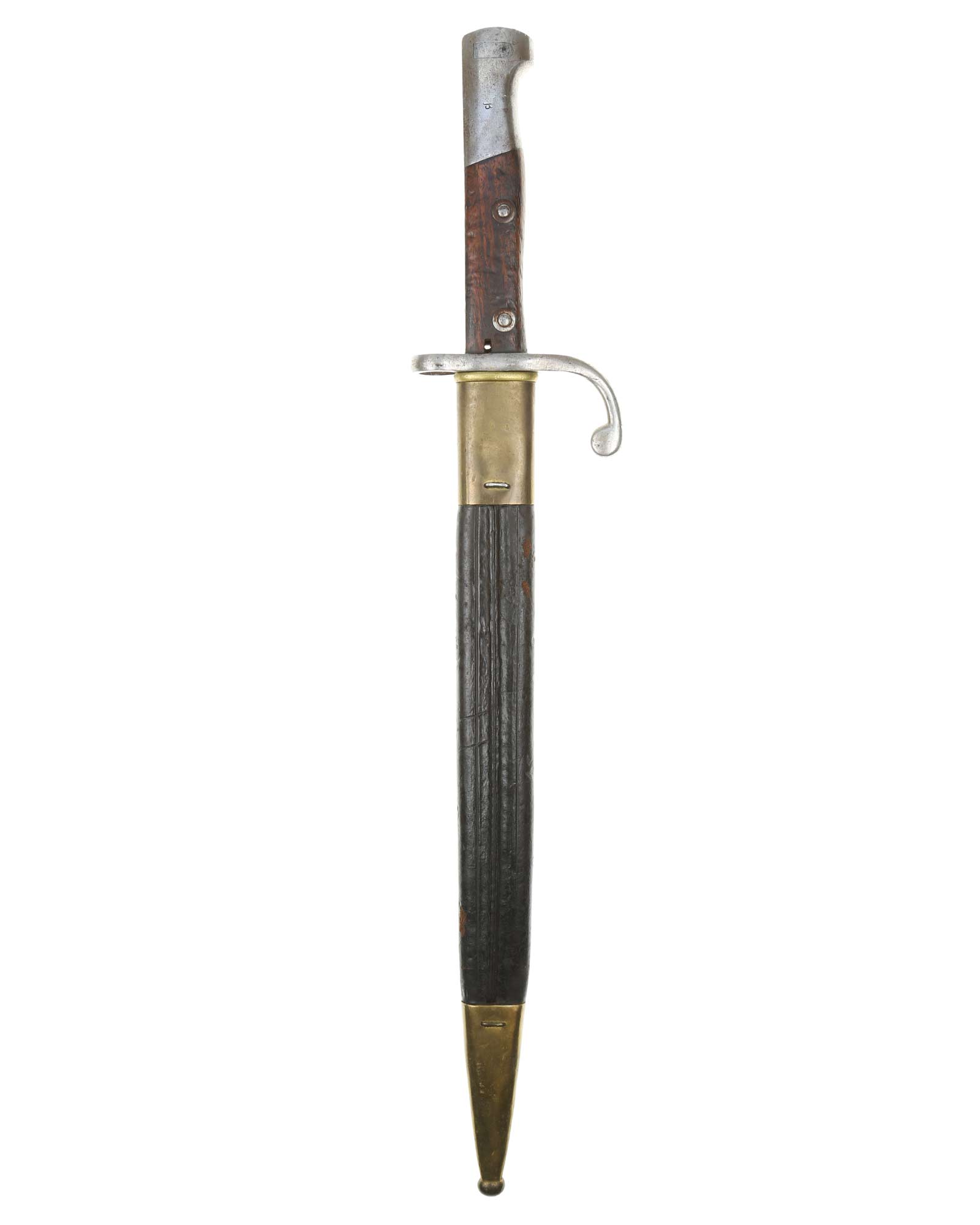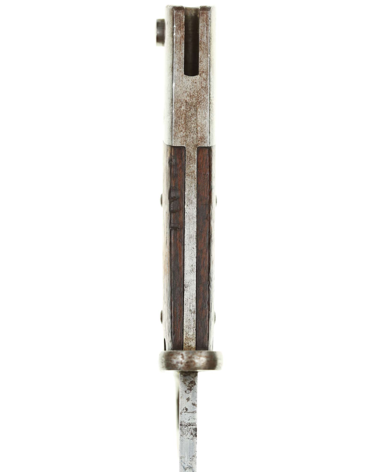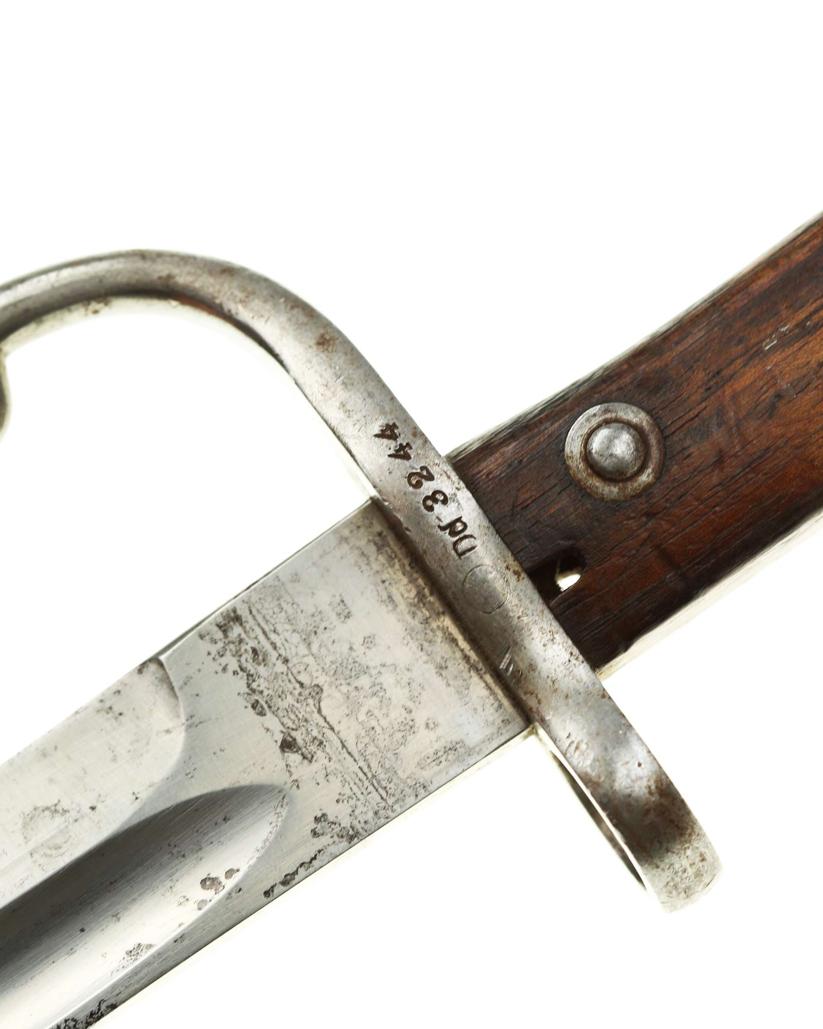 Хорошо сохранившийся штыk Mauser M1908 для Бразилии, изготовленный компанией WKC, Золинген. Классическая комплектация с оригинальными кожаными ножнами и латунным прибором. Общая длина: 46,4 см.