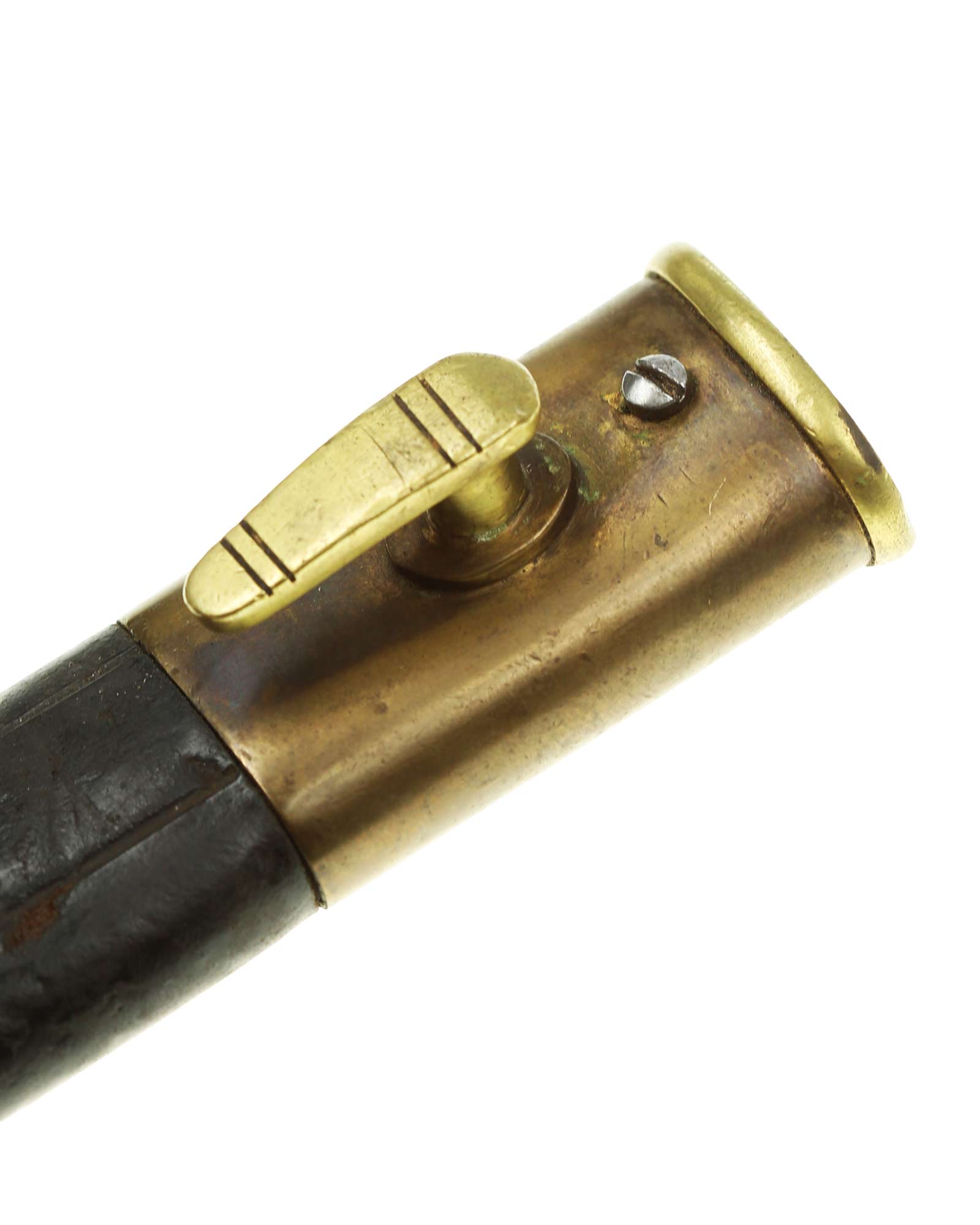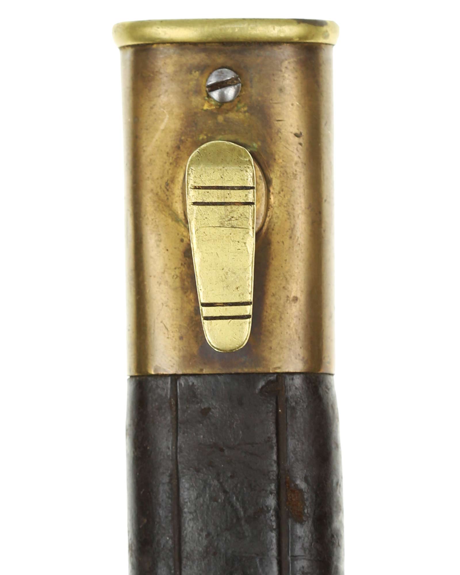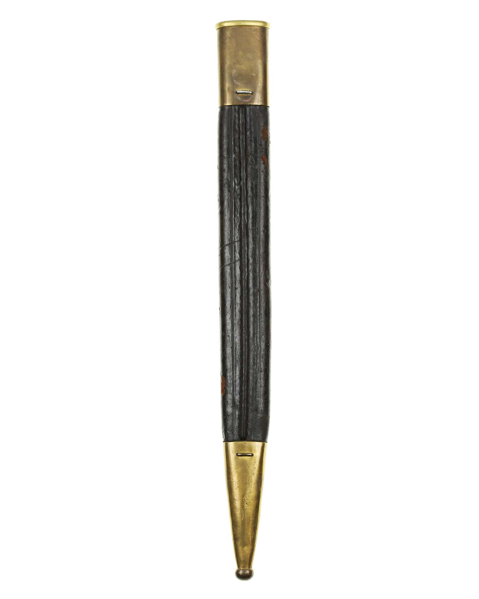 Ножны: Оригинальные кожаные ножны с латунным прибором, включающим верхнюю муфту с крючком и нижний латунный наконечник с шариком. Кожа и швы в хорошем состоянии.