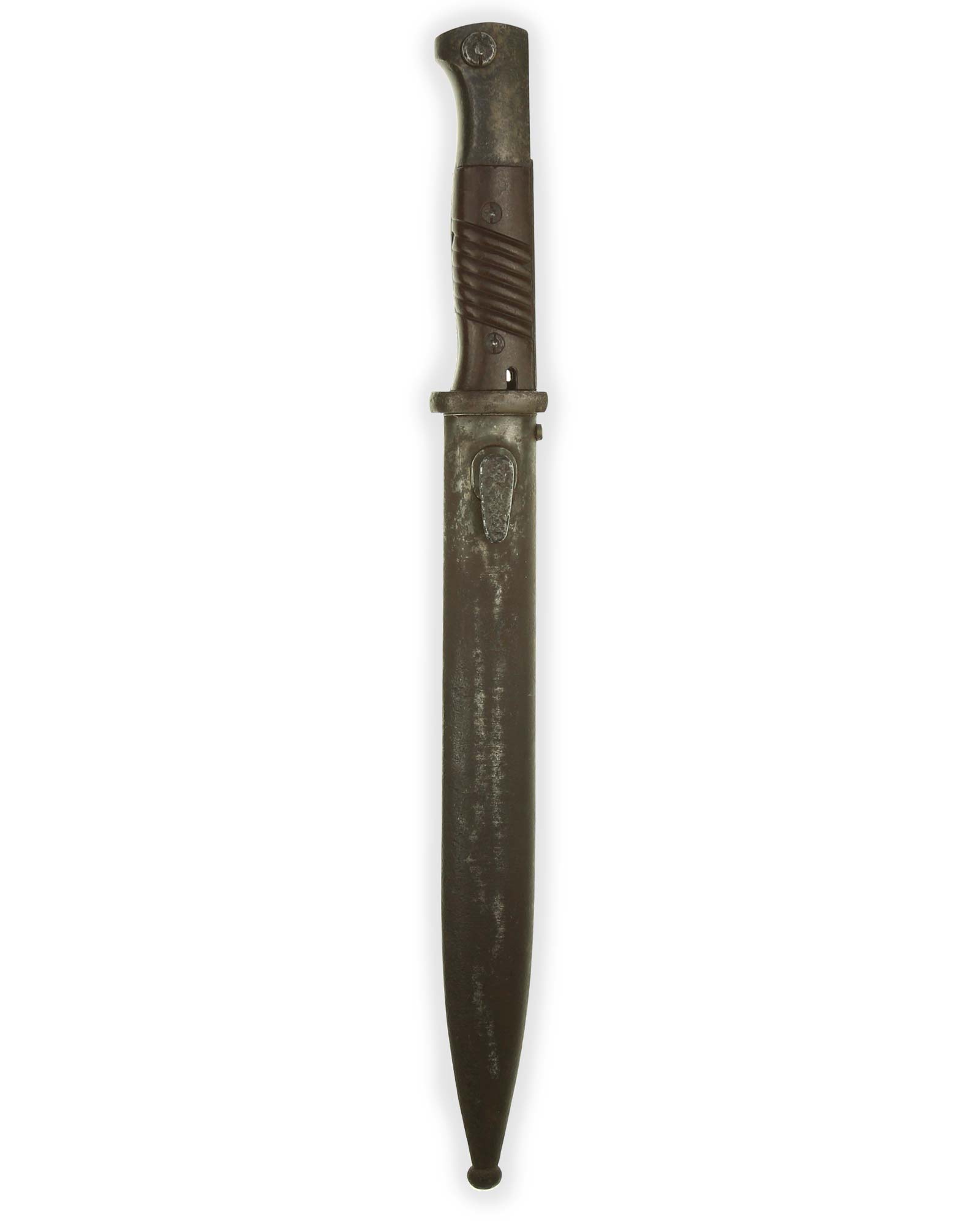 Штык к винтовке Маузера обр. 84/98 гг. Рукоять образована двумя щечками, скрепленными с хвостовиком двумя винтами. В головке рукояти располагается Т-образный паз и пружинная защелка с внутренним расположением спиральной пружины. Клинок прямой, стальной. Боевой конец двулезвийный. На пяте клинка имеется клеймо производителя - WKC Золинген (WKC Solingen).