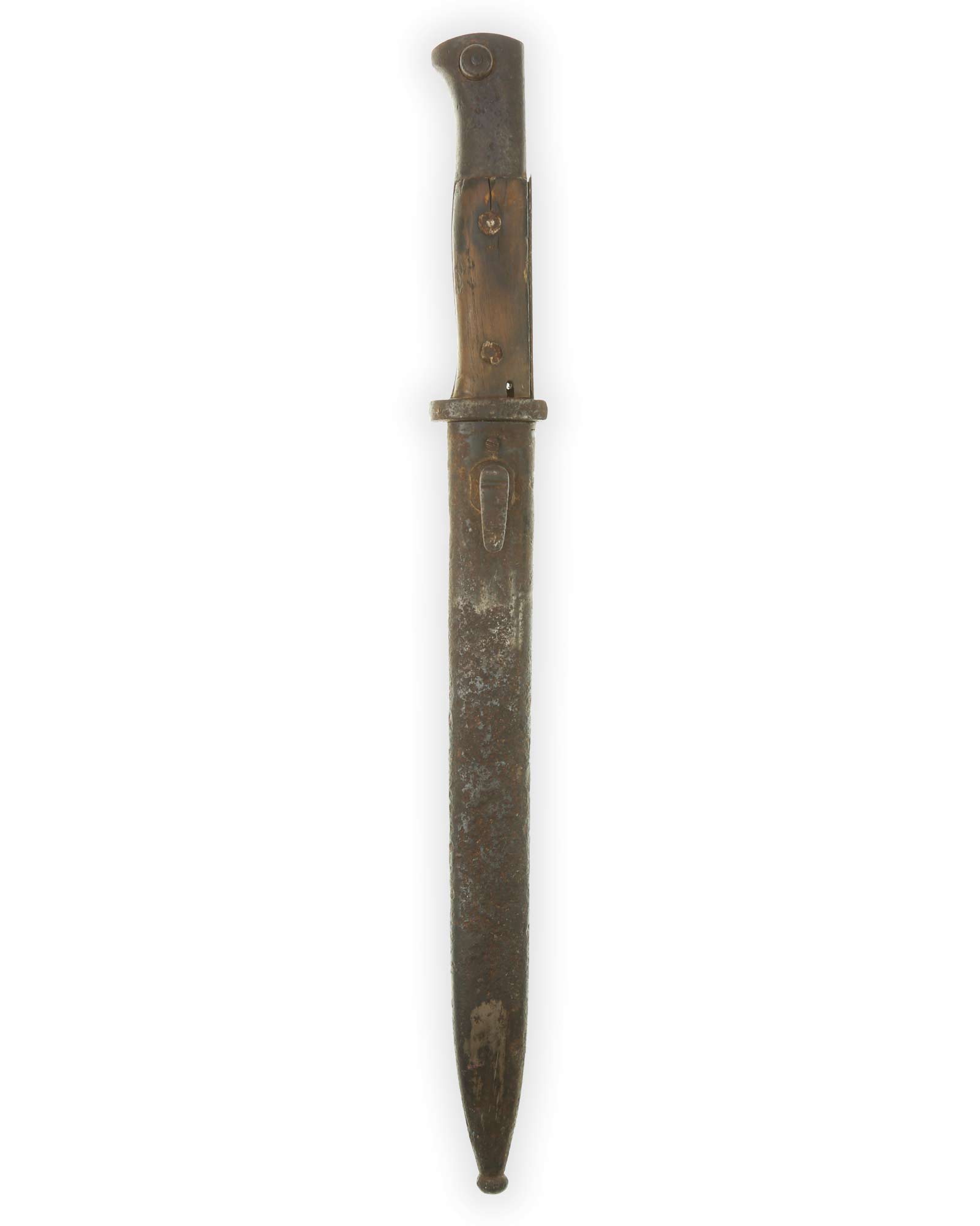 Штык к винтовке Маузера обр. 84/98 гг. Рукоять образована двумя щечками, скрепленными с хвостовиком двумя винтами. В головке рукояти располагается Т-образный паз и пружинная защелка с внутренним расположением спиральной пружины. Клинок прямой, стальной, однолезвийный, с одним долом. Боевой конец двулезвийный. На пяте клинка имеется клеймо известного производителя - J.A. Henckels Zwillinge Solingen.