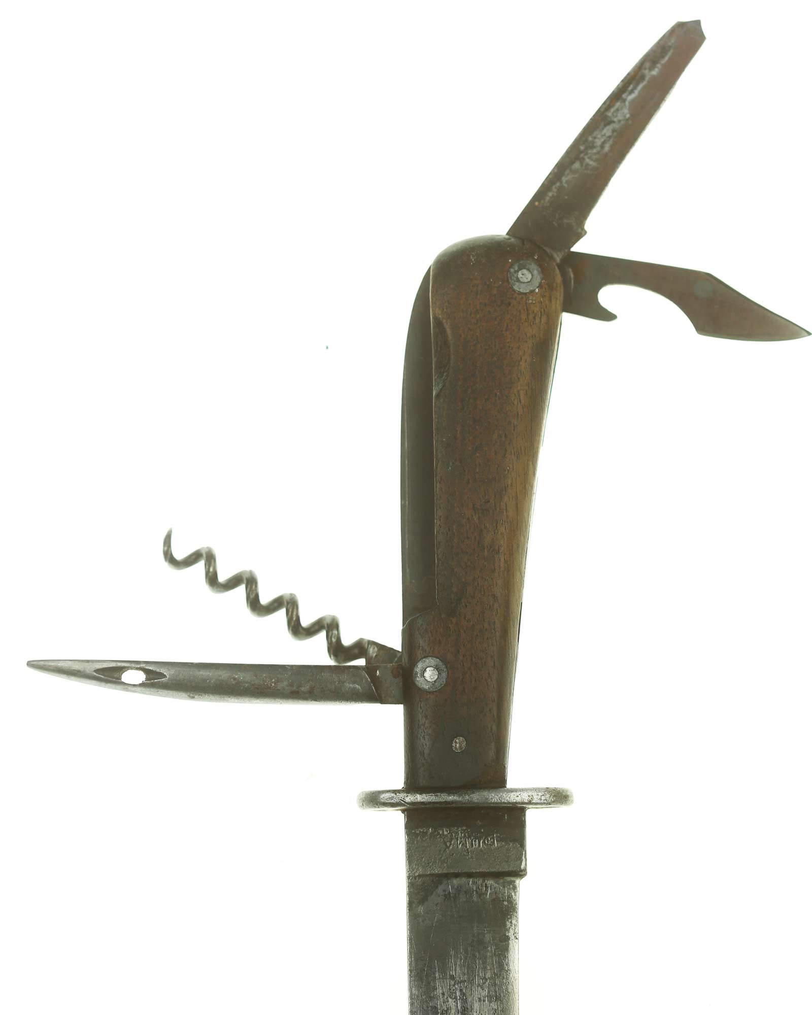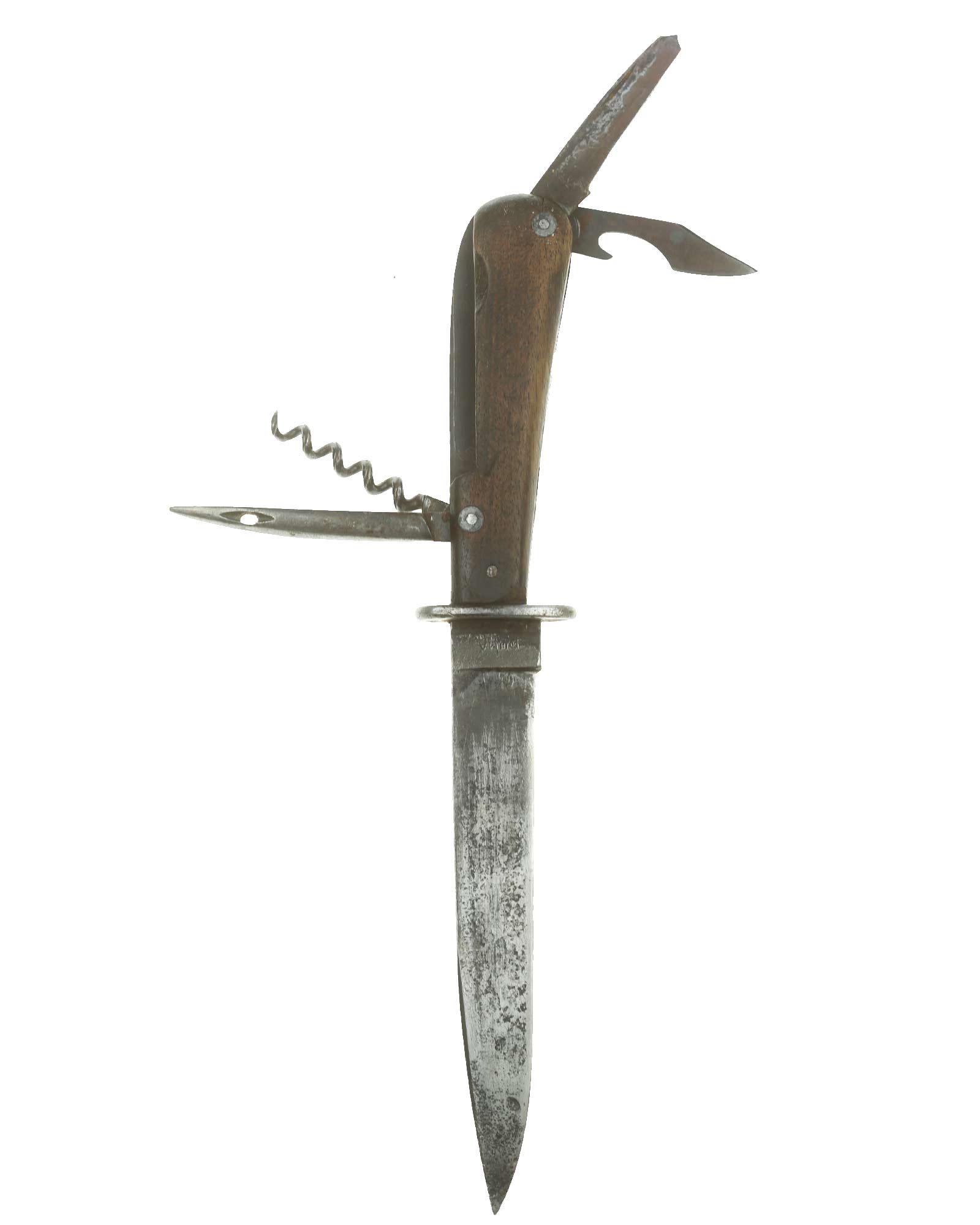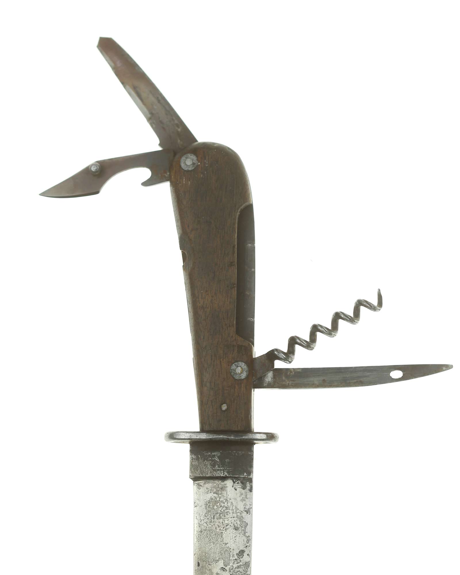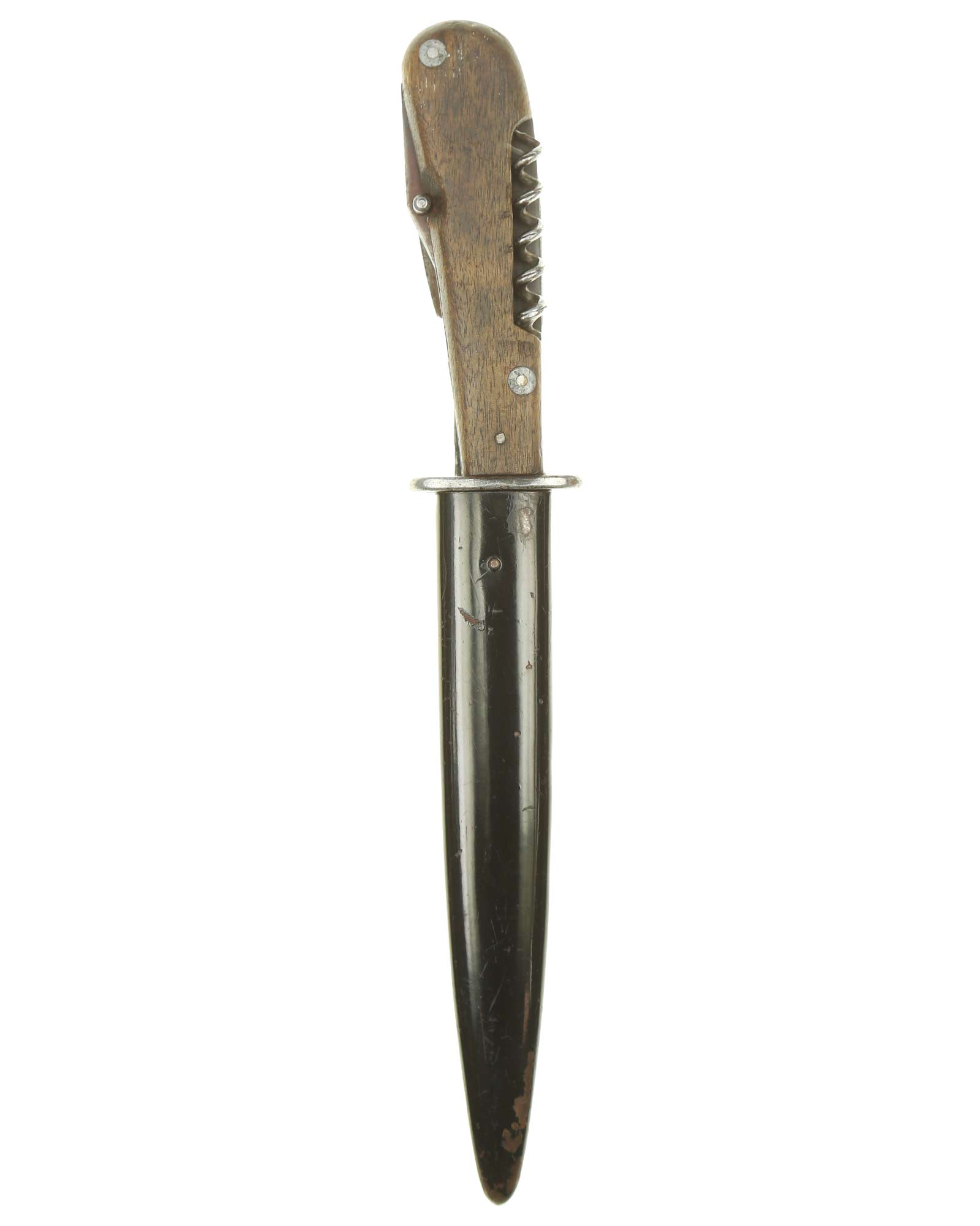 Тренч-нож с захватными инструментами от Puma Solingen. С типичными деревянными накладками на рукоятке, которые скрепляют все рабочие инструменты. Стальные ножны сохранили свою оригинальную черную окраску.