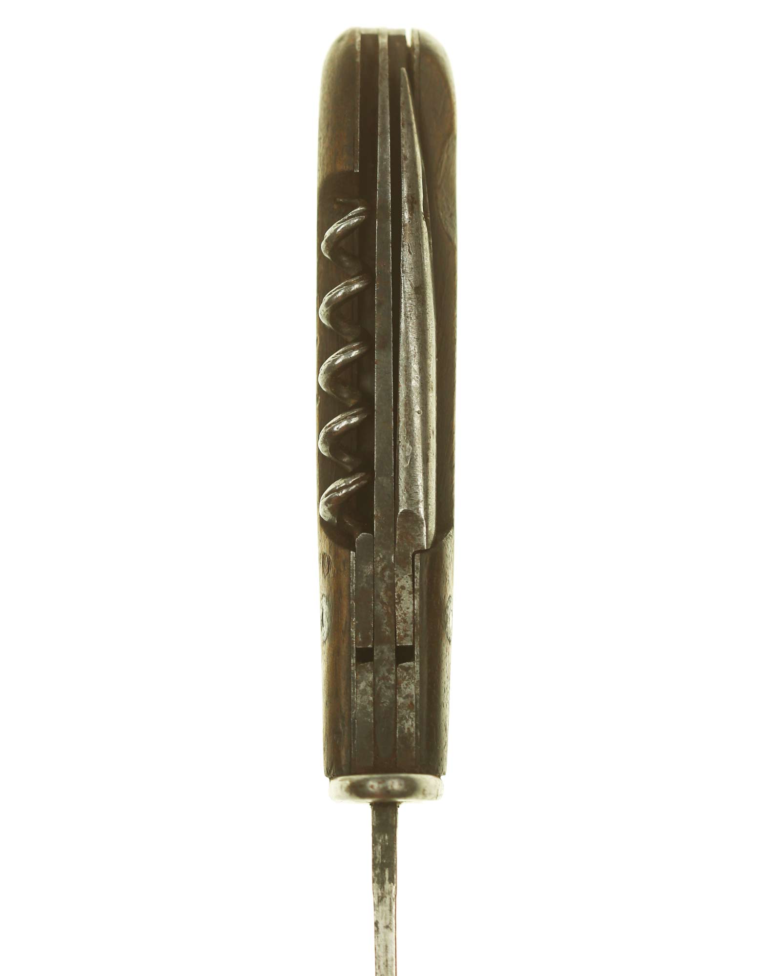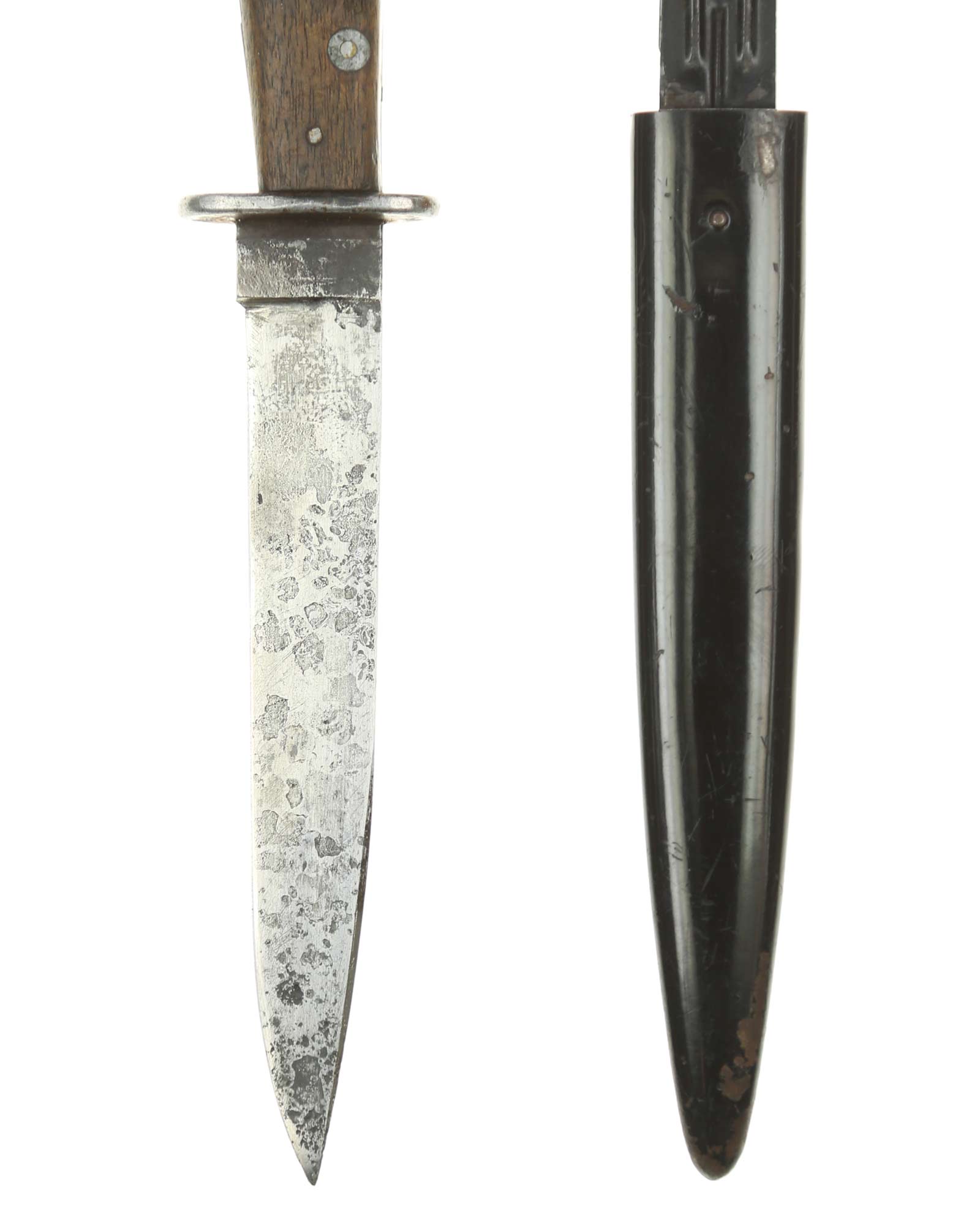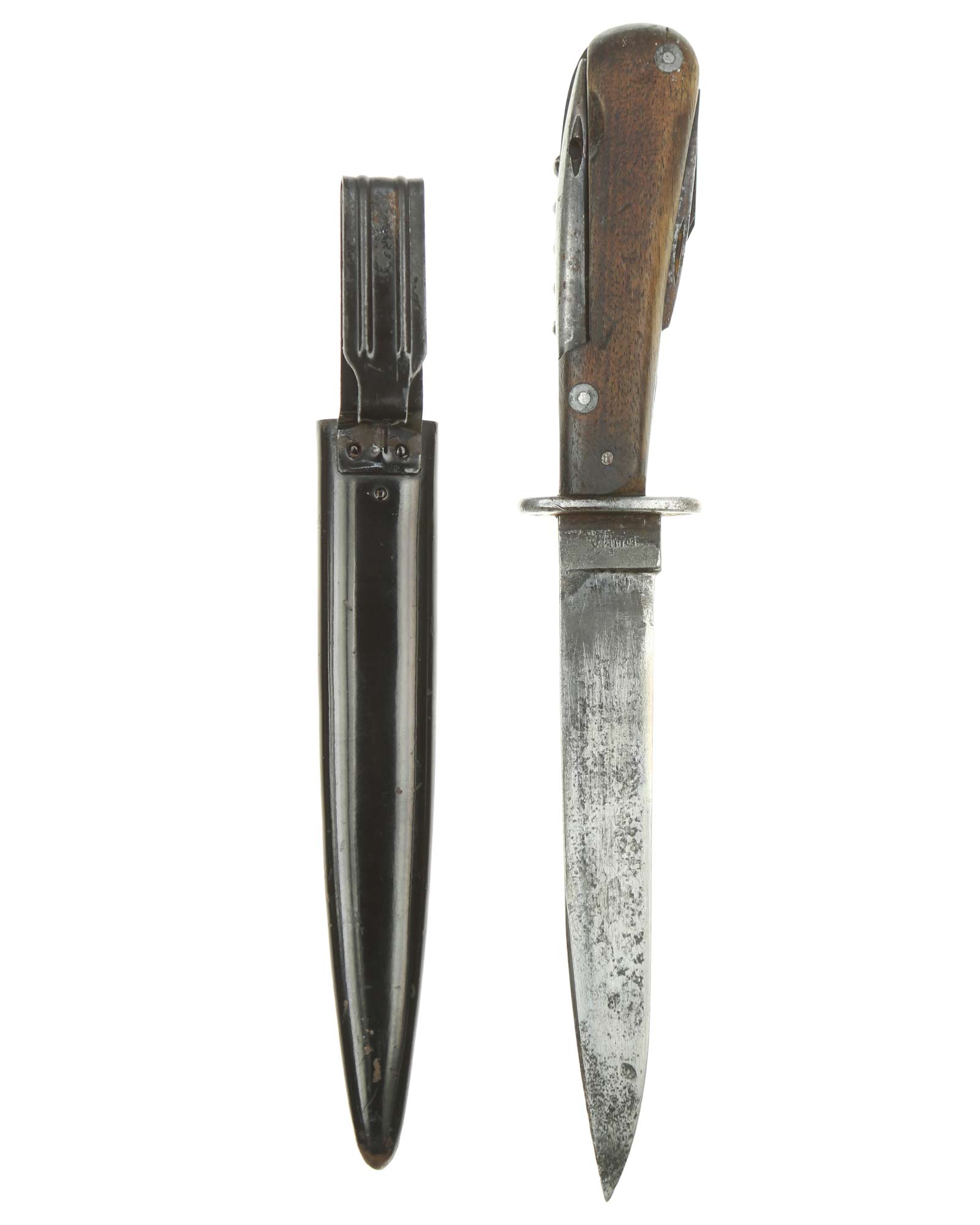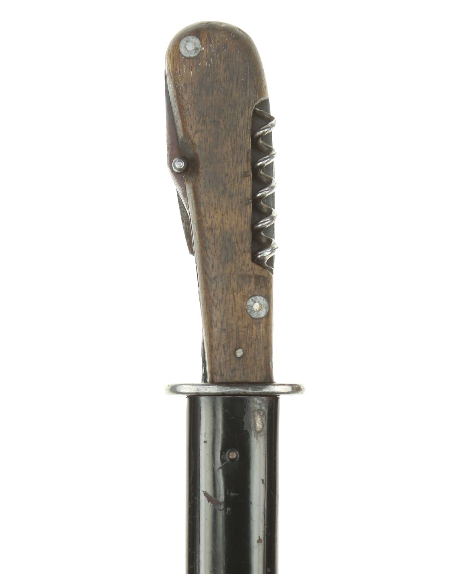 Тренч-нож с захватными инструментами от Puma Solingen. С типичными деревянными накладками на рукоятке, которые скрепляют все рабочие инструменты. Стальные ножны сохранили свою оригинальную черную окраску.