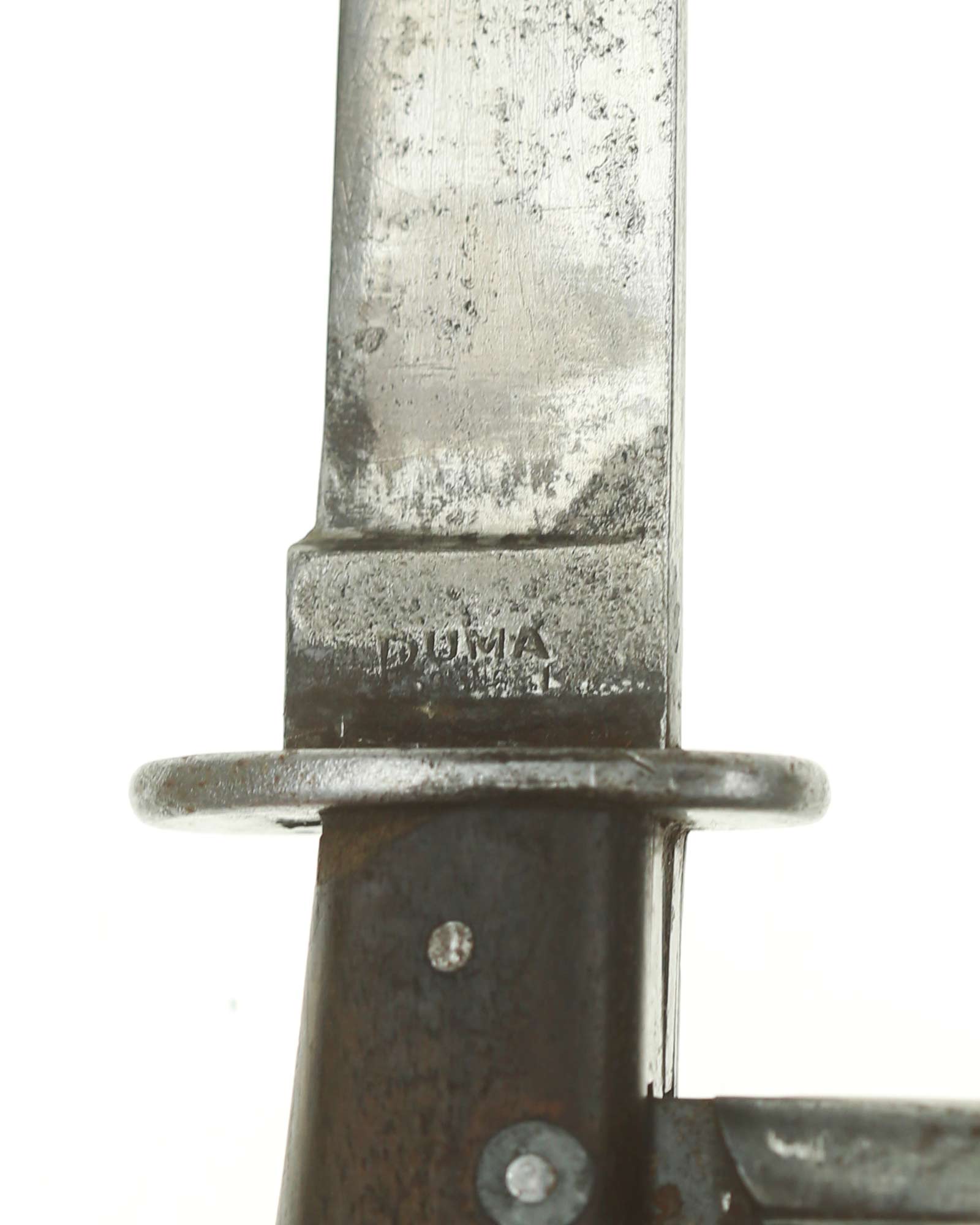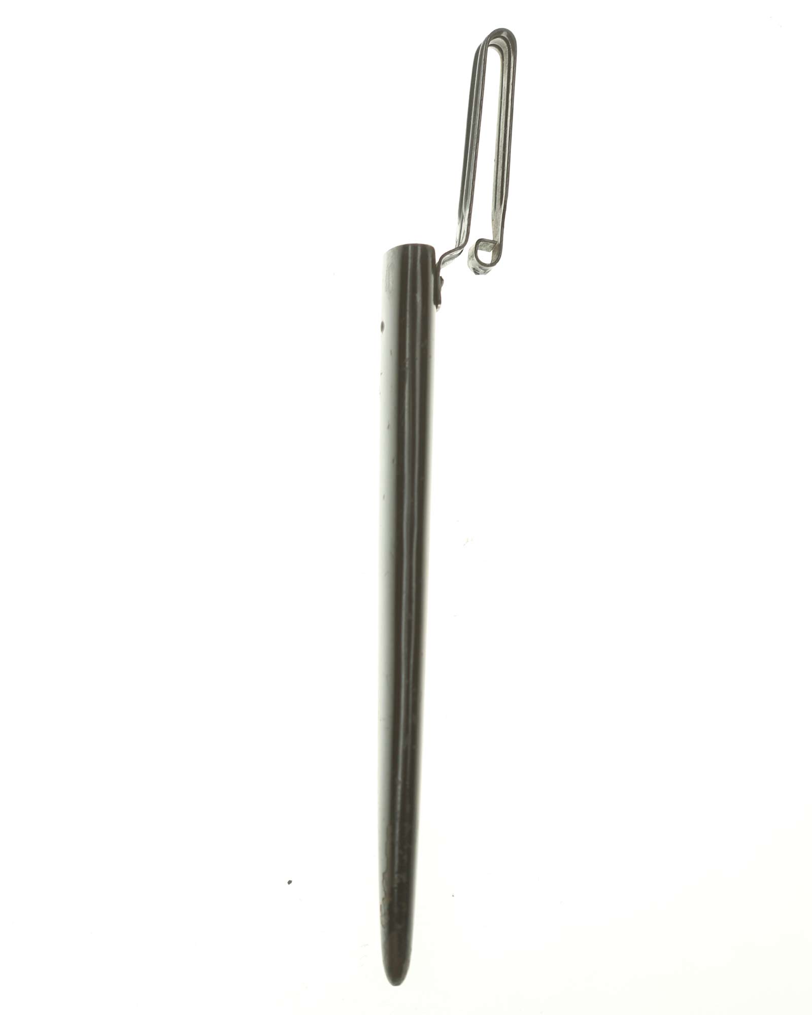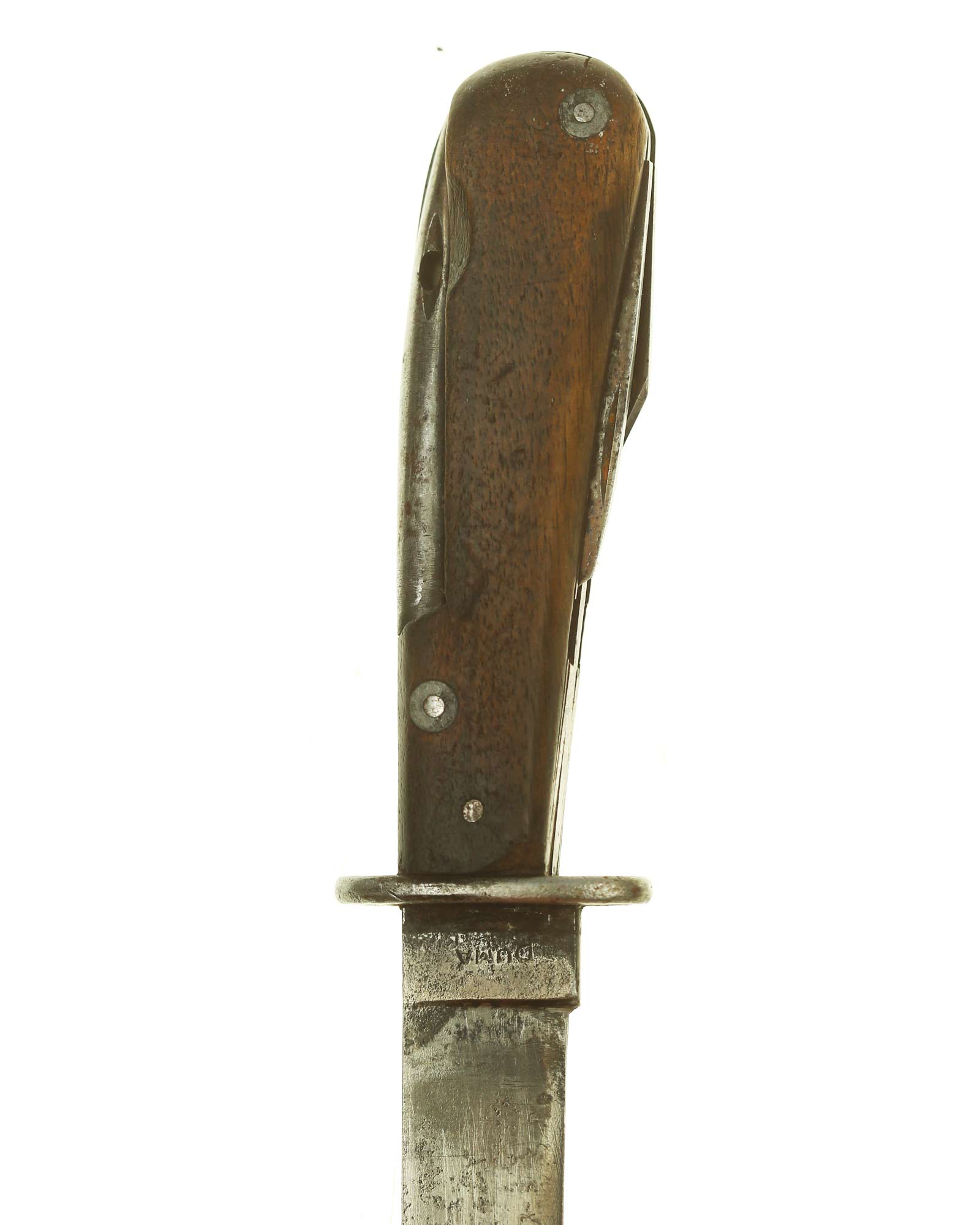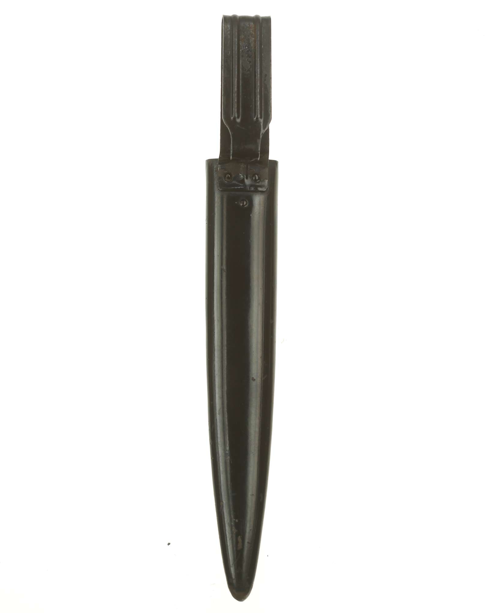 Тренч-нож с захватными инструментами от Puma Solingen. С типичными деревянными накладками на рукоятке, которые скрепляют все рабочие инструменты. Стальные ножны сохранили свою оригинальную черную окраску.