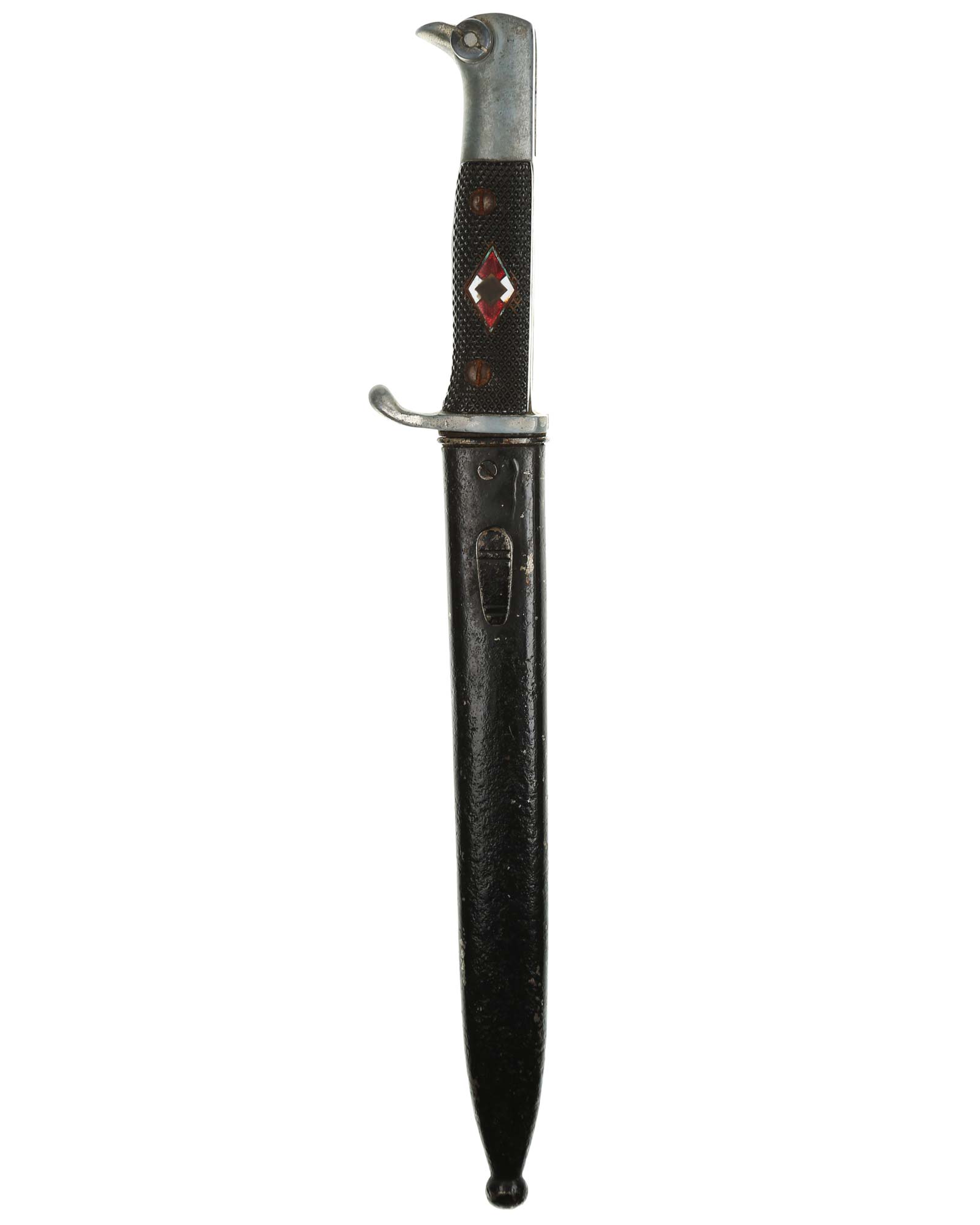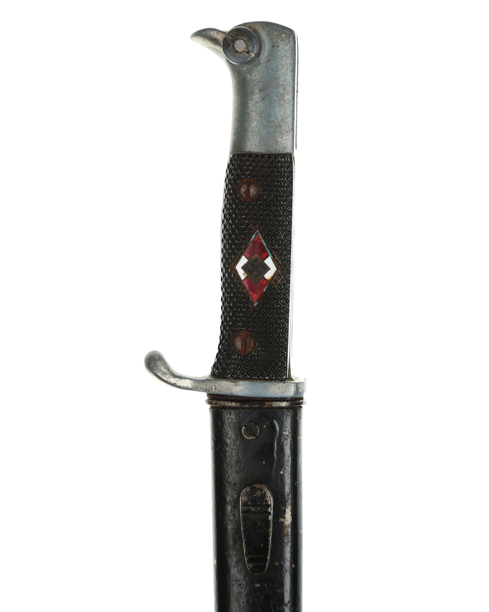 Рукоять образована двумя пластмассовыми рифлеными щечками, в которые вмонтирована эмалевая эмблема Гитлер Югенд. Головка рукояти стилизована под птичью голову. В головке рукояти располагается Т/О - образный паз и пружинная защелка с внутренним расположением спиральной пружины. Все металлические части эфеса никелированные. Клинок прямой, стальной, однолезвийный, с долом на каждой стороне и пилой на обухе. Клеймо: E. Pack Solingen (Эрнст Пак Золинген). Ножны стальные, окрашены в черный цвет, с крючком и шариком на конце.