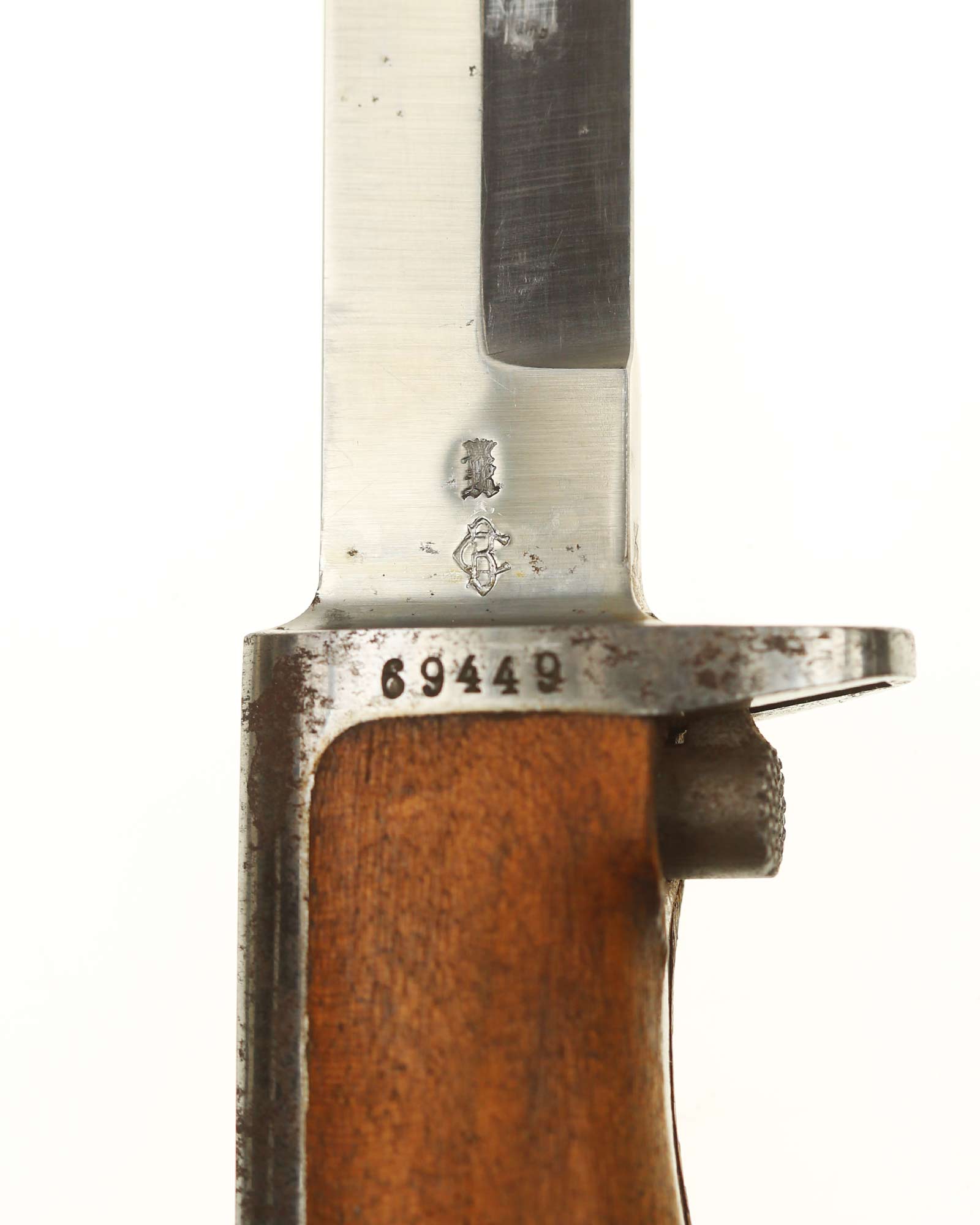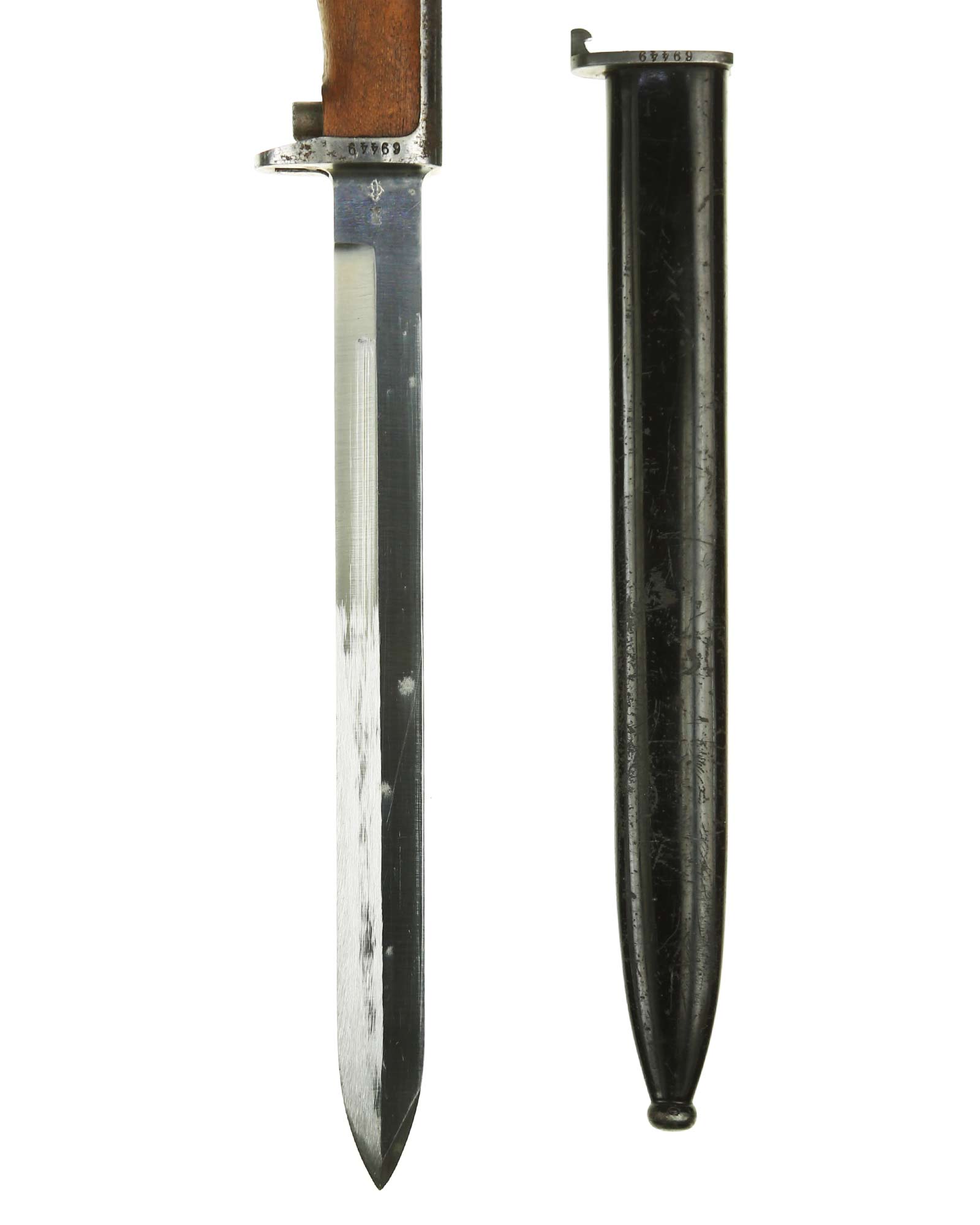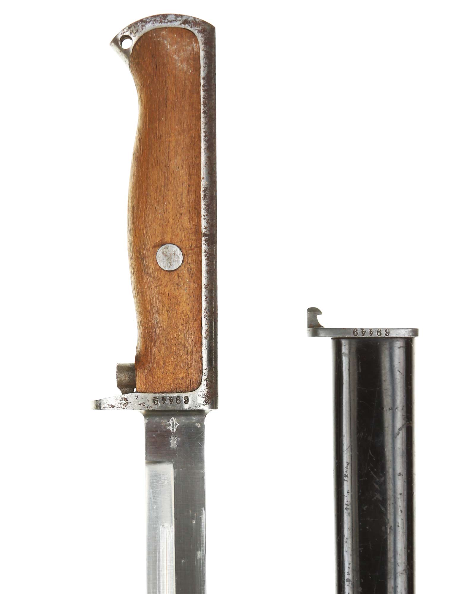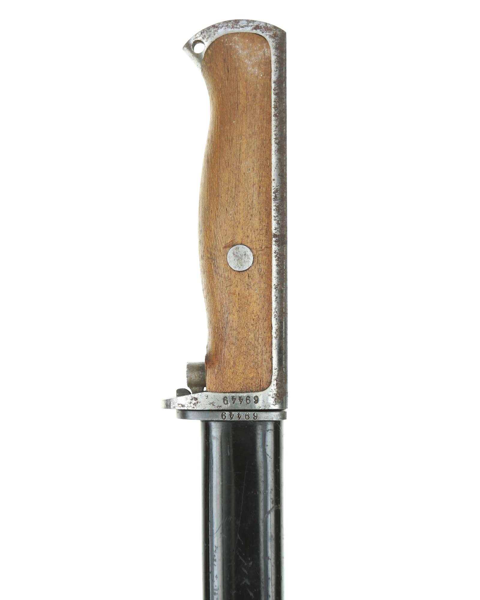 Норвежский штык M 1894 для винтовки Krag-Jörgensen. На клинке имеется клеймо изготовителя. На пиноли и ножнах имеется соответствующий номер 69449. Обе деревянные шкалы рукояти в хорошем состоянии. Клинок чистый. Ножны имеют оригинальное лаковое покрытие.