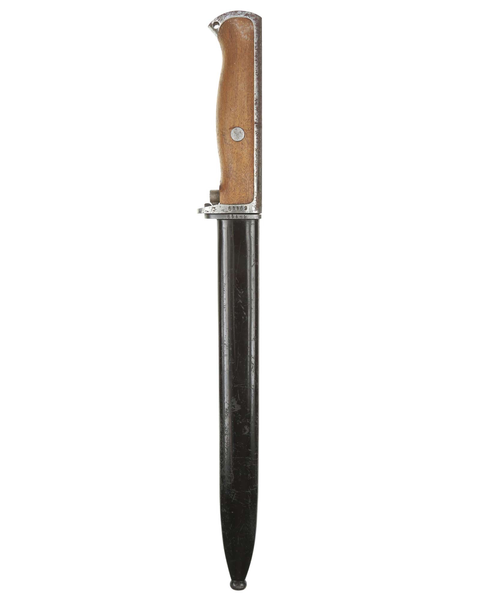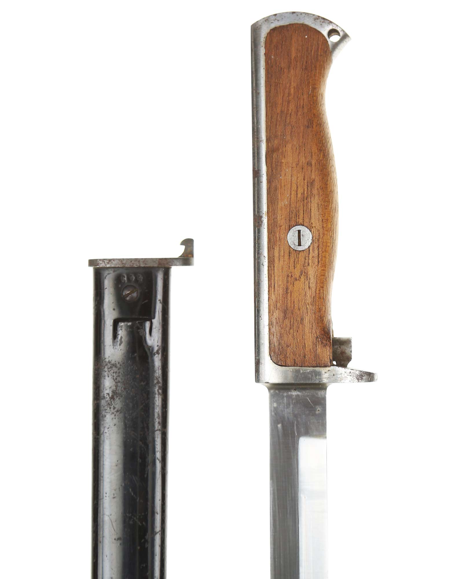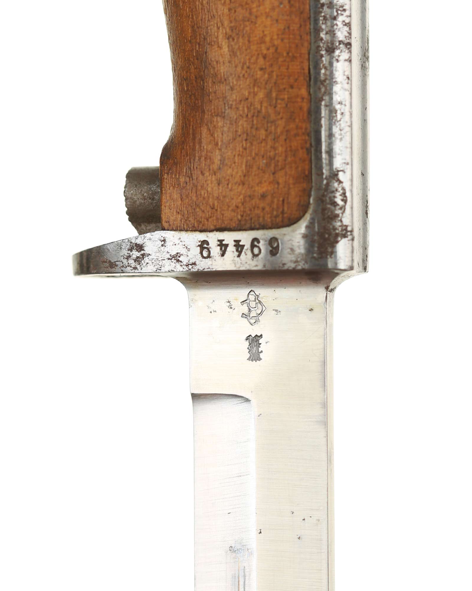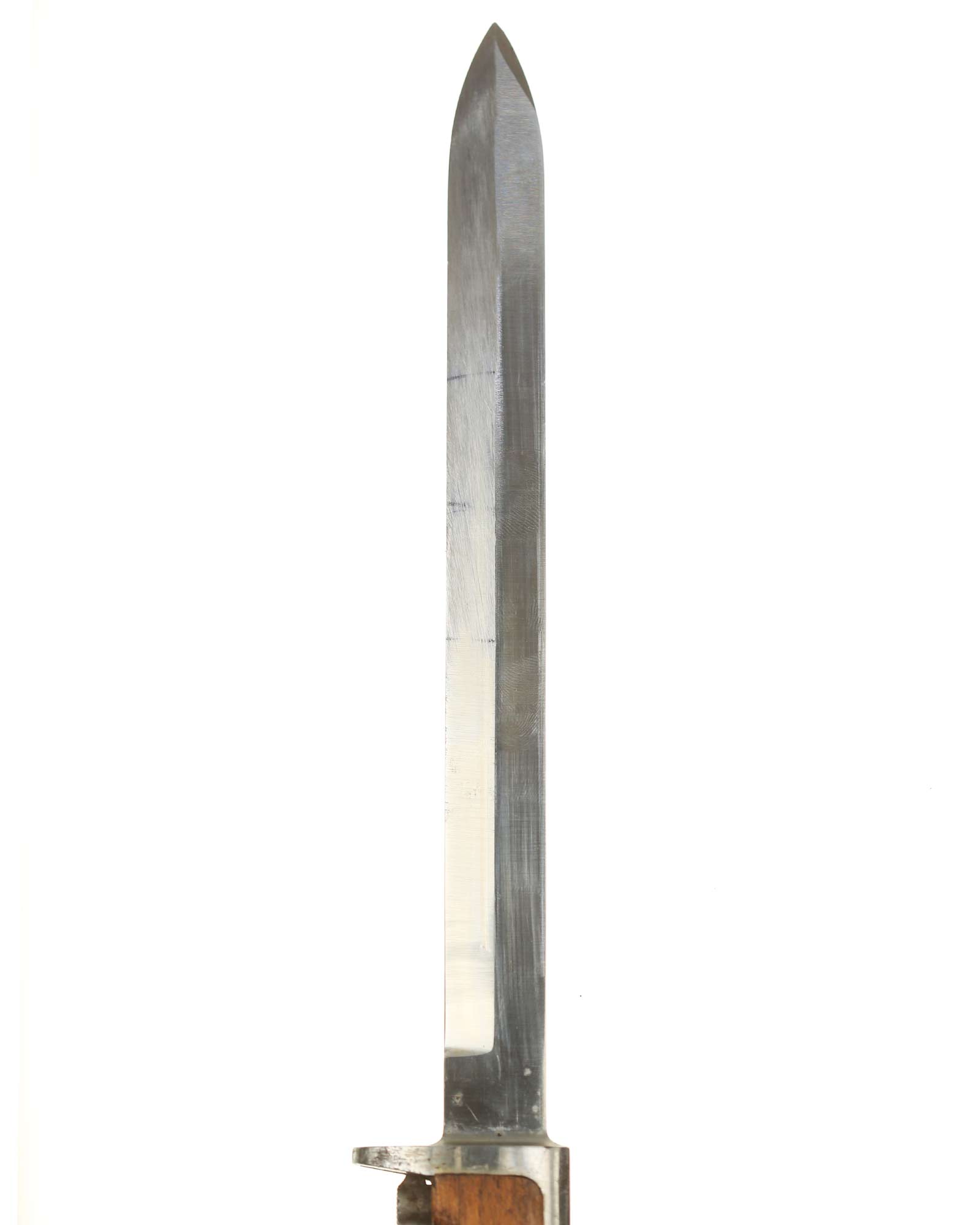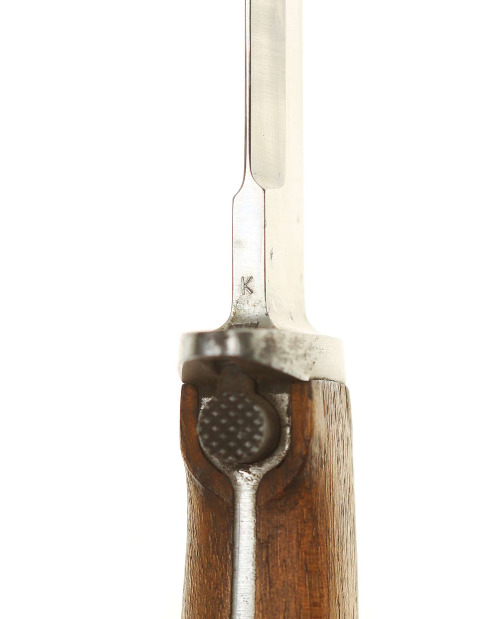 Норвежский штык M 1894 для винтовки Krag-Jörgensen. На клинке имеется клеймо изготовителя. На пиноли и ножнах имеется соответствующий номер 69449. Обе деревянные шкалы рукояти в хорошем состоянии. Клинок чистый. Ножны имеют оригинальное лаковое покрытие.