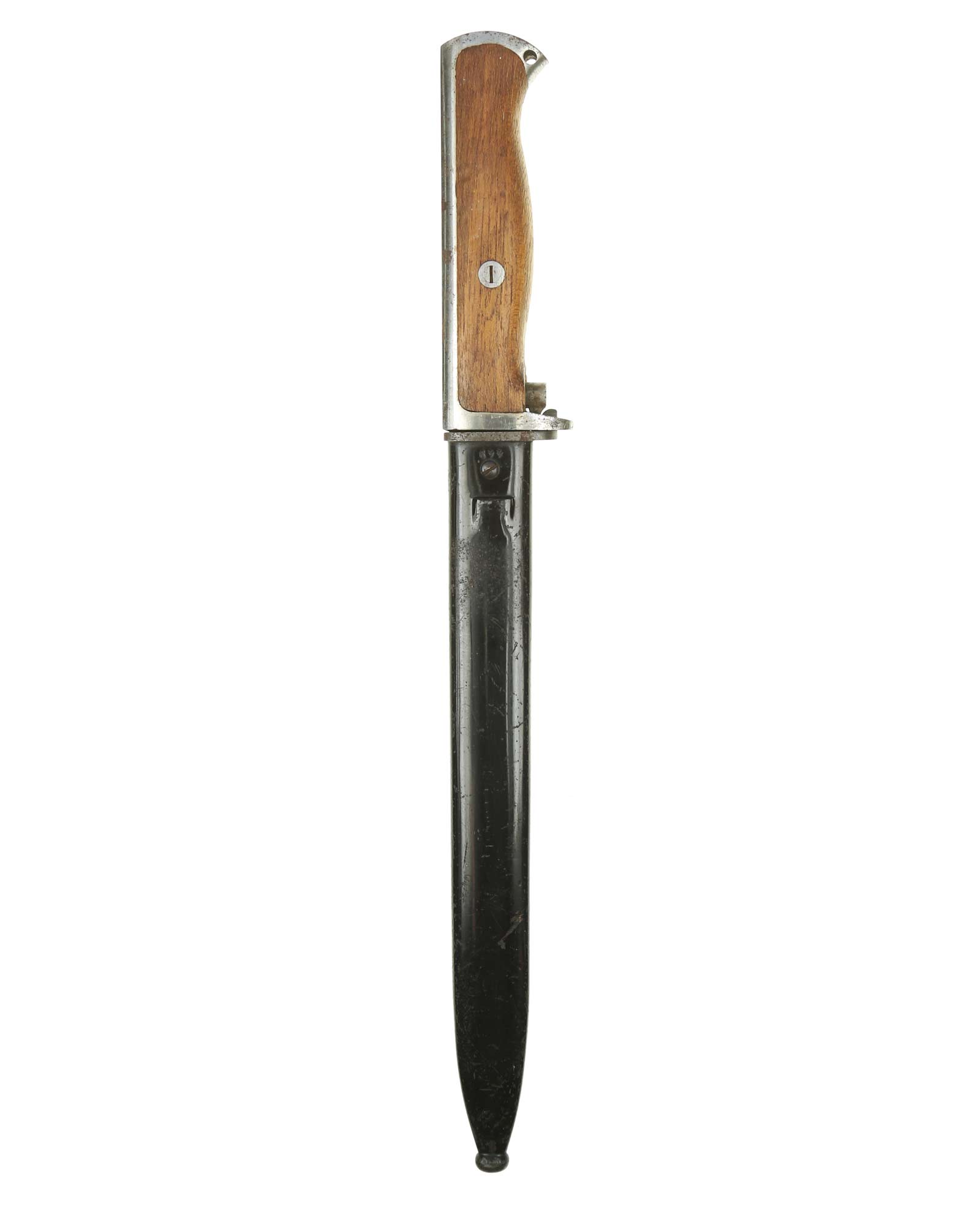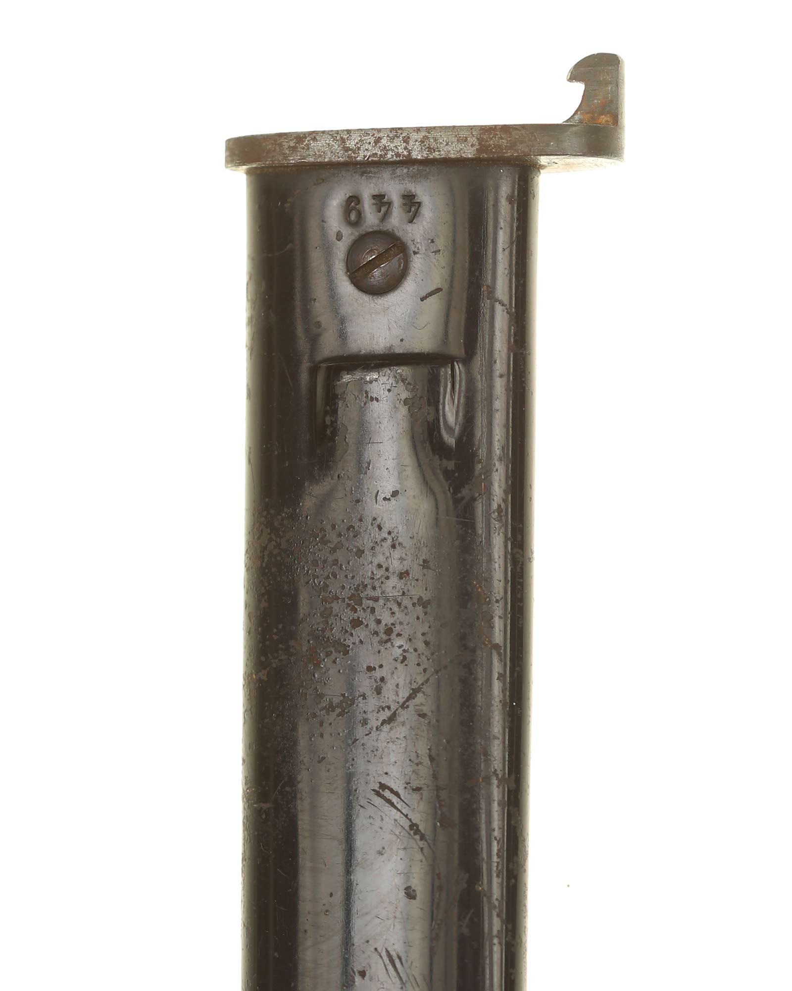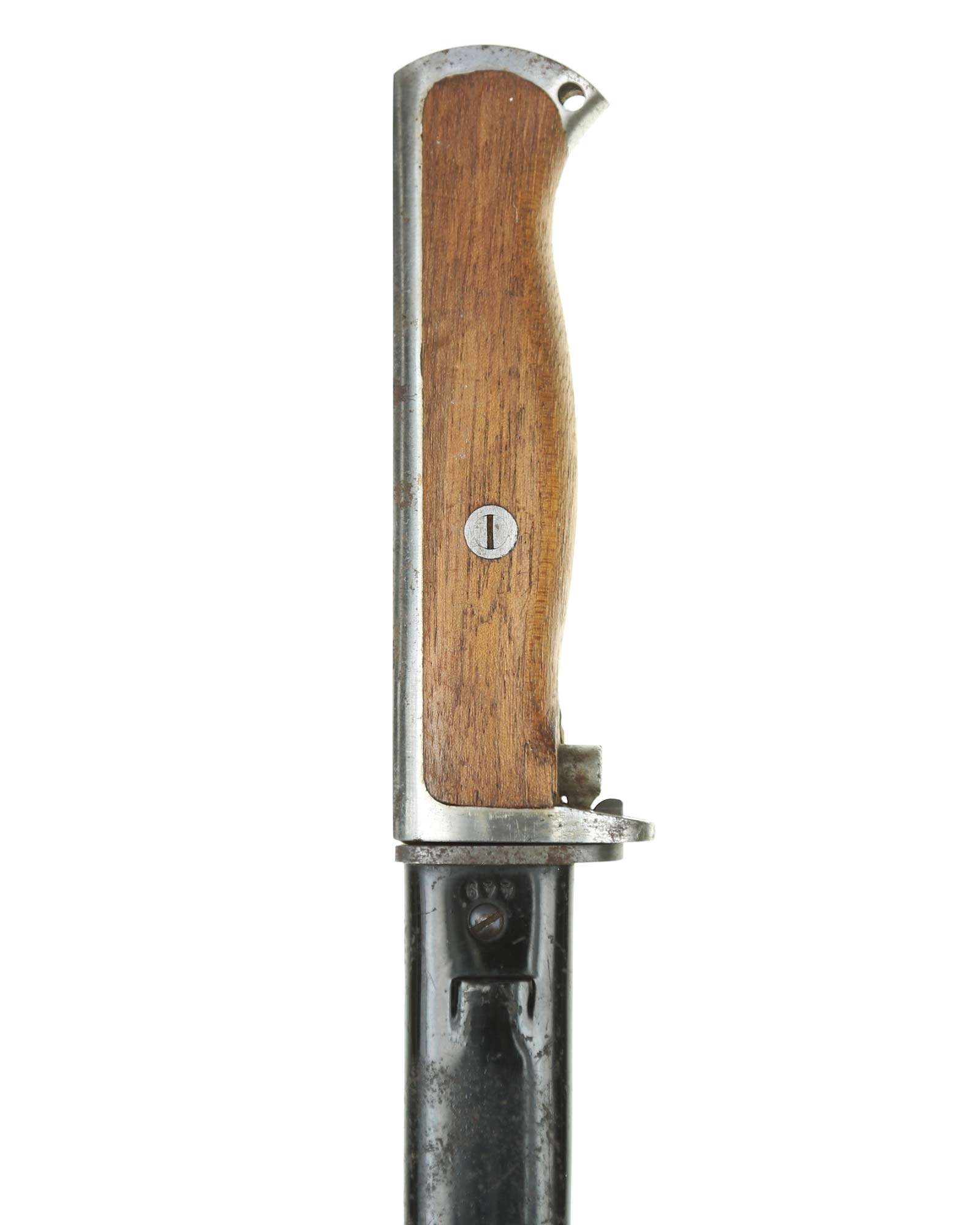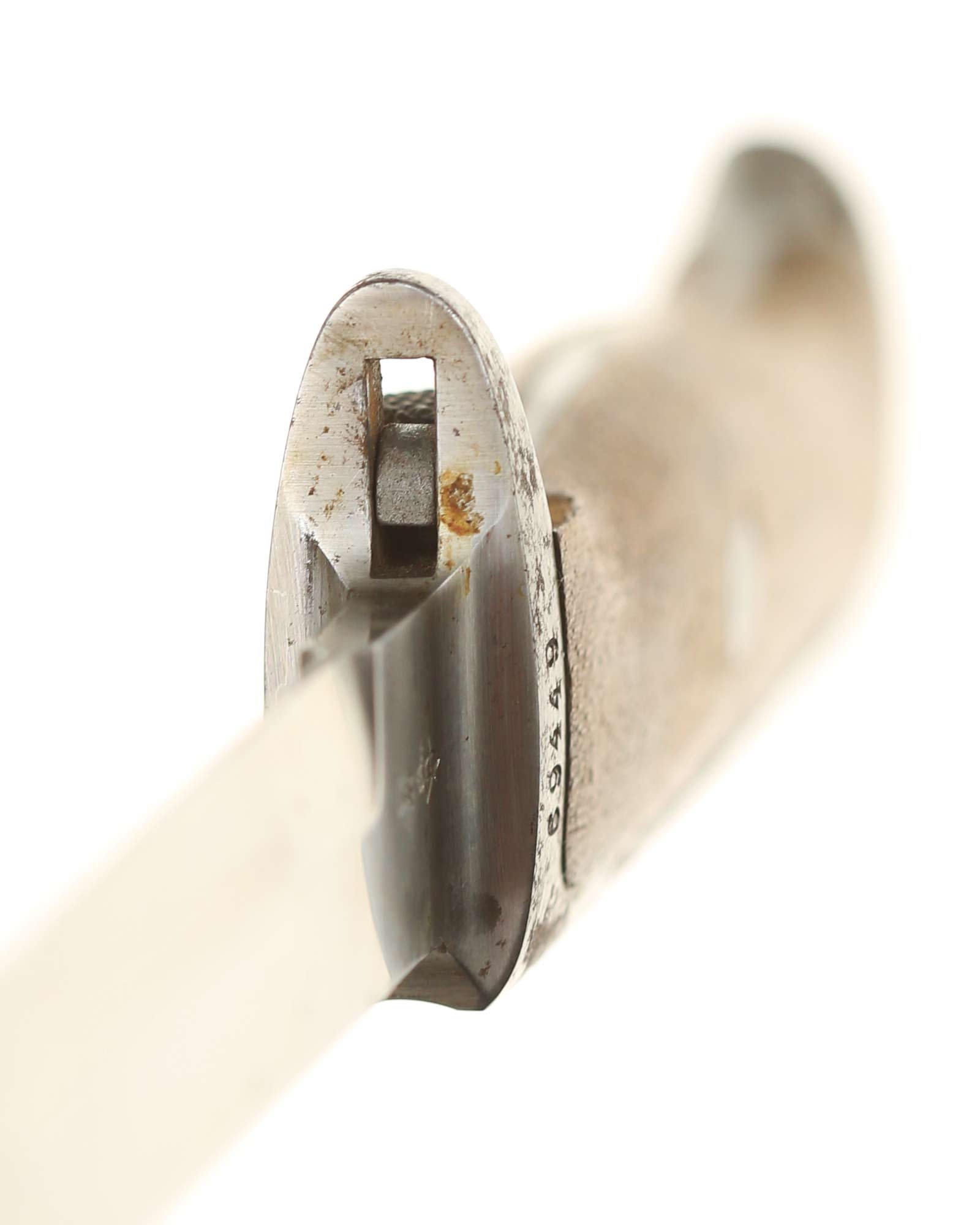 Норвежский штык M 1894 для винтовки Krag-Jörgensen. На клинке имеется клеймо изготовителя. На пиноли и ножнах имеется соответствующий номер 69449. Обе деревянные шкалы рукояти в хорошем состоянии. Клинок чистый. Ножны имеют оригинальное лаковое покрытие.